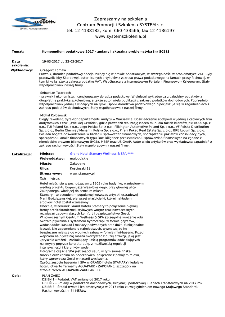 Zapraszamy na szkolenia Centrum Promocji i Szkolenia SYSTEM s.c. tel. 12 4138182, kom. 660 433566, fax 12 4136197 www.systemszkolenia.pl Temat: Kompendium podatkowe 2017 - zmiany i aktualna problematyka [nr 5021] Data szkolenia: 19-03-2017 do 22-03-2017 Wykładowcy: Grzegorz GrzegorzTomala Tomala Prawnik, Prawnik,doradca doradcapodatkowy podatkowyspecjalizujący specjalizującysię sięwwprawie prawiepodatkowym, podatkowym,wwszczególności szczególnościwwproblematyce problematyceVAT. VAT.Były Były pracownik pracownikIzby IzbySkarbowej, Skarbowej,autor autorlicznych licznychartykułów artykułówzzzakresu zakresuprawa prawapodatkowego podatkowegona nałamach łamachprasy prasyfachowej, fachowej,ww tym tymkilku kilkuksiążek książekzzzakresu zakresupodatku podatkuVAT. VAT.Współpracuje Współpracujezzinternetowym internetowymPortalem PortalemFinansowo Finansowo– –Księgowym. Księgowym.Stały Stały współpracownik współpracowniknaszej naszejfirmy. firmy. Sebastian SebastianTwardoch Twardoch - -prawnik prawniki iekonomista, ekonomista,licencjonowany licencjonowanydoradca doradcapodatkowy. podatkowy.Wieloletni Wieloletniwykładowca wykładowcazzdziedziny dziedzinypodatków podatkówzz długoletnią długoletniąpraktyką praktykąszkoleniową, szkoleniową,aatakże takżeautor autorwielu wielupublikacji publikacjizzzakresu zakresupodatków podatkówdochodowych. dochodowych.Poprzednio Poprzednio współpracownik współpracownikjednej jednejzzwiodących wiodącychna narynku rynkuspółki spółkidoradztwa doradztwapodatkowego. podatkowego.Specjalizuje Specjalizujesię sięwwzagadnieniach zagadnieniachzz zakresu zakresupodatków podatkówdochodowych. dochodowych.Stały Staływspółpracownik współpracowniknaszej naszejfirmy. firmy. Michał MichałKołosowski Kołosowski Biegły Biegłyrewident, rewident,dyrektor dyrektordepartamentu departamentuaudytu audytuwwWarszawie. Warszawie.Doświadczenie Doświadczeniezdobywał zdobywałwwjednej jednejzzczołowych czołowychfirm firm audytorskich audytorskichzztzw. tzw.„Wielkiej „WielkiejCzwórki”, Czwórki”,gdzie gdzieprowadził prowadziłrealizację realizacjęzleceń zleceńm.in. m.in.dla dlatakich takichklientów klientówjak: jak:BOLS BOLSSp. Sp.zz o.o., o.o.,TUI TUIPoland PolandSp. Sp.zzo.o., o.o.,Lego LegoPolska PolskaSp. Sp.zzo.o., o.o.,Pilkington PilkingtonAutomotive AutomotivePoland PolandSp. Sp.zzo.o., o.o.,VF VFPolska PolskaDistribution Distribution Sp. Sp.zzo.o., o.o.,Berlin BerlinChemie Chemie/ /Menarini MenariniPolska PolskaSp. Sp.zzo.o., o.o.,Pirelli PirelliPekao PekaoReal RealEstate EstateSp. Sp.zzo.o., o.o.,BRE BRELocum LocumSp. Sp.zzo.o. o.o. Posiada Posiadabogate bogatedoświadczenie doświadczeniewwbadaniu badaniusprawozdań sprawozdańfinansowych, finansowych,sporządzaniu sporządzaniupakietów pakietówkonsolidacyjnych, konsolidacyjnych, sporządzaniu sporządzaniuanaliz analizfinansowych finansowychtypu typuDue DueDiligence Diligenceprzekształcaniu przekształcaniusprawozdań sprawozdańfinansowych finansowychna nazgodne zgodnezz niemieckim niemieckimprawem prawembilansowym bilansowym(HGB), (HGB),MSSF MSSForaz orazUS USGAAP. GAAP.Autor Autorwielu wieluartykułów artykułóworaz orazwykładowca wykładowcazagadnień zagadnieńzz zakresu zakresurachunkowości. rachunkowości.Stały Staływspółpracownik współpracowniknaszej naszejfirmy. firmy. Lokalizacja: Miejsce: Grand Hotel Stamary Wellness && SPA **** Miejsce: Grand Hotel Stamary Wellness SPA **** Województwo: Województwo: małopolskie małopolskie Miasto: Zakopane Miasto: Zakopane Ulica: Ulica: Strona www: Strona www: Kościuszki 1919 Kościuszki www.stamary.pl www.stamary.pl Opis miejsca: Opis miejsca: Hotel mieści sięsię ww pochodzącym z 1905 roku budynku, wzniesionym Hotel mieści pochodzącym z 1905 roku budynku, wzniesionym według projektu Eugeniusza Wesołowskiego, przy głównej ulicy według projektu Eugeniusza Wesołowskiego, przy głównej ulicy Zakopanego, wiodącej dodo centrum miasta. Zakopanego, wiodącej centrum miasta. Stamary - to pseudonim popularnej wówczas artystki estradowej Stamary - to pseudonim popularnej wówczas artystki estradowej Marii Budziszewskiej, pierwszej właścicielki, której nakładem Marii Budziszewskiej, pierwszej właścicielki, której nakładem środków hotel został wzniesiony. środków hotel został wzniesiony. Obecnie, wizerunek Grand Hotelu Stamary toto połączenie pięknej Obecnie, wizerunek Grand Hotelu Stamary połączenie pięknej formy architektonicznej, stylowych wnętrz oraz nowoczesnych formy architektonicznej, stylowych wnętrz oraz nowoczesnych rozwiązań zapewniających komfort i bezpieczeństwo Gości. rozwiązań zapewniających komfort i bezpieczeństwo Gości. WW nowoczesnym Centrum Wellness && SPA szczególne wrażenie robi nowoczesnym Centrum Wellness SPA szczególne wrażenie robi okazała pływalnia z systemem hydroterapii ww formie gejzerów, okazała pływalnia z systemem hydroterapii formie gejzerów, wodospadów, kaskad i masaży podwodnych oraz duże, funkcjonalne wodospadów, kaskad i masaży podwodnych oraz duże, funkcjonalne jacuzzi. Nie zapomniano o najmłodszych, wyznaczając imim jacuzzi. Nie zapomniano o najmłodszych, wyznaczając bezpieczne miejsce dodo wodnych zabaw ww formie mini-basenu. Przed bezpieczne miejsce wodnych zabaw formie mini-basenu. Przed wejściem nana pływalnię można skorzystać z dużej atrakcji, jaką jest wejściem pływalnię można skorzystać z dużej atrakcji, jaką jest „prysznic wrażeń”, zaskakujący ilością programów oddziałujących „prysznic wrażeń”, zaskakujący ilością programów oddziałujących nana zmysły poprzez koloroterapię, z możliwością regulacji zmysły poprzez koloroterapię, z możliwością regulacji intensywności i kierunków wody. intensywności i kierunków wody. Integralną częścią SPA jest zespół saun, ww tym sauna fińska i i Integralną częścią SPA jest zespół saun, 