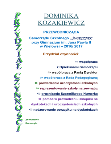 DOMINIKA KOZAKIEWICZ PRZEWODNICZĄCA Samorządu Szkolnego „ŚWIECZNIK” przy Gimnazjum im. Jana Pawła II w Wielowsi – 2016/ 2017 Przydział czynności: współpraca z Opiekunami Samorządu współpraca z Panią Dyrektor współpraca z Radą Pedagogiczną prowadzenie uroczystości szkolnych reprezentowanie szkoły na zewnątrz organizacja Szczęśliwego Numerka pomoc w prowadzeniu sklepiku na dyskotekach i uroczystościach szkolnych nadzorowanie porządku na dyskotekach Opiekunowie Samorządu JAQUELINE WIENCHOL VICE – PRZEWODNICZĄCA Samorządu Szkolnego „ŚWIECZNIK” przy Gimnazjum im. Jana Pawła II w Wielowsi – 2016/ 2017 Przydział czynności: współpraca z Opiekunami Samorządu współpraca z Panią Dyrektor współpraca z Radą Pedagogiczną nadzorowanie porządku na dyskotekach prowadzenie uroczystości szkolnych reprezentowanie szkoły na zewnątrz prowadzenie list samorządowych organizowanie akcji samorządowych Opiekunowie Samorządu MONIKA DORSZ SEKRETARZ Samorządu Szkolnego „ŚWIECZNIK” przy Gimnazjum im. Jana Pawła II w Wielowsi – 2016/ 17 Przydział czynności: współpraca z Opiekunami Samorządu współpraca z Panią Dyrektor współpraca z Radą Pedagogiczną nadzorowanie porządku na dyskotekach redagowanie notatek z uroczystości szkolnych prowadzenie list samorządowych Opiekunowie Samorządu AGNIESZKA ZUBER KRONIKARZ Samorządu Szkolnego „ŚWIECZNIK” przy Gimnazjum im. Jana Pawła II w Wielowsi – 2016/ 2017 Przydział czynności: współpraca z Opiekunami Samorządu współpraca z Panią Dyrektor współpraca z Radą Pedagogiczną prowadzenie kroniki samorządowej współorganizowanie akcji samorządowych pomoc w prowadzeniu sklepiku na dyskotekach i uroczystościach szkolnych Opiekunowie Samorządu KAROLINA DRZENSLA SKARBNIK Samorządu Szkolnego „ŚWIECZNIK” przy Gimnazjum im. Jana Pawła II w Wielowsi – 2016/ 2017 Przydział czynności: współorganizowanie akcji samorządowych współpraca z Opiekunami Samorządu zbieranie wpłat od skarbników klasowych zbieranie składek na dyskotekach prowadzenie list samorządowych pomoc w prowadzeniu sklepiku na dyskotekach i uroczystościach szkolnych Opiekunowie Samorządu JUSTYNA PODKOWA OPIEKA NAD GAZETKAMI Samorządu Szkolnego „ŚWIECZNIK” przy Gimnazjum im. Jana Pawła II w Wielowsi – 2015/ 2016 Przydział czynności: dbanie o ład i estetykę gazetek szkolnych współpraca z Opiekunami Samorządu prowadzenie list samorządowych współorganizacja akcji charytatywnych pomoc w prowadzeniu sklepiku na dyskotekach i uroczystościach szkolnych Opiekunowie Samorządu VANESSA FELUKS DYŻURY UCZNIOWSKIE Samorządu Szkolnego „ŚWIECZNIK” przy Gimnazjum im. Jana Pawła II w Wielowsi – 2016/ 2017 Przydział czynności: udział w organizowaniu akcji samorządowych współpraca z Opiekunami Samorządu organizowanie i nadzorowanie dyżurów samorządowych nadzorowanie porządku na dyskotekach sprawy organizacyjne prowadzenie list samorządowych Opiekunowie Samorządu JAKUB GIERSZ Manager sprzętu nagłośnieniowego Samorządu Szkolnego „ŚWIECZNIK” przy Gimnazjum im. Jana Pawła II w Wielowsi – 2016/ 2017 Przydział czynności: współpraca z Opiekunami Samorządu współpraca z Radą Pedagogiczną organizowanie życia pozalekcyjnego dbanie o poprawność działania sprzętu zbieranie informacji i materiałów z klas do programów artystycznych współpraca z wszystkimi członkami samorządu Opiekunowie Samorządu SYLWIA SAMOLIK SPRAWOZDANIA Samorządu Szkolnego „ŚWIECZNIK” przy Gimnazjum im. Jana Pawła II w Wielowsi – 2016/ 2017 Przydział czynności: udział w organizowaniu akcji samorządowych współpraca z Opiekunami Samorządu nadzorowanie porządku na dyskotekach gromadzenie notatek z życia szkoły prowadzenie list samorządowych Opiekunowie Samorządu KACPER KNOPIK pomoc przy sprzęcie nagłośnieniowym w Samorządzie Szkolnyn „ŚWIECZNIK” przy Gimnazjum im. Jana Pawła II w Wielowsi – 2016/ 2017 Przydział czynności: współpraca z Opiekunami Samorządu współpraca z Radą Pedagogiczną pomoc w organizowaniu nagłośnienia na uroczystościach szkolnych dbanie o poprawność działania sprzętu zbieranie informacji i materiałów z klas współpraca z wszystkimi członkami samorządu Opiekunowie Samorząd KAMIL FILOZOF pomoc przy sprzęcie nagłośnieniowym w Samorządzie Szkolnyn „ŚWIECZNIK” przy Gimnazjum im. Jana Pawła II w Wielowsi – 2016/ 2017 Przydział czynności: współpraca z Opiekunami Samorządu współpraca z Radą Pedagogiczną pomoc w organizowaniu nagłośnienia na uroczystościach szkolnych dbanie o poprawność działania sprzętu zbieranie informacji i materiałów z klas współpraca z wszystkimi członkami samorządu Opiekunowie Samorządu