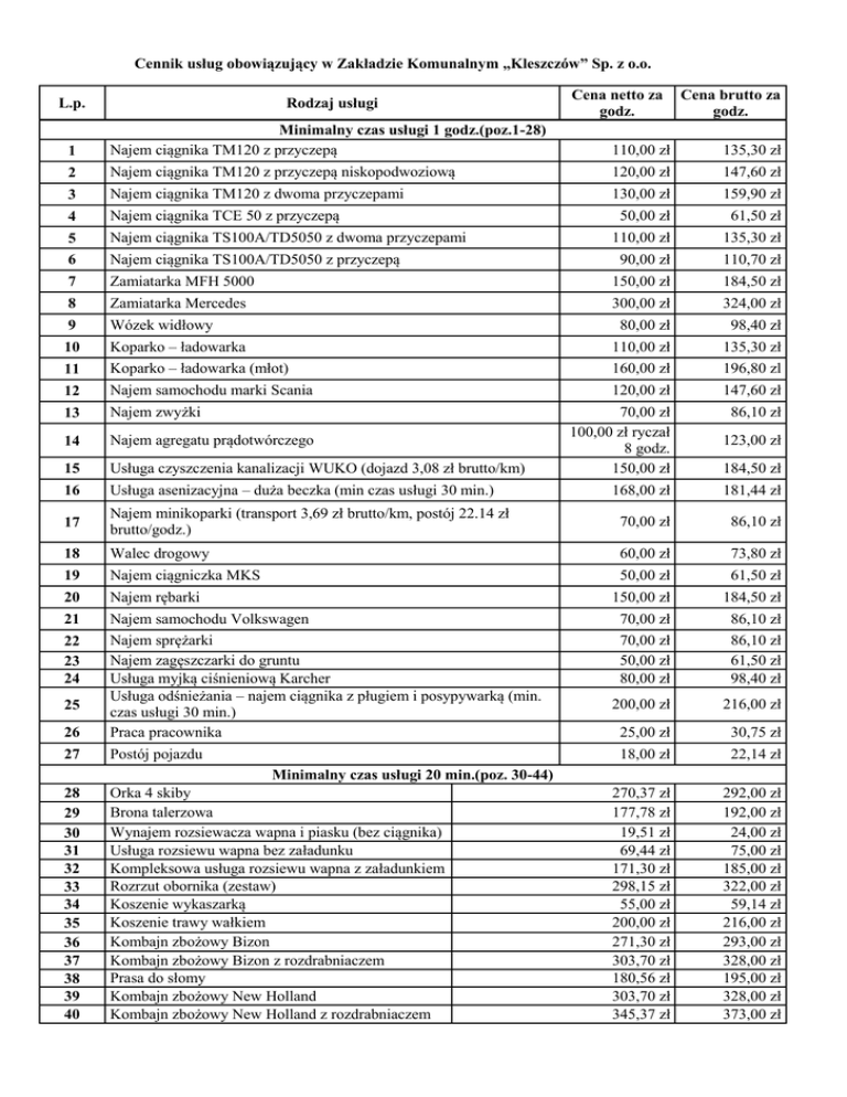 Cennik usług obowiązujący w Zakładzie Komunalnym „Kleszczów” Sp. z o.o. Cena netto za godz. Cena brutto za godz. L.p. Rodzaj usługi 1 Minimalny czas usługi 1 godz.(poz.1-28) Najem ciągnika TM120 z przyczepą 110,00 zł 135,30 zł 2 Najem ciągnika TM120 z przyczepą niskopodwoziową 120,00 zł 147,60 zł 3 Najem ciągnika TM120 z dwoma przyczepami 130,00 zł 159,90 zł 4 Najem ciągnika TCE 50 z przyczepą 50,00 zł 61,50 zł 5 Najem ciągnika TS100A/TD5050 z dwoma przyczepami 110,00 zł 135,30 zł 6 Najem ciągnika TS100A/TD5050 z przyczepą 90,00 zł 110,70 zł 7 Zamiatarka MFH 5000 150,00 zł 184,50 zł 8 Zamiatarka Mercedes 300,00 zł 324,00 zł 9 Wózek widłowy 80,00 zł 98,40 zł 10 Koparko – ładowarka 110,00 zł 135,30 zł 11 Koparko – ładowarka (młot) 160,00 zł 196,80 zl 12 Najem samochodu marki Scania 120,00 zł 147,60 zł 13 Najem zwyżki 86,10 zł 14 Najem agregatu prądotwórczego 123,00 zł 15 Usługa czyszczenia kanalizacji WUKO (dojazd 3,08 zł brutto/km) 70,00 zł 100,00 zł ryczał 8 godz. 150,00 zł 16 Usługa asenizacyjna – duża beczka (min czas usługi 30 min.) 168,00 zł 181,44 zł 17 Najem minikoparki (transport 3,69 zł brutto/km, postój 22.14 zł brutto/godz.) 70,00 zł 86,10 zł 18 Walec drogowy 60,00 zł 73,80 zł 19 Najem ciągniczka MKS 50,00 zł 61,50 zł 20 Najem rębarki 150,00 zł 184,50 zł 21 Najem samochodu Volkswagen 70,00 zł 86,10 zł 22 23 24 70,00 zł 50,00 zł 80,00 zł 86,10 zł 61,50 zł 98,40 zł 200,00 zł 216,00 zł 26 Najem sprężarki Najem zagęszczarki do gruntu Usługa myjką ciśnieniową Karcher Usługa odśnieżania – najem ciągnika z pługiem i posypywarką (min. czas usługi 30 min.) Praca pracownika 25,00 zł 30,75 zł 27 Postój pojazdu 18,00 zł 22,14 zł 270,37 zł 177,78 zł 19,51 zł 69,44 zł 171,30 zł 298,15 zł 55,00 zł 200,00 zł 271,30 zł 303,70 zł 180,56 zł 303,70 zł 345,37 zł 292,00 zł 192,00 zł 24,00 zł 75,00 zł 185,00 zł 322,00 zł 59,14 zł 216,00 zł 293,00 zł 328,00 zł 195,00 zł 328,00 zł 373,00 zł 25 184,50 zł Minimalny czas usługi 20 min.(poz. 30-44) 28 29 30 31 32 33 34 35 36 37 38 39 40 Orka 4 skiby Brona talerzowa Wynajem rozsiewacza wapna i piasku (bez ciągnika) Usługa rozsiewu wapna bez załadunku Kompleksowa usługa rozsiewu wapna z załadunkiem Rozrzut obornika (zestaw) Koszenie wykaszarką Koszenie trawy wałkiem Kombajn zbożowy Bizon Kombajn zbożowy Bizon z rozdrabniaczem Prasa do słomy Kombajn zbożowy New Holland Kombajn zbożowy New Holland z rozdrabniaczem