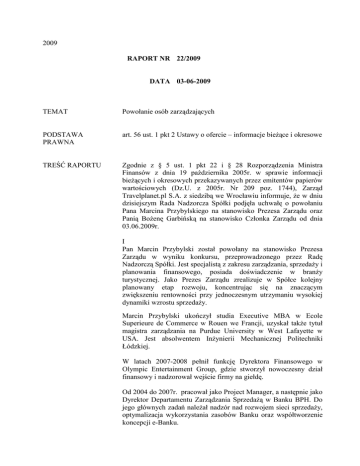 2009 RAPORT NR 22/2009 DATA 03-06-2009 TEMAT Powołanie osób zarządzających PODSTAWA PRAWNA art. 56 ust. 1 pkt 2 Ustawy o ofercie – informacje bieŜące i okresowe TREŚĆ RAPORTU Zgodnie z § 5 ust. 1 pkt 22 i § 28 Rozporządzenia Ministra Finansów z dnia 19 października 2005r. w sprawie informacji bieŜących i okresowych przekazywanych przez emitentów papierów wartościowych (Dz.U. z 2005r. Nr 209 poz. 1744), Zarząd Travelplanet.pl S.A. z siedzibą we Wrocławiu informuje, Ŝe w dniu dzisiejszym Rada Nadzorcza Spółki podjęła uchwałę o powołaniu Pana Marcina Przybylskiego na stanowisko Prezesa Zarządu oraz Panią BoŜenę Garbińską na stanowisko Członka Zarządu od dnia 03.06.2009r. I Pan Marcin Przybylski został powołany na stanowisko Prezesa Zarządu w wyniku konkursu, przeprowadzonego przez Radę Nadzorczą Spółki. Jest specjalistą z zakresu zarządzania, sprzedaŜy i planowania finansowego, posiada doświadczenie w branŜy turystycznej. Jako Prezes Zarządu zrealizuje w Spółce kolejny planowany etap rozwoju, koncentrując się na znaczącym zwiększeniu rentowności przy jednoczesnym utrzymaniu wysokiej dynamiki wzrostu sprzedaŜy. Marcin Przybylski ukończył studia Executive MBA w Ecole Superieure de Commerce w Rouen we Francji, uzyskał takŜe tytuł magistra zarządzania na Purdue University w West Lafayette w USA. Jest absolwentem InŜynierii Mechanicznej Politechniki Łódzkiej. W latach 2007-2008 pełnił funkcję Dyrektora Finansowego w Olympic Entertainment Group, gdzie stworzył nowoczesny dział finansowy i nadzorował wejście firmy na giełdę. Od 2004 do 2007r. pracował jako Project Manager, a następnie jako Dyrektor Departamentu Zarządzania SprzedaŜą w Banku BPH. Do jego głównych zadań naleŜał nadzór nad rozwojem sieci sprzedaŜy, optymalizacja wykorzystania zasobów Banku oraz współtworzenie koncepcji e-Banku. W latach 1998-2003 pełnił funkcję Dyrektora Finansowego i Członka Zarządu EMI Poland oraz Dyrektora Zarządzającego międzynarodowej kancelarii prawniczej Linklaters. Od 1997 do 1998r. pracował jako Senior Associate Consultant w BOSTON CONSULTING GROUP, gdzie opracował strategię rozwoju w Europie Środkowej i Wschodniej dla wiodącego producenta płyt drewnopochodnych oraz zarządzał zespołami PMI przygotowującymi integrację firm po fuzji. W latach 1992–1996 pracował w Pepsi-Cola International, Procter & Gamble jako Planista i Analityk Finansowy, następnie awansował na stanowisko Wicedyrektora ds. Operacji Skarbowych w PepsiCo., gdzie był odpowiedzialny za transakcje typu SWAP, emisje papierów wartościowych oraz budŜetowanie, prognozowanie i konsolidację danych z centralą. Nadzorował wprowadzanie procedur GAAP, stworzył i rozwinął złoŜone systemy słuŜące do analiz finansowych, w tym narzędzie FOREX i arkusze dochodowości linii produktowych. Ponadto w latach 1986 – 1991 pracował w Studenckim Biurze PodróŜy Almatur, a następnie Biurze Turystycznym Grand Tour jako pilot wycieczek zagranicznych, uprawniony do prowadzenia grup w języku polskim, angielskim, rosyjskim i francuskim. Zgodnie ze złoŜonym oświadczeniem Pan Marcin Przybylski nie wykonuje Ŝadnej działalności konkurencyjnej w stosunku do działalności Spółki, nie jest wspólnikiem w konkurencyjnej spółce cywilnej ani spółce osobowej, a takŜe nie jest członkiem organu spółki kapitałowej ani członkiem organu jakiejkolwiek innej konkurencyjnej osoby prawnej. Nie figuruje w Rejestrze DłuŜników Niewypłacalnych, prowadzonym na podstawie Ustawy o KRS. II Pani BoŜena Garbińska, powołana na stanowisko Członka Zarządu ds. Finansowych, jest specjalistą z zakresu finansów. Ukończyła Wydział Zarządzania i Informatyki na Akademii Ekonomicznej we Wrocławiu. W 2001r. uzyskała tytuł Biegłego Rewidenta nr 9594/7164. Od 2003r. jest Studentką The Association of Chartered Certified Accountants. Pani BoŜena Garbińska od stycznia 2007r. jest zatrudniona w Travelplanet.pl SA na stanowisku Dyrektora Finansowego, a od końca marca 2007r. pełniła funkcję Prokurenta. W latach 2001-2006 Pani Garbińska pracowała w Agencji Konsultingu i Audytingu Gospodarczego “Accord’ab” Spółka z o.o. jako Sekretarz Rady Nadzorczej, a następnie jako Audytor. Odpowiadała za badanie sprawozdań finansowych (w latach 2002- 2005 ogółem 75 jednostek, w tym branŜy energetycznej, paliwowej, farmaceutycznej, budowlanej, przemysłowej), przegląd sprawozdań finansowych sporządzonych zgodnie z MSR (bank w Rosji oraz spółka leasingowa w Rosji) oraz due diligence spółek finansowych. Przeprowadzała audyt projektów finansowanych z dotacji Unii Europejskiej, przygotowywała opracowania polityki rachunkowości dla spółek branŜy spoŜywczej, energetycznej i przemysłowej. W latach 1992 – 2002 jako aplikant brała udział w badaniu sprawozdań finansowych (w latach 1998-2001, ogółem w 73 jednostkach, w tym spółek leasingowych, towarzystw ubezpieczeniowych, funduszy inwestycyjnych, spółek branŜy budowlanej, papierniczej, spoŜywczej, handlowych), prowadziła księgi rachunkowe spółek handlowych, współtworzyła opracowania prospektów emisyjnych (dotyczące rozdziału „Sprawozdania finansowe”), memorandów informacyjnych oraz 40 analiz ekonomiczno-finansowych, w tym dla Ministerstwa Skarbu Państwa. Zgodnie ze złoŜonym oświadczeniem Pani BoŜena Garbińska nie wykonuje Ŝadnej działalności konkurencyjnej w stosunku do działalności Spółki, nie jest wspólnikiem w konkurencyjnej spółce cywilnej ani spółce osobowej, a takŜe nie jest członkiem organu spółki kapitałowej ani członkiem organu jakiejkolwiek innej konkurencyjnej osoby prawnej. Nie figuruje w Rejestrze DłuŜników Niewypłacalnych, prowadzonym na podstawie Ustawy o KRS. ZAŁĄCZNIKI brak