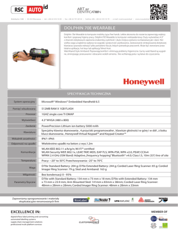 Białołęcka 158E • 03-253 Warszawa • tel.: +48 22 510 14 40 • fax: +48 22 741 69 33 • hotline 24h: +48 22 510 14 79 • e-mail: [email protected] • www.rscautoid.pl DOLPHIN 70E WEARABLE Dolphin 70e Wearable to komputer mobilny typu free hands. Lekkie akcesoria do noszenia zapewniają większy komfort i poprawę higieny pracy. Dolphin70E Wearable to komputer wielozadaniowy. Duży wyświetlacz 4.3” z ekranem dotykowym zapewnia znakomitą czytelność i dużo miejsca zarówno na klawiaturę jak i dane. Niewielka waga urządzenia wpływa na wygodę i poręczność użytkowania. Zastosowanie zintegrowanej dotykowej klawiatury pozwala wdrożyć tylko potrzebne klucze, któych potrzebuje pracownik. Może być sterowane przez lokalne aplikacje, hot keys lub aplikację Telnet Host. Watchband Style Armband: Poprawiają komfort i eliminują problemy higieniczne. Gumy watchband są wygodne, zmniejszając przesuwanie i obracanie wokół ramienia. Nie wchłaniają potu i są łatwe do czyszczenia. SPECYFIKACJA TECHNICZNA System operacyjny Microsoft® Windows® Embedded Handheld 6.5 Pamięć wbudowana 512MB RAM X 1GB FLASH Procesor 1GHZ single core TI OMAP Wyświetlacz Zasilanie Klawiatura 4.3” WVGA (480 x 800) PowerPrecision Lithium ion battery 5000 mAh Specjalny klawisz skanowania , 4 przyciski programowalne , klawisze głośności w górę i w dół , z boku klucz skanowania , Honeywell Virtual Keypad™ and Keypad Creator™ Wskaźnik szczelności IP67 i IP65 Odporność na upadki Wielokrotne upadki na beton: z wys.1.2m Komunikacja WLAN IEEE 802.11 a/b/g/n; Wi-Fi™ certified WLAN Security WEP, 802.1x, LEAP, TKIP, MD5, EAP-TLS, WPA-PSK, WPA v2.0, PEAP, CCXv4 WPAN 2.4 GHz (ISM Band) Adaptive „frequency hopping” Bluetooth® v4.0; Class I.5, 10m (33’) line of site Temperatura Pracy: --20° to 50°C Przechowywania: -25° to 70°C Waga Wilgotność Parametry fizyczne D70e Standard Battery: 204 g; D70e Extended Battery: 244 g; Corded Laser Ring Scanner: 65 g; Corded Imager Ring Scanner: 79 g; Sled and Armband: 163 g Bez kondensacji 0 - 95% D70e with Standard Battery: 134 mm x 73 mm x 18 mm; D70e with Extended Battery: 134 mm x 73 mm x 23.9 mm; Arm Mounted Sled: 141mm x 83mm x 38mm; Corded Laser Ring Scanner: 48mm x 28mm x 28mm; Corded Imager Ring Scanner: 48mm x 28mm x 33mm Zapewniamy oprogramowanie i materiały eksploatacyjne renomowanych firm EXCELLENCE IN: digital & flexo label printing and converting automated labelling systems supply chain management solutions professional multi-platform services MEMBER OF