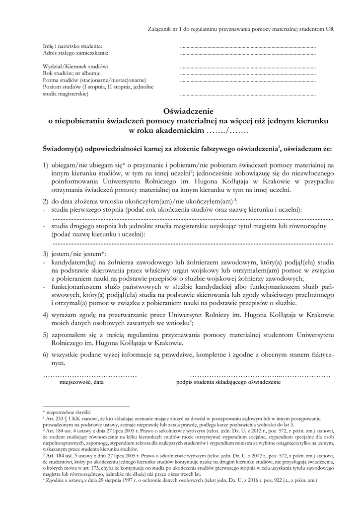 Załącznik nr 1 do regulaminu przyznawania pomocy materialnej studentom UR Imię i nazwisko studenta: Adres stałego zamieszkania: ........................................................................................................ ........................................................................................................ Wydział/Kierunek studiów: Rok studiów; nr albumu: Forma studiów (stacjonarne/niestacjonarne) Poziom studiów (I stopnia, II stopnia, jednolite studia magisterskie) ........................................................................................................ ........................................................................................................ ........................................................................................................ ........................................................................................................ Oświadczenie o niepobieraniu świadczeń pomocy materialnej na więcej niż jednym kierunku w roku akademickim ……./……. Świadomy(a) odpowiedzialności karnej za złożenie fałszywego oświadczenia1, oświadczam że: 1) ubiegam/nie ubiegam się* o przyznanie i pobieram/nie pobieram świadczeń pomocy materialnej na innym kierunku studiów, w tym na innej uczelni2; jednocześnie zobowiązuję się do niezwłocznego poinformowania Uniwersytetu Rolniczego im. Hugona Kołłątaja w Krakowie w przypadku otrzymania świadczeń pomocy materialnej na innym kierunku w tym na innej uczelni. 2) do dnia złożenia wniosku ukończyłem(am)/nie ukończyłem(am) 3: - studia pierwszego stopnia (podać rok ukończenia studiów oraz nazwę kierunku i uczelni): ................................................................................................................................................................................ - studia drugiego stopnia lub jednolite studia magisterskie uzyskując tytuł magistra lub równorzędny (podać nazwę kierunku i uczelni): ................................................................................................................................................................................ 3) jestem/nie jestem*: - kandydatem(ką) na żołnierza zawodowego lub żołnierzem zawodowym, który(a) podjął(eła) studia na podstawie skierowania przez właściwy organ wojskowy lub otrzymałem(am) pomoc w związku z pobieraniem nauki na podstawie przepisów o służbie wojskowej żołnierzy zawodowych; - funkcjonariuszem służb państwowych w służbie kandydackiej albo funkcjonariuszem służb państwowych, który(a) podjął(eła) studia na podstawie skierowania lub zgody właściwego przełożonego i otrzymał(a) pomoc w związku z pobieraniem nauki na podstawie przepisów o służbie. 4) wyrażam zgodę na przetwarzanie przez Uniwersytet Rolniczy im. Hugona Kołłątaja w Krakowie moich danych osobowych zawartych we wniosku4; 5) zapoznałem się z treścią regulaminu przyznawania pomocy materialnej studentom Uniwersytetu Rolniczego im. Hugona Kołłątaja w Krakowie. 6) wszystkie podane wyżej informacje są prawdziwe, kompletne i zgodne z obecnym stanem faktycznym. ………………………………… miejscowość, data ………………………………..………………… podpis studenta składającego oświadczenie * niepotrzebne skreślić 1 Art. 233 § 1 KK stanowi, że kto składając zeznanie mające służyć za dowód w postępowaniu sądowym lub w innym postępowaniu prowadzonym na podstawie ustawy, zeznaje nieprawdę lub zataja prawdę, podlega karze pozbawienia wolności do lat 3. 2 Art. 184 ust. 4 ustawy z dnia 27 lipca 2005 r. Prawo o szkolnictwie wyższym (tekst. jedn. Dz. U. z 2012 r., poz. 572, z późn. zm.) stanowi, że student studiujący równocześnie na kilku kierunkach studiów może otrzymywać stypendium socjalne, stypendium specjalne dla osób niepełnosprawnych, zapomogę, stypendium rektora dla najlepszych studentów i stypendium ministra za wybitne osiągnięcia tylko na jednym, wskazanym przez studenta kierunku studiów. 3 Art. 184 ust. 5 ustawy z dnia 27 lipca 2005 r. Prawo o szkolnictwie wyższym (tekst. jedn. Dz. U. z 2012 r., poz. 572, z późn. zm.) stanowi, że studentowi, który po ukończeniu jednego kierunku studiów kontynuuje naukę na drugim kierunku studiów, nie przysługują świadczenia, o których mowa w art. 173, chyba że kontynuuje on studia po ukończenia studiów pierwszego stopnia w celu uzyskania tytułu zawodowego magistra lub równorzędnego, jednakże nie dłużej niż przez okres trzech lat. 4 Zgodnie z ustawą z dnia 29 sierpnia 1997 r. o ochronie danych osobowych (tekst jedn. Dz. U. z 2016 r. poz. 922 j.t., z późn. zm.)
