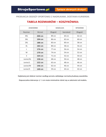 PRODUKCJA ODZIEŻY SPORTOWEJ Z NADRUKAMI, DOSTAWA KURIEREM. TABELA ROZMIARÓW – KOSZYKÓWKA: ZAWODNIK KOSZULKA SPODENKI Rozmiar Wzrost Długość Szerokość Długość 4XL 200 cm 89 cm 64 cm 62 cm 3XL 194 cm 86 cm 62 cm 60 cm 2XL 188 cm 83 cm 60 cm 58 cm XL 182 cm 80 cm 58 cm 56 cm L 176 cm 77 cm 56 cm 54 cm M 170 cm 74 cm 54 cm 52 cm S 164 cm 71 cm 52 cm 50 cm Junior/XL 158 cm 68 cm 50 cm 48 cm Junior/L 152 cm 65 cm 48 cm 46 cm Junior/M 146 cm 62 cm 46 cm 44 cm Junior/S 140 cm 59 cm 44 cm 42 cm Najłatwiej jest dobrać rozmiar według wzrostu zakładając normalną budowę zawodnika. Dopuszczalna tolerancja +/- 1 cm może minimalnie różnić się w zależności od modelu.