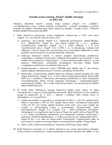 Warszawa, 27 maja 2013 r. Zwięzła ocena sytuacji „Paged” Spółki Akcyjnej za 2012 rok Niniejszy dokument stanowi zwięzłą ocenę sytuacji „Paged” S.A. („Spółki”), z uwzględnieniem oceny systemu kontroli wewnętrznej i systemu zarządzania ryzykiem istotnym dla Spółki, dokonaną przez Radę Nadzorczą zgodnie z zasadą nr III.1.1 Dobrych Praktyk Spółek Notowanych na GPW. I. Rada Nadzorcza pozytywnie ocenia osiągnięcia zrealizowane w 2012 roku przez „Paged” S.A., do których zaliczyć można m.in.: 1) realizację - przy udziale „Paged” S.A. i jednostek powiązanych: „Paged-Sklejka” S.A., „Sklejka-Pisz” Paged S.A. oraz Paged Capital Sp. z o.o. – projektu restrukturyzacji zadłużenia „Paged” S.A. z tytułu obligacji I i II serii wyemitowanych przez „Paged” S.A. w 2010 r., tj. wcześniejszego wykupu tych obligacji w celu ich umorzenia i przeniesienia nowo powstałego zadłużenia (z tytułu kredytów inwestycyjnych) na poziom jednostek zależnych, 2) realizację kolejnych kroków w ramach projektu optymalizacji podatkowej, związanego ze znakami towarowymi i opłatami licencyjnymi za korzystanie z tych znaków przez podmioty z Grupy Paged - z wykorzystaniem spółki celowej - w celu poprawy efektywności zarządzania posiadanymi aktywami Grupy Paged i osiągnięcia wymiernych oszczędności finasowych, 3) przeprowadzenie z sukcesem emisji 7.000.000 akcji Spółki serii G, jak również emisji obligacji zabezpieczonych o wartości nominalnej 20 mln PLN, 4) inicjowanie i nadzorowanie działań służących realizacji strategii przyjętej dla całej Grupy Kapitałowej „Paged” S.A., w tym: nabycie kontrolnego pakietu akcji spółki DTP S.A. z siedzibą w Warszawie, prowadzącej działalność na rynku zarządzania wierzytelnościami, dalszy rozwój segmentu związanego z zagospodarowaniem nieruchomości Spółki - nie w pełni wykorzystywanych i nie przynoszących Spółce odpowiednich korzyści. II. W ocenie Rady Nadzorczej sytuację finansową Spółki uznać należy za dobrą i niezagrożoną z uwagi na trwałą dodatnią rentowność. Rada Nadzorcza zwraca jednakże uwagę na pojawienie się w 2012 r. zdarzeń i tendencji, które można uznać za niepożądane, a w szczególności: 1) spadek przychodów ze sprzedaży w porównaniu do 2011 r. o ok. 6%, spadek marży brutto ze sprzedaży z 29% do 23%, spadek marży brutto z działalności operacyjnej z 16% do 9% oraz istotny spadek poziomu zysku netto, przy czym spadek ten wynika w przeważającej części z przeniesienia zorganizowanej części przedsiębiorstwa „Paged” S.A. („Paged” S.A. – Dział zarządzania licencjami), obejmującej w szczególności znak towarowy Paged, do spółki celowej Paged IP Sp. z o.o., której przedmiotem działalności jest zarządzanie znakami towarowymi i dzierżawa własności intelektualnej - w efekcie począwszy od 1 października 2012 r. Paged IP Sp. z o.o. stała się stroną umów licencyjnych i beneficjentem opłat za korzystanie ze znaku towarowego Paged, wnoszonych przez spółki z Grupy Paged, 2) słabe wyniki i niepewne perspektywy segmentu meblowego Grupy Paged. III. Rada Nadzorcza stwierdza, że w Spółce dotychczas nie został wprowadzony formalny system kontroli wewnętrznej i system zarządzania ryzykiem istotnym dla Spółki, co nie oznacza, iż w okresie 2012 r. w Spółce nie były prowadzone działania z zakresu kontroli wewnętrznej oraz zarządzania ryzykiem. Czynności kontrolne w szczególności były wykonywane – w oparciu o istniejące procedury - w składach handlowych Oddziału Spółki prowadzonych przez zewnętrznych agentów. Zidentyfikowane przez Zarząd Spółki w latach poprzednich ryzyka istotne dla Spółki: ryzyko związane z osłabieniem koniunktury i niepewnością rynku, ryzyko walutowe, ryzyko kredytowe (związane z kredytem kupieckim udzielanym kontrahentom), ryzyko stopy procentowej (związane ze zmianami wysokości oprocentowania lokat i kredytów) oraz ryzyko zniszczenia i kradzieży mienia, również w 2012 r. zostały uznane za najważniejsze. Zdaniem Zarządu Spółki, nie pojawiły się nowe ryzyka istotne dla Spółki. W ramach nałożonych przepisami prawa obowiązków Rada Nadzorcza prowadziła bieżący monitoring ryzyka występującego w Spółce, analizując pod tym kątem okresowe relacje Zarządu Spółki, prezentujące wyniki finansowe oraz sytuację w zakresie produkcji i sprzedaży w Spółce oraz w spółkach z grupy kapitałowej „Paged” S.A. Szczególny obszar zainteresowania stanowiła ocena ryzyka związanego z kursami walut obcych oraz ocena działań podejmowanych przez zarządy i rady nadzorcze spółek z Grupy Paged, które miały na celu zabezpieczenie przed negatywnymi skutkami ryzyka kursowego. Rada Nadzorcza była na bieżąco informowana o ekspozycji walutowej netto w poszczególnych spółkach i działaniach zabezpieczających. W ocenie Rady Nadzorczej, Zarząd Spółki dostrzega potrzebę wdrożenia system kontroli wewnętrznej oraz systemu zarządzania ryzykiem istotnym dla Spółki, aczkolwiek ze względu na charakter działalności (np. brak produkcji), liczbę zatrudnionych pracowników (poniżej 20 osób) oraz skalę własnej działalności, opracowanie i wdrożenie tych systemów nie jest zadaniem priorytetowym. W większym stopniu różnego rodzaju ryzyka dotyczą spółek zależnych od „Paged” S.A., toteż w pierwszej kolejności oba systemy powinny być wdrożone w spółkach parterowych Grupy Paged, które prowadzą bardziej złożoną działalność, w tym działalność produkcyjną oraz współpracę z zagranicą (import/eksport). Rada Nadzorcza zaleciła opracowanie przez Zarząd i wdrożenie w Spółce oraz w spółkach z Grupy Kapitałowej „Paged” S.A. systemu oceny ryzyka istotnego dla Spółki oraz systemu kontroli wewnętrznej, których istnienie ograniczałoby ryzyko wystąpienia strat z różnych tytułów (np. strat związanych z nieodp