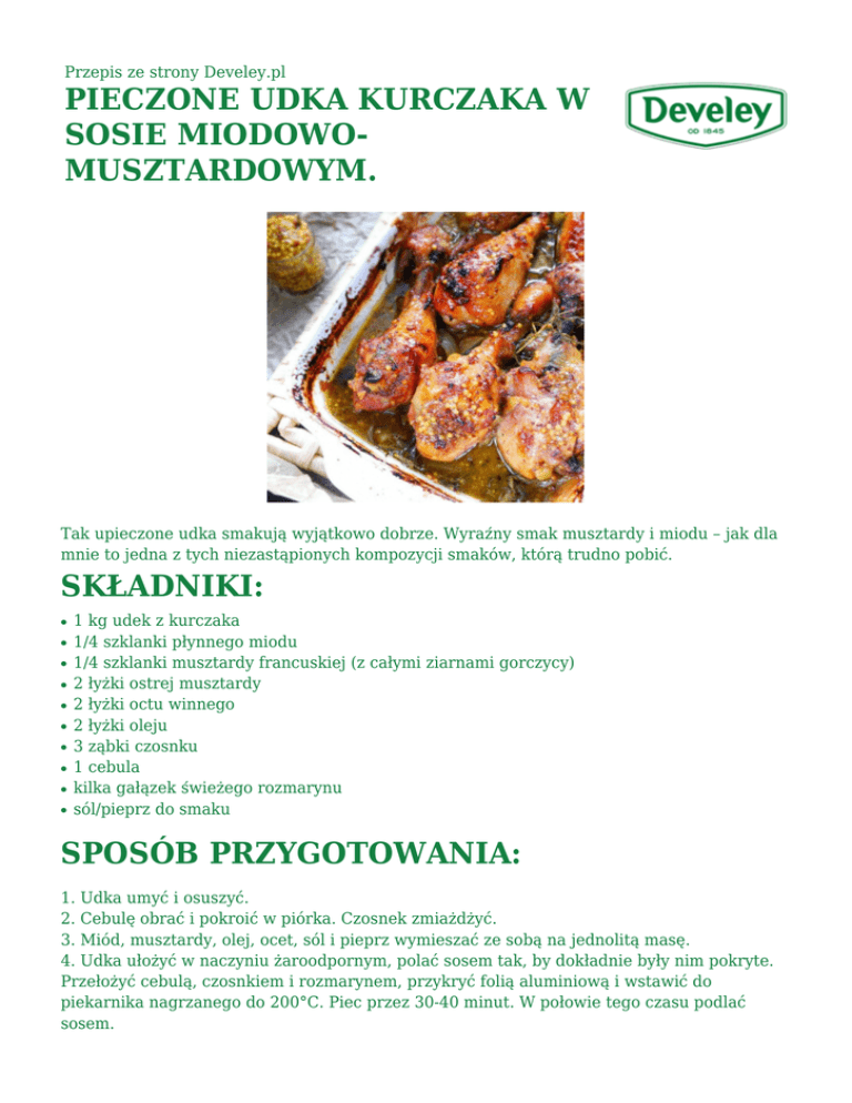 Przepis ze strony Develey.pl PIECZONE UDKA KURCZAKA W SOSIE MIODOWOMUSZTARDOWYM. Tak upieczone udka smakują wyjątkowo dobrze. Wyraźny smak musztardy i miodu – jak dla mnie to jedna z tych niezastąpionych kompozycji smaków, którą trudno pobić. SKŁADNIKI: ● ● ● ● ● ● ● ● ● ● 1 kg udek z kurczaka 1/4 szklanki płynnego miodu 1/4 szklanki musztardy francuskiej (z całymi ziarnami gorczycy) 2 łyżki ostrej musztardy 2 łyżki octu winnego 2 łyżki oleju 3 ząbki czosnku 1 cebula kilka gałązek świeżego rozmarynu sól/pieprz do smaku SPOSÓB PRZYGOTOWANIA: 1. Udka umyć i osuszyć. 2. Cebulę obrać i pokroić w piórka. Czosnek zmiażdżyć. 3. Miód, musztardy, olej, ocet, sól i pieprz wymieszać ze sobą na jednolitą masę. 4. Udka ułożyć w naczyniu żaroodpornym, polać sosem tak, by dokładnie były nim pokryte. Przełożyć cebulą, czosnkiem i rozmarynem, przykryć folią aluminiową i wstawić do piekarnika nagrzanego do 200°C. Piec przez 30-40 minut. W połowie tego czasu podlać sosem. 5. Po upływie 30-40 minut zdjąć folię, ponownie podlać powstałym sosem i dopiekać jeszcze 15-20 minut do zarumienienia się skórki. 6. Podawać od razu z ulubionymi dodatkami.