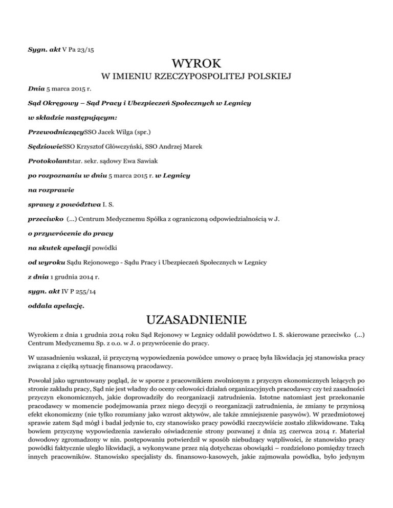 Sygn. akt V Pa 23/15 WYROK W IMIENIU RZECZYPOSPOLITEJ POLSKIEJ Dnia 5 marca 2015 r. Sąd Okręgowy – Sąd Pracy i Ubezpieczeń Społecznych w Legnicy w składzie następującym: PrzewodniczącySSO Jacek Wilga (spr.) SędziowieSSO Krzysztof Główczyński, SSO Andrzej Marek Protokolantstar. sekr. sądowy Ewa Sawiak po rozpoznaniu w dniu 5 marca 2015 r. w Legnicy na rozprawie sprawy z powództwa I. S. przeciwko (...) Centrum Medycznemu Spółka z ograniczoną odpowiedzialnością w J. o przywrócenie do pracy na skutek apelacji powódki od wyroku Sądu Rejonowego - Sądu Pracy i Ubezpieczeń Społecznych w Legnicy z dnia 1 grudnia 2014 r. sygn. akt IV P 255/14 oddala apelację. UZASADNIENIE Wyrokiem z dnia 1 grudnia 2014 roku Sąd Rejonowy w Legnicy oddalił powództwo I. S. skierowane przeciwko (...) Centrum Medycznemu Sp. z o.o. w J. o przywrócenie do pracy. W uzasadnieniu wskazał, iż przyczyną wypowiedzenia powódce umowy o pracę była likwidacja jej stanowiska pracy związana z ciężką sytuację finansową pracodawcy. Powołał jako ugruntowany pogląd, że w sporze z pracownikiem zwolnionym z przyczyn ekonomicznych leżących po stronie zakładu pracy, Sąd nie jest władny do oceny celowości działań organizacyjnych pracodawcy czy też zasadności przyczyn ekonomicznych, jakie doprowadziły do reorganizacji zatrudnienia. Istotne natomiast jest przekonanie pracodawcy w momencie podejmowania przez niego decyzji o reorganizacji zatrudnienia, że zmiany te przyniosą efekt ekonomiczny (nie tylko rozumiany jako wzrost aktywów, ale także zmniejszenie pasywów). W przedmiotowej sprawie zatem Sąd mógł i badał jedynie to, czy stanowisko pracy powódki rzeczywiście zostało zlikwidowane. Taką bowiem przyczynę wypowiedzenia zawierało oświadczenie strony pozwanej z dnia 25 czerwca 2014 r. Materiał dowodowy zgromadzony w nin. postępowaniu potwierdził w sposób niebudzący wątpliwości, że stanowisko pracy powódki faktycznie uległo likwidacji, a wykonywane przez nią dotychczas obowiązki – rozdzielono pomiędzy trzech innych pracowników. Stanowisko specjalisty ds. finansowo-kasowych, jakie zajmowała powódka, było jedynym takim stanowiskiem w pozwanej Spółce. Na miejsce powódki nie została przyjęta żadna nowa osoba. Powyższe okoliczności, wynikające z materiału dowodowego zgromadzonego w sprawie, w sposób niebudzący wątpliwości świadczą o tym, że likwidacja stanowiska pracy powódki nie była pozorna. Likwidacja konkretnego (jedynego danego rodzaju) stanowiska pracy, w której wyniku następuje zmiana struktury zakładu pracy powodująca zmniejszenie zatrudnienia, uzasadnia zwolnienie pracownika, który był zatrudniony na tym stanowisku pracy, bez potrzeby oceny przez pracodawcę kwalifikacji, stażu pracy itp. zwalnianego pracownika i porównywania go z pracownikami zatrudnionymi na stanowiskach innego rodzaju. Sytuacji takiej, tj. uzasadniającej potrzebę oceny i porównania zwalnianego pracownika z innymi pracownikami zatrudnionymi na takich samych stanowiskach, w niniejszej sprawie nie było. Nie sposób też było zgodzić się z twierdzeniem powódki, że stanowisko specjalisty ds. finansowo-kasowych, które objęła w sierpniu 2013 r., zostało stworzone pozornie. Z materiału dowodowego nin. sprawy wynika bowiem, że w momencie tworzenia ww. stanowiska w dziale księgowości i przenoszenia na nie powódki, sytuacja finansowa pozwanej Spółki nie była zła i nikt nie planował zwolnień. Zmiana sytuacji nastąpiła dopiero rok później i była spowodowana zdarzeniami, które miały miejsce w zasadzie na przełomie roku 2013/2014, a wynik bilansowy z połowy 2014 r. potwierdził jedynie potrzebę dokonania zmian – celem poczynienia oszczędności. Mając na uwadze powyższe rozważania, Sąd uznał, iż przyczyna rozwiązania z powódką umowy o pracę -likwidacja stanowiska pracy- była prawdziwa i konkretna i jako taka czyniła wypowiedzenie stosunku pracy zasadnym. Wyrok powyższy zaskarżyła apelacją powódka zarzucając: 1. Naruszenie przepisów prawa materialnego, tj.: • art. 45 §1 kp poprzez jego niezastosowanie w sytuacji gdy wypowiedzenie stosunku pracy było nieuzasadnione i zachodziła podstawa do przywrócenia powódki do pracy, • art. 30 §4 kp poprzez uznanie, że przyczyna wypowiedzenia stosunku pracy była prawdziwa podczas gdy była ona pozorna, albowiem pozwany celowo najpierw stworzył stanowisko pracy dla powódki, aby następnie je zlikwidować przed osiągnięciem przez powódkę wieku, w którym pracodawca nie mógłby wypowiedzieć jej umowy o pracę, 2. Naruszenie przepisów prawa procesowego, tj. art. 233 kpc poprzeć dokonanie błędnej oceny materiału dowodowego i uznaniu, że pozwany udowodnił, iż przyczyna wypowiedzenia stosunku pracy była prawdziwa. Wskazując na powyższe zarzuty skarżąca domagała się zmiany zaskarżonego wyroku i przywrócenia do pracy oraz zasądzenia kosztów postępowania. W uzasadnieniu apelacji powódka argumentowała, iż jej zdaniem przyczyna podana w oświadczeniu o wypowiedzeniu była nieprawdziwa. Sytuacja finansowa pracodawcy w okresie poprzedzającym wypowiedzenie nie była trudna i nie uzasadniała jej zwolnienia. Nadto skarżąca wskazywała, iż pozwana celowo utworzyła stanowisko dla powódki, aby móc ją zwolnić przed osiągnięciem wieku ochronnego z art. 39 k.p.. W toku postępowania okazało się bowiem, że przyczyny utworzenia stanowiska okazały się nieprawdziwe, skoro po jej zwolnienia jej obowiązki powierzono dotychczasowym pracownikom. Elementem szerszego planu pracodawcy zmierzającego do zwolnienia powódki była również organizacja Izby Przyjęć, do której zatrudniono dwie nowe pracownice, mimo iż powódka mogła tam w dalszym ciągu pracować. Sąd Okręgowy zważył: Sąd Rejonowy zgromadził w sprawie wystarczający materiał dowodowy i prawidłowo go ocenił. Nie dopuścił się przy tym naruszenia art. 233 § 1 k.p.c. Skuteczn