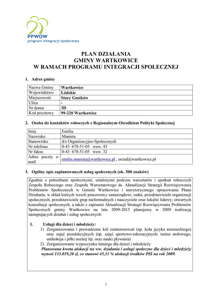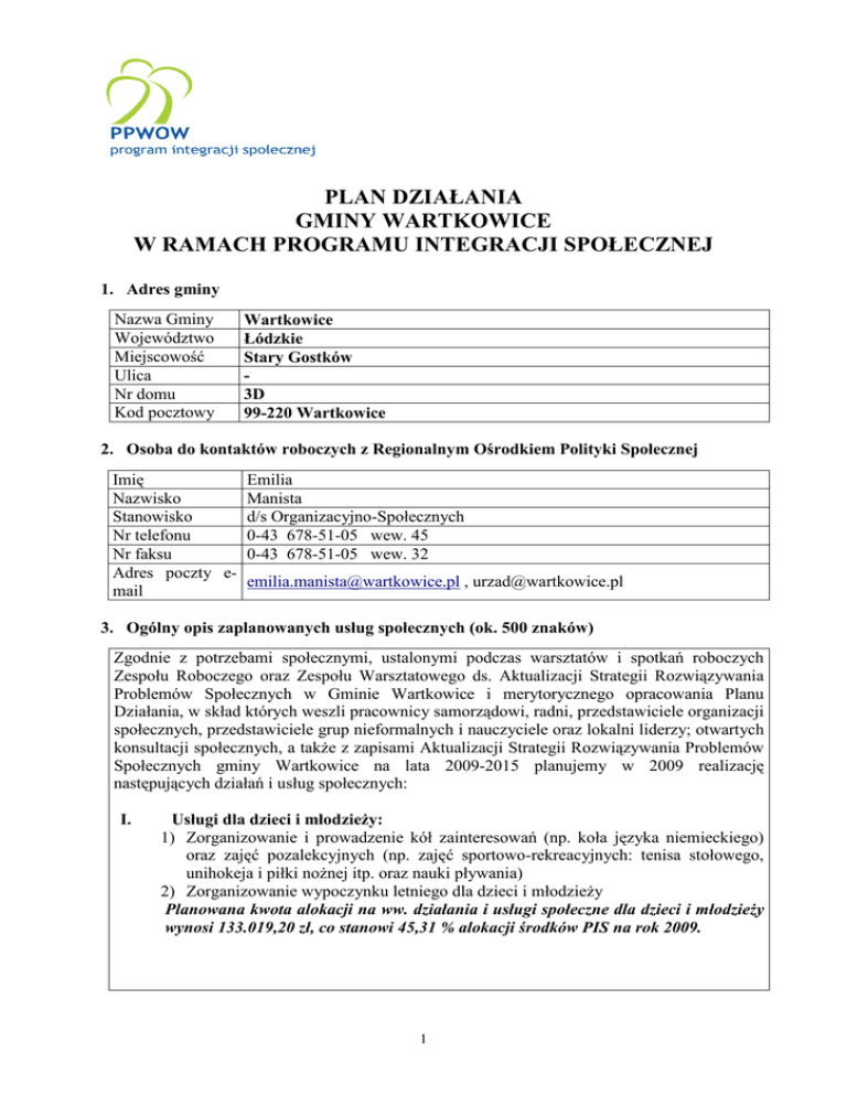 PLAN DZIAŁANIA GMINY WARTKOWICE W RAMACH PROGRAMU INTEGRACJI SPOŁECZNEJ 1. Adres gminy Nazwa Gminy Województwo Miejscowość Ulica Nr domu Kod pocztowy Wartkowice Łódzkie Stary Gostków 3D 99-220 Wartkowice 2. Osoba do kontaktów roboczych z Regionalnym Ośrodkiem Polityki Społecznej Imię Emilia Nazwisko Manista Stanowisko d/s Organizacyjno-Społecznych Nr telefonu 0-43 678-51-05 wew. 45 Nr faksu 0-43 678-51-05 wew. 32 Adres poczty [email protected] , [email protected] mail 3. Ogólny opis zaplanowanych usług społecznych (ok. 500 znaków) Zgodnie z potrzebami społecznymi, ustalonymi podczas warsztatów i spotkań roboczych Zespołu Roboczego oraz Zespołu Warsztatowego ds. Aktualizacji Strategii Rozwiązywania Problemów Społecznych w Gminie Wartkowice i merytorycznego opracowania Planu Działania, w skład których weszli pracownicy samorządowi, radni, przedstawiciele organizacji społecznych, przedstawiciele grup nieformalnych i nauczyciele oraz lokalni liderzy; otwartych konsultacji społecznych, a takŜe z zapisami Aktualizacji Strategii Rozwiązywania Problemów Społecznych gminy Wartkowice na lata 2009-2015 planujemy w 2009 realizację następujących działań i usług społecznych: I. Usługi dla dzieci i młodzieŜy: 1) Zorganizowanie i prowadzenie kół zainteresowań (np. koła języka niemieckiego) oraz zajęć pozalekcyjnych (np. zajęć sportowo-rekreacyjnych: tenisa stołowego, unihokeja i piłki noŜnej itp. oraz nauki pływania) 2) Zorganizowanie wypoczynku letniego dla dzieci i młodzieŜy Planowana kwota alokacji na ww. działania i usługi społeczne dla dzieci i młodzieŜy wynosi 133.019,20 zł, co stanowi 45,31 % alokacji środków PIS na rok 2009. 1 II. Usługi dla dzieci i młodzieŜy, rodzin i osób starszych: 1) Zorganizowanie Ŝycia społeczno-kulturalnego w 5 sołectwach: Wartkowice, Biernacice, Tur, Pełczyska i Biała Góra z wykorzystaniem lokalnych zasobów poprzez organizowanie zajęć integracyjnych (m. in. imprez okolicznościowych, spotkań, pikników, festynów rodzinnych, warsztatów kulinarnych, wyjazdów do kina, teatru, ogrodu botanicznego itp. oraz działań związanych promowaniem zdrowego stylu Ŝycia – organizacja białych niedziel); 2) Zorganizowanie poradnictwa specjalistycznego dla mieszkańców gminy (m.in. porady psychologiczne, zawodowe, prawne, profilaktyczne, terapeutyczne). Planowana kwota alokacji na działanie wynosi 131.190,00 zł, co stanowi 44,69% alokacji środków PIS na rok 2009 III. Wsparcie szkoleniowe: 1) Wyjazd studyjny i/lub wyjazdowe szkolenie dla grupy ok. 40 osób m.in. dla liderów społeczności lokalnej, przedstawicieli organizacji pozarządowych, grup nieformalnych, uczestników Warsztatów Aktualizujących GSRPS. Planowana kwota alokacji na działanie wynosi 29.356,00 zł, co stanowi 10,00 % alokacji środków PIS na rok 2009 4. Czy planowane usługi są zgodne z zapisami w planach strategicznych gminy (w tym w strategii rozwiązywania problemów społecznych, jeśli istnieje)? TAK Proszę zacytować odpowiednie zapisy: Działanie I „Usługi dla dzieci i młodzieŜy” jest odpowiedzią na cel strategiczny i operacyjny Aktualizacji Gminnej Strategii Rozwiązywania Problemów Społecznych na lata 2009 – 2015: Cel strategiczny 3. Zmniejszenie obszarów wykluczenia społecznego. Cel operacyjny 1. Zmniejszenie rozmiaru patologii oraz rozwój wsparcia dla osób i rodzin dotkniętych problemami uzaleŜnień Cel strategiczny 4. Zwiększenie moŜliwości wszechstronnego rozwoju mieszkańców (kultura, sport, turystyka) Cel operacyjny 1. Poprawa dostępności do ośrodków kultury i rekreacji Cel operacyjny 5. Zagospodarowanie czasu wolnego dla mieszkańców, w tym w szczególności dla dzieci i młodzieŜy Działanie II: „Usługi dla dzieci i młodzieŜy, rodzin i osób starszych” jest zbieŜne z celami strategicznymi i operacyjnymi Aktualizacji Gminnej Strategii Rozwiązywania Problemów Społecznych na lata 2009 – 2015: Cel strategiczny 1. Zwiększenie poziomu integracji społecznej wśród mieszkańców. Cel operacyjny 4. Rozszerzenie integracji z osobami starszymi. Cel operacyjny 5. Zwiększenie moŜliwości ilości spotkań Cel operacyjny 6. Rozwój kultywowania tradycji Cel strategiczny 3. Zmniejszenie obszarów wykluczenia społecznego. Cel operacyjny 1. Zmniejszenie rozmiaru patologii oraz rozwój wsparcia dla osób i rodzin dotkniętych problemami uzaleŜnień Cel strategiczny 4. Zwiększenie moŜliwości wszechstronnego rozwoju mieszkańców (kultura, sport, turystyka) Cel operacyjny 1. Poprawa dostępności do ośrodków kultury i rekreacji Cel operacyjny 5. Zagospodarowanie czasu wolnego dla mieszkańców, w tym w szczególności dla dzieci i młodzieŜy 2 Cel strategiczny 5. Poprawa dostępu mieszkańców do usług medycznych i społecznych Cel operacyjny 1. Zwiększenie dostępności do usług specjalistycznych, opieki medycznej (stomatologicznej, ginekologicznej itp.) Działanie III: „Wsparcie szkoleniowe” jest zbieŜne z celami strategicznymi i operacyjnymi Aktualizacji Gminnej Strategii Rozwiązywania Problemów Społecznych na lata 2009 – 2015: Cel strategiczny 1. Zwiększenie poziomu integracji społecznej wśród mieszkańców. Cel operacyjny 1. Podniesienie poziomu świadomości społecznej. Cel operacyjny 2. Zwiększenie poziomu motywacji do działania. Cel operacyjny 3. Rozwój liderów i animatorów społecznych. Cel strategiczny 4. Zwiększenie moŜliwości wszechstronnego rozwoju mieszkańców (kultura, sport, turystyka). Cel operacyjny 2. Umocnienie pozycji liderów, rozwój liderów. Cel operacyjny 4. Aktywizacja społeczności lokalnej do wspólnych działań. NIE Jeśli NIE, proszę o wyjaśnienie rozbieŜności: 5. Prognozowany harmonogram realizacji Planu Działania Główne etapy realizacji Planu Działania Kwartały ROK 2008 I II III Przygotowanie Planu Działania Upowszechnianie i promocja działań Ogłoszenie konkursu Podpisywanie umów z wykonawcami Wdr