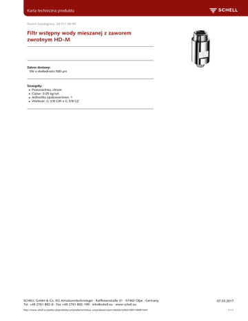 Karta techniczna produktu Numer katalogowy: 28 511 06 99 Filtr wstępny wody mieszanej z zaworem zwrotnym HD-M Zakres dostawy: filtr o dokładności 500 µm Szczegóły: Powierzchnia: chrom Ciężar: 0.05 kg/szt. Jednostka opakowaniowa: 1 Wielkość: G 3/8 GW x G 3/8 GZ SCHELL GmbH & Co. KG Armaturentechnologie · Raiffeisenstraße 31 · 57462 Olpe · Germany Tel. +49 2761 892-0 · Fax +49 2761 892-199 · [email protected] · www.schell.eu http://www.schell.eu/polska-pl/produkty/umywalka/armatury-umywalkowe/puris/details/artikel/285110699.html Powered by TCPDF (www.tcpdf.org) 07.03.2017 1/1