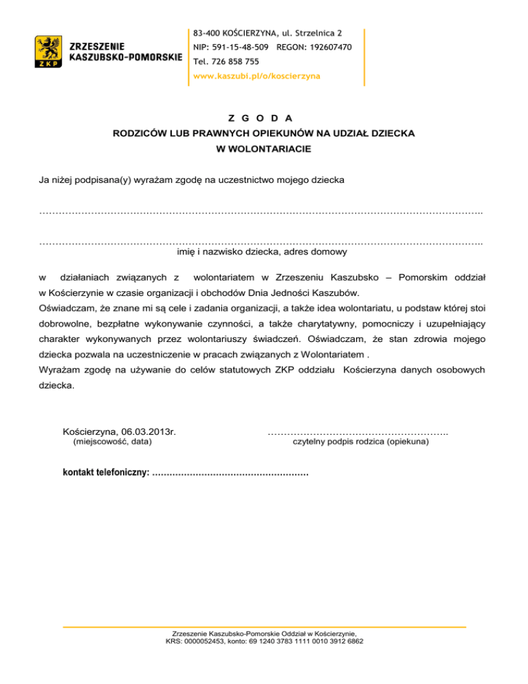 83-400 KOŚCIERZYNA, ul. Strzelnica 2 NIP: 591-15-48-509 REGON: 192607470 Tel. 726 858 755 www.kaszubi.pl/o/koscierzyna Z G O D A RODZICÓW LUB PRAWNYCH OPIEKUNÓW NA UDZIAŁ DZIECKA W WOLONTARIACIE Ja niżej podpisana(y) wyrażam zgodę na uczestnictwo mojego dziecka ……………………………………………………………………………………………………………………….. ……………………………………………………………………………………………………………………….. imię i nazwisko dziecka, adres domowy w działaniach związanych z wolontariatem w Zrzeszeniu Kaszubsko – Pomorskim oddział w Kościerzynie w czasie organizacji i obchodów Dnia Jedności Kaszubów. Oświadczam, że znane mi są cele i zadania organizacji, a także idea wolontariatu, u podstaw której stoi dobrowolne, bezpłatne wykonywanie czynności, a także charytatywny, pomocniczy i uzupełniający charakter wykonywanych przez wolontariuszy świadczeń. Oświadczam, że stan zdrowia mojego dziecka pozwala na uczestniczenie w pracach związanych z Wolontariatem . Wyrażam zgodę na używanie do celów statutowych ZKP oddziału Kościerzyna danych osobowych dziecka. Kościerzyna, 06.03.2013r. (miejscowość, data) ……………………………………………….. czytelny podpis rodzica (opiekuna) kontakt telefoniczny: ……………………………………………… Zrzeszenie Kaszubsko-Pomorskie Oddział w Kościerzynie, KRS: 0000052453, konto: 69 1240 3783 1111 0010 3912 6862