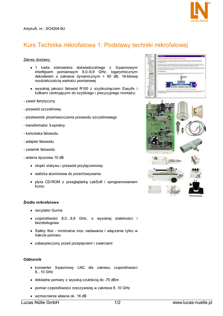 ArtykuÅ‚ nr.: SO4204-9U Kurs Technika mikrofalowa 1: Podstawy techniki mikrofalowej Zakres dostawy: 1 karta stanowiska doświadczalnego z X-pasmowym interfejsem pomiarowym 8,0–9,9 GHz, logarytmicznym dekoderem o zakresie dynamicznym > 60 dB, 16-bitową rozdzielczością wartości pomiarowej wysokiej jakości falowód R100 z szybkozłączem Easyfix i kołkami centrującymi do szybkiego i precyzyjnego montażu: - zawór ferrytyczny - przewód szczelinowy - przetwornik przemieszczenia przewodu szczelinowego - transformator 3-spiralny - końcówka falowodu - adapter falowodu - zwiernik falowodu - antena dyszowa 10 dB stopki statywu i przewód przyłączeniowy walizka aluminiowa do przechowywania płyta CD-ROM z przeglądarką LabSoft i oprogramowaniem kursu Źródło mikrofalowe oscylator Gunna częstotliwość 8,0...9,9 GHz, bezobsługowa o wysokiej stabilności i Safety first - minimalna moc nadawania i włączenie tylko w trakcie pomiaru zabezpieczony przed przepięciami i zwarciami Odbiornik konwerter X-pasmowy 8...10 GHz LNC dla zakresu częstotliwości dokładne pomiary z wysoką czułością do -75 dBm pomiar częstotliwości rzeczywistej w zakresie 8..10 GHz wzmocnienie własne ok. 16 dB Lucas Nülle GmbH 1/2 www.lucas-nuelle.pl Program nauczania: parametry fal elektromagnetycznych oscylator Gunna odbiornik LNC wyznaczenie charakterystyki prądowo-napięciowej teoria przewodów i wielkości przewodów rozprzestrzenianie fal w falowodzie fale stojące, zwarcie, odbicie i dopasowanie współczynnik fali stojącej obniżenie mocy i obciążenie termiczne pomiary rozdziału fal w falowodzie za pomocą przewodu szczelinowego falowody typu TE, TM średnice falowodu i częstotliwość robocza dielektryki w falowodzie czas trwania kursu: ok. 4,5 godz. Lucas Nülle GmbH 2/2 www.lucas-nuelle.pl
