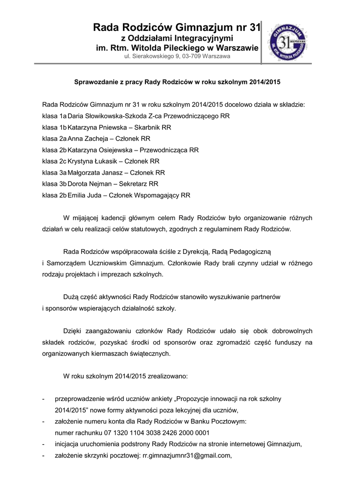 Rada Rodziców Gimnazjum nr 31 z Oddziałami Integracyjnymi im. Rtm. Witolda Pileckiego w Warszawie ul. Sierakowskiego 9, 03-709 Warszawa Sprawozdanie z pracy Rady Rodziców w roku szkolnym 2014/2015 Rada Rodziców Gimnazjum nr 31 w roku szkolnym 2014/2015 docelowo działa w składzie: klasa 1a Daria Słowikowska-Szkoda Z-ca Przewodniczącego RR klasa 1b Katarzyna Pniewska – Skarbnik RR klasa 2a Anna Zacheja – Członek RR klasa 2b Katarzyna Osiejewska – Przewodnicząca RR klasa 2c Krystyna Łukasik – Członek RR klasa 3a Małgorzata Janasz – Członek RR klasa 3b Dorota Nejman – Sekretarz RR klasa 2b Emilia Juda – Członek Wspomagający RR W mijającej kadencji głównym celem Rady Rodziców było organizowanie różnych działań w celu realizacji celów statutowych, zgodnych z regulaminem Rady Rodziców. Rada Rodziców współpracowała ściśle z Dyrekcją, Radą Pedagogiczną i Samorządem Uczniowskim Gimnazjum. Członkowie Rady brali czynny udział w różnego rodzaju projektach i imprezach szkolnych. Dużą część aktywności Rady Rodziców stanowiło wyszukiwanie partnerów i sponsorów wspierających działalność szkoły. Dzięki zaangażowaniu członków Rady Rodziców udało się obok dobrowolnych składek rodziców, pozyskać środki od sponsorów oraz zgromadzić część funduszy na organizowanych kiermaszach świątecznych. W roku szkolnym 2014/2015 zrealizowano: - przeprowadzenie wśród uczniów ankiety „Propozycje innowacji na rok szkolny 2014/2015” nowe formy aktywności poza lekcyjnej dla uczniów, - założenie numeru konta dla Rady Rodziców w Banku Pocztowym: numer rachunku 07 1320 1104 3038 2426 2000 0001 - inicjacja uruchomienia podstrony Rady Rodziców na stronie internetowej Gimnazjum, - założenie skrzynki pocztowej: [email protected], Rada Rodziców Gimnazjum nr 31 z Oddziałami Integracyjnymi im. Rtm. Witolda Pileckiego w Warszawie ul. Sierakowskiego 9, 03-709 Warszawa - zakup sprzętu nagłaśniającego dla radiowęzła, - wprowadzenie i współfinansowanie projektu „Śniadanie dla ucznia” - organizacja i zakup nagród w konkursie klasa na medal, - kiermasze: Bożonarodzeniowe i Wielkanocne – sprzedaż rękodzieła przygotowanego przez rodziców i uczniów, - organizacja akcji „przekaż 1% podatku na rzecz swojej szkoły” we współpracy z Fundacją Rodzice Szkole, - opracowanie i zgłoszenie do budżetu partycypacyjnego na rok 2016 w Dzielnicy PragaPółnoc 2 projektów: Boisko dla Pileckiego i Zagospodarowanie terenu przy Gimnazjum nr 31, - organizacja i finansowanie balu na zakończenie klas 3, - zakup nagród dla 2 uczniów na zakończenie roku szkolnego, - sfinansowanie albumów i pamiątek z okazji ukończenia gimnazjum, - finansowanie poczęstunków dla uczniów na dyskotekach i zabawach szkolnych (Andrzejki, Walentynki) - przygotowanie konkursów i nagród na święto szkoły, - inicjowanie i współfinansowanie reaktywacji gazetki szkolnej, Rozliczenie konta bankowego za rok szkolny 2014/2015 Wpłaty: 9.547,77 zł Wypłaty: 4.750,78 zł Saldo na dzień 01.09.2015: 4.796,99 zł Szczegółowe rozliczenia i wykazy płatności w załączeniu. Sprawozdanie odczytano na zebraniu dnia: 07.09.2015 r. Głosowanie w/s przyjęcia sprawozdania: Za 5 Przeciw 0 Wstrzymało się 0 Sprawozdanie za rok szkolny 2014/2015 zostało przyjęte, na głosowaniu w dniu 07.09.2015 . .