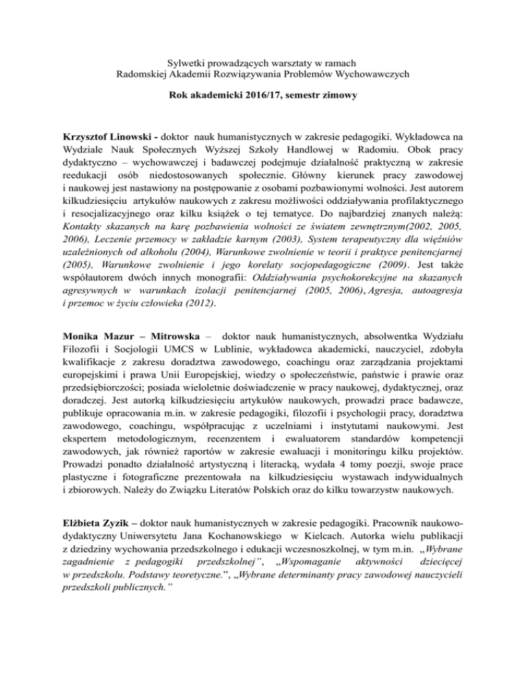 Sylwetki prowadzących warsztaty w ramach Radomskiej Akademii Rozwiązywania Problemów Wychowawczych Rok akademicki 2016/17, semestr zimowy Krzysztof Linowski - doktor nauk humanistycznych w zakresie pedagogiki. Wykładowca na Wydziale Nauk Społecznych Wyższej Szkoły Handlowej w Radomiu. Obok pracy dydaktyczno – wychowawczej i badawczej podejmuje działalność praktyczną w zakresie reedukacji osób niedostosowanych społecznie. Główny kierunek pracy zawodowej i naukowej jest nastawiony na postępowanie z osobami pozbawionymi wolności. Jest autorem kilkudziesięciu artykułów naukowych z zakresu możliwości oddziaływania profilaktycznego i resocjalizacyjnego oraz kilku książek o tej tematyce. Do najbardziej znanych należą: Kontakty skazanych na karę pozbawienia wolności ze światem zewnętrznym(2002, 2005, 2006), Leczenie przemocy w zakładzie karnym (2003), System terapeutyczny dla więźniów uzależnionych od alkoholu (2004), Warunkowe zwolnienie w teorii i praktyce penitencjarnej (2005), Warunkowe zwolnienie i jego korelaty socjopedagogiczne (2009). Jest także współautorem dwóch innych monografii: Oddziaływania psychokorekcyjne na skazanych agresywnych w warunkach izolacji penitencjarnej (2005, 2006), Agresja, autoagresja i przemoc w życiu człowieka (2012). Monika Mazur – Mitrowska – doktor nauk humanistycznych, absolwentka Wydziału Filozofii i Socjologii UMCS w Lublinie, wykładowca akademicki, nauczyciel, zdobyła kwalifikacje z zakresu doradztwa zawodowego, coachingu oraz zarządzania projektami europejskimi i prawa Unii Europejskiej, wiedzy o społeczeństwie, państwie i prawie oraz przedsiębiorczości; posiada wieloletnie doświadczenie w pracy naukowej, dydaktycznej, oraz doradczej. Jest autorką kilkudziesięciu artykułów naukowych, prowadzi prace badawcze, publikuje opracowania m.in. w zakresie pedagogiki, filozofii i psychologii pracy, doradztwa zawodowego, coachingu, współpracując z uczelniami i instytutami naukowymi. Jest ekspertem metodologicznym, recenzentem i ewaluatorem standardów kompetencji zawodowych, jak również raportów w zakresie ewaluacji i monitoringu kilku projektów. Prowadzi ponadto działalność artystyczną i literacką, wydała 4 tomy poezji, swoje prace plastyczne i fotograficzne prezentowała na kilkudziesięciu wystawach indywidualnych i zbiorowych. Należy do Związku Literatów Polskich oraz do kilku towarzystw naukowych. Elżbieta Zyzik – doktor nauk humanistycznych w zakresie pedagogiki. Pracownik naukowodydaktyczny Uniwersytetu Jana Kochanowskiego w Kielcach. Autorka wielu publikacji z dziedziny wychowania przedszkolnego i edukacji wczesnoszkolnej, w tym m.in. „Wybrane zagadnienie z pedagogiki przedszkolnej”, „Wspomaganie aktywności dziecięcej w przedszkolu. Podstawy teoretyczne.”, „Wybrane determinanty pracy zawodowej nauczycieli przedszkoli publicznych.” Maria Łukawska - dr nauk humanistycznych w zakresie pedagogiki, specjalista w zakresie edukacji wczesnoszkolnej. Wieloletni pracownik szkoły podstawowej, obecnie nauczyciel klas I-III w Szkole Podstawowej nr 4 w Tarnobrzegu. Twórca licznych publikacji naukowych na temat profilaktyki w szkole i edukacji wczesnoszkolnej. Autor książki „Skuteczność edukacyjnych programów profilaktycznych realizowanych w klasach I-III”.