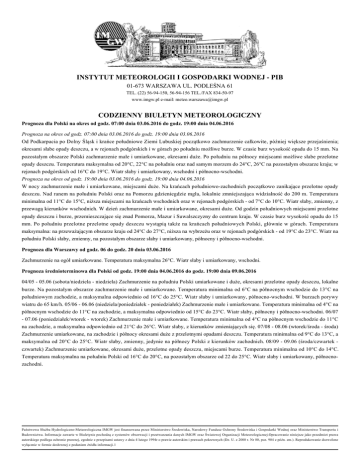 INSTYTUT METEOROLOGII I GOSPODARKI WODNEJ - PIB 01-673 WARSZAWA UL. PODLEŚNA 61 TEL. (22) 56-94-150, 56-94-156 TEL./FAX 834-50-97 www.imgw.pl e-mail: [email protected] CODZIENNY BIULETYN METEOROLOGICZNY Prognoza dla Polski na okres od godz. 07:00 dnia 03.06.2016 do godz. 19:00 dnia 04.06.2016 Prognoza na okres od godz. 07:00 dnia 03.06.2016 do godz. 19:00 dnia 03.06.2016 Od Podkarpacia po Dolny Śląsk i krańce południowe Ziemi Lubuskiej początkowo zachmurzenie całkowite, później większe przejaśnienia; okresami słabe opady deszczu, a w rejonach podgórskich i w górach po południu możliwe burze. W czasie burz wysokość opadu do 15 mm. Na pozostałym obszarze Polski zachmurzenie małe i umiarkowane, okresami duże. Po południu na północy miejscami możliwe słabe przelotne opady deszczu. Temperatura maksymalna od 20°C, 22°C na południu oraz nad samym morzem do 24°C, 26°C na pozostałym obszarze kraju; w rejonach podgórskich od 16°C do 19°C. Wiatr słaby i umiarkowany, wschodni i północno-wschodni. Prognoza na okres od godz. 19:00 dnia 03.06.2016 do godz. 19:00 dnia 04.06.2016 W nocy zachmurzenie małe i umiarkowane, miejscami duże. Na krańcach południowo-zachodnich początkowo zanikające przelotne opady deszczu. Nad ranem na południu Polski oraz na Pomorzu gdzieniegdzie mgła, lokalnie zmniejszająca widzialność do 200 m. Temperatura minimalna od 11°C do 15°C, niższa miejscami na krańcach wschodnich oraz w rejonach podgórskich - od 7°C do 10°C. Wiatr słaby, zmienny, z przewagą kierunków wschodnich. W dzień zachmurzenie małe i umiarkowane, okresami duże. Od godzin południowych miejscami przelotne opady deszczu i burze, przemieszczające się znad Pomorza, Mazur i Suwalszczyzny do centrum kraju. W czasie burz wysokość opadu do 15 mm. Po południu przelotne przelotne opady deszczu wystąpią także na krańcach południowych Polski, głównie w górach. Temperatura maksymalna: na przeważającym obszarze kraju od 24°C do 27°C, niższa na wybrzeżu oraz w rejonach podgórskich - od 19°C do 23°C. Wiatr na południu Polski słaby, zmienny, na pozostałym obszarze słaby i umiarkowany, północny i północno-wschodni. Prognoza dla Warszawy od godz. 06 do godz. 20 dnia 03.06.2016 Zachmurzenie na ogół umiarkowane. Temperatura maksymalna 26°C. Wiatr słaby i umiarkowany, wschodni. Prognoza średnioterminowa dla Polski od godz. 19:00 dnia 04.06.2016 do godz. 19:00 dnia 09.06.2016 04/05 - 05.06 (sobota/niedziela - niedziela) Zachmurzenie na południu Polski umiarkowane i duże, okresami przelotne opady deszczu, lokalne burze. Na pozostałym obszarze zachmurzenie małe i umiarkowane. Temperatura minimalna od 6°C na północnym wschodzie do 13°C na południowym zachodzie, a maksymalna odpowiednio od 16°C do 25°C. Wiatr słaby i umiarkowany, północno-wschodni. W burzach porywy wiatru do 65 km/h. 05/06 - 06.06 (niedziela/poniedziałek - poniedziałek) Zachmurzenie małe i umiarkowane. Temperatura minimalna od 4°C na północnym wschodzie do 11°C na zachodzie, a maksymalna odpowiednio od 15°C do 23°C. Wiatr słaby, północny i północno-wschodni. 06/07 - 07.06 (poniedziałek/wtorek - wtorek) Zachmurzenie małe i umiarkowane. Temperatura minimalna od 4°C na północnym wschodzie do 11°C na zachodzie, a maksymalna odpowiednio od 21°C do 26°C. Wiatr słaby, z kierunków zmieniających się. 07/08 - 08.06 (wtorek/środa - środa) Zachmurzenie umiarkowane, na zachodzie i północy okresami duże z przelotnymi opadami deszczu. Temperatura minimalna od 9°C do 13°C, a maksymalna od 20°C do 25°C. Wiatr słaby, zmienny, jedynie na północy Polski z kierunków zachodnich. 08/09 - 09.06 (środa/czwartek czwartek) Zachmurzenie umiarkowane, okresami duże, przelotne opady deszczu, miejscami burze. Temperatura minimalna od 10°C do 14°C. Temperatura maksymalna na południu Polski od 16°C do 20°C, na pozostałym obszarze od 22 do 25°C. Wiatr słaby i umiarkowany, północnozachodni. Państwowa Służba Hydrologiczno-Meteorologiczna IMGW jest finansowana przez Ministerstwo Środowiska, Narodowy Fundusz Ochrony Środowiska i Gospodarki Wodnej oraz Ministerstwo Transportu i Budownictwa. Informacje zawarte w Biuletynie pochodzą z systemów obserwacji i przetwarzania danych IMGW oraz Światowej Organizacji Meteorologicznej.Opracowanie niniejsze jako przedmiot prawa autorskiego podlega ochronie prawnej, zgodnie z przepisami ustawy z dnia 4 lutego 1994r o prawie autorskim i prawach pokrewnych (Dz. U. z 2000 r. Nr 80, poz. 904 z późn. zm.). Reprodukowanie dozwolone wyłącznie w formie dosłownej z podaniem źródła informacji.1 Strona: 2 Strona: 3 Strona: 4