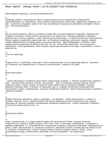 Płońszczak - Gazeta lokalna - Płońsk, Raciąż, Baboszewo, Czerwińsk, Dzierzążnia, Joniec, Naruszewo Nasz raport - dokąd, kiedy i za ile jeździli nasi włodarze Samorządowa integracja, czyli tanie podróżowanie Publikując artykuł o wyjeździe do Włoch zorganizowanym przez Urząd Gminy w Baboszewie zapowiedzieliśmy, że sprawdzimy, jakie wyjazdy organizują inne samorządy. Baboszewo wyjątkiem nie jest - są bowiem przypadki, gdzie od lat trwa wycieczkowa integracja za podatników pieniądze. Można rzec - tanie podróżowanie. Jak już informowaliśmy, Włochy są ostatnio modne jako cel samorządowych wyjazdów. Pojechali tam urzędnicy starostwa i dwoje radnych powiatowych, by szkolić się w zakresie gospodarki odpadami, pojechali tam również urzędnicy i część radnych gminy Baboszewo - w celach turystyczno-szkoleniowych. Koszty wyjazdu urzędników zostały pokryte z ich funduszu socjalnego, ale koszty wyjazdu radnych zostały dofinansowane z budżetu gminy oraz przez sponsora - Bank Spółdzielczy w Płońsku. Takie wyjazdy gmina organizuje od ładnych paru lat i ich cel - jak poinformował wójt - jest turystycznoszkoleniowy. Teraz sprawdzamy, jakie wyjazdy organizują pozostałe samorządy - poprosiliśmy o dane z ostatnich lat. Trzy nie organizują Urzędy Gmin w Czerwińsku, Dzierzążni i Jońcu poinformowały, że nie organizują żadnych wyjazdów ani krajowych, ani zagranicznych, w których uczestniczyliby urzędnicy lub radni. Gmina Naruszewo - Gmina Naruszewo w ostatnich pięciu latach organizowała wyjazdy, w których uczestniczyli urzędnicy i radni - poinformował sekretarz Tomasz Konczewski. - Były to wyłącznie wyjazdy krajowe. Gmina organizuje jeden wyjazd rocznie. W ostatnich pięciu latach były to wyjazdy do Białego Dunajca, Gdańska, Poznania, Kielc i Krakowa. W większości były to wyjazdy turystyczne finansowane dla pracowników urzędu z Zakładowego Funduszu Świadczeń Socjalnych. Radni finansują koszty wyjazdów z własnych środków. Według informacji sekretarza, jeden z wyjazdów - do Gdańska - został sfinansowany w całości ze środków unijnych i był to wyjazd studyjny dla liderów społecznych gminy Naruszewo oraz zespołu roboczego ds. gminnej strategii rozwiązywania problemów społecznych. Koszty wyjazdów z ostatnich trzech lat to kwota ponad 51 tys. zł. Gmina Nowe Miasto Urząd poinformował, że w ciągu ostatnich pięciu lat zorganizował dwie krajowe wycieczki krajoznawcze, jedną w 2008 a drugą w 2011 roku i były to wycieczki weekendowe, z wyjazdem w piątkowe popołudnie. W wycieczkach tych uczestniczyli urzędnicy, kierownicy jednostek organizacyjnych gminy i radni, sfinansowano je z funduszy socjalnych jednostek a koszty wyniosły łącznie ponad 21 tys. zł. Urząd nie poinformował, z jakich funduszy pokryto koszty wyjazdu radnych, którzy nie są pracownikami urzędu, poinformował natomiast, że innych wyjazdów nie organizował. http://www.plonszczak.pl Kreator PDF Utworzono 7 March, 2017, 03:25 Płońszczak - Gazeta lokalna - Płońsk, Raciąż, Baboszewo, Czerwińsk, Dzierzążnia, Joniec, Naruszewo Gmina Płońsk Urząd poinformował, iż w 2010 roku odbył się wyjazd do Polańczyka, rok później do Polanicy Zdroju, w roku ubiegłym wyjazdów nie było, a w 2013 zorganizowano wyjazd do Murzasichle z jednodniowym pobytem w Budapeszcie. Gmina twierdzi, że były to wyjazdy szkoleniowe, a uczestniczyli w nich urzędnicy, radni, sołtysi i członkowie rad sołeckich. Koszty pokryto z budżetu gminy i tak w 2010 roku wydano na to blisko 23,9 tys. zł, rok później ponad 10 tys. zł, a tegoroczny wyjazd kosztował ponad 15,8 tys. zł. Gmina Raciąż Gmina również organizuje wyjazdy i nazywa je turystyczno-szkoleniowymi. W ostatnich latach celem podróży była Białowieża, Karkonosze, Bieszczady, Góry Świętokrzyskie i Kotlina Kłodzka. W 2010 roku koszt wyjazdu to kwota ponad 30 tys. zł, rok później ponad 23 tys. zł, a w roku ubiegłym ponad 18,6 tys. zł. W wyjazdach uczestniczą pracownicy urzędu, Biura Obsługi Szkół Samorządowych, Gminnego Ośrodka Pomocy Społecznej, dyrektorzy szkół i radni gminy. Koszty wyjazdu pracowników urzędu i gminnych jednostek zostały pokryte z funduszu świadczeń socjalnych, a koszty wyjazdu radnych dofinansowano z gminnej kasy - radni dopłacali do tych podróży po 150 zł. Gmina Sochocin Z informacji udzielonych przez urząd wynika, że w ciągu ostatnich lat gmina zorganizowała 4 wyjazdy dla pracowników urzędu: do teatru i na występ chóru w Warszawie, na występ kabaretu w Ciechanowie i na jedno szkolenie. Trzy wyjazdy były sfinansowane z funduszu świadczeń socjalnych (ponad 6 tys. zł), szkolenie (ponad 8 tys. zł) ze środków urzędu. Gmina Załuski Z informacji udzielonych przez urząd wynika, że w 2008 roku gmina zorganizowała wyjazd szkoleniowo turystyczny do Świnoujścia z jednodniowym wyjazdem do Kopenhagi - 46 osób pojechało, by szkolić się w zakresie segregacji odpadów, zwiedzić składowisko i sortownię odpadów. Wśród uczestników wyjazdu było 10 radnych gminy Załuski, 24 pracowników urzędu i 12 osób z zewnątrz, a ich wyjazd kosztował 36 tys. zł, w tym 18 tys. zł pochodziło z Zakładowego Funduszu Świadczeń Socjalnych, ponad 13,5 tys. zł z budżetu gminy, a uczestnicy dopłacili 4450 zł. Rok później gmina zorganizowała wyjazd, również jak to określa - szkoleniowo-turystyczny. Tym razem celem podróży był Wiedeń i Morawski Kras, tematem wyjazdu planowanie i wykonanie budżetu w samorządzie, a wyjechały aż 44 osoby, w tym 26 urzędników, 6 radnych i 12 osób z zewnątrz. Wyjazd kosztował ponad 30,6 tys. zł,w tym ponad 18,3 tys. zł pochodziło z funduszu socjalnego, ponad 8 tys. zł z budżetu gminy, resztę - 4243 zł dopłacili uczestnicy. W 2010 roku gmina zorganizowała turystyczno - szkoleniowy wyjazd do stolicy Czech - w Pradze były http://www.plonszczak.pl Kreator PDF Utworzono 7 M