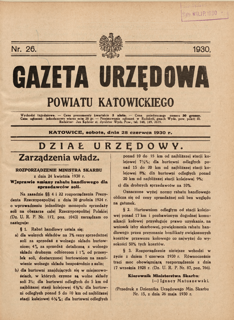 GAZETA URZĘDOWA POWIATU KATOWICKIEGO Wychodzi tygodniowe. — Cena prenumeraty kwartaleie 3 złote. — Cena pojedynczego numeru 30 groezy. Cena ogioezeń: jednołamowy wiersz m/m 20 gr. — Przyjmowanie ogłoszeń w Redakcji, gmach Wydź. pow. pokój 36. Redaktor: Jan Kędzior st. dyrektor Wydz. Pow., teł. 148, 149, 2619. KATOWICE, sobota, dnia 28 czerwca 1930 r. DZIAŁ URZĘDOWY. ponad 10 do 15 km od najbliższej stacji ko Zarządzenia władz. lejowej 7%%; dla hurtowni odległych po ROZPORZĄDZENIE MINISTRA SKARBU z dnia 24 kwietnia 1930 r. WJsprawie zmiany rabatu handlowego dla sprzedawców soli. Na zasadzie §§ 4 i 22 rozporządzenia Prezy denta Rzeczypospolitej z dnia 30 grudnia 1924 r. o wprowadzeniu jednolitego monopolu sprzedaży soli na obszarze całej Rzeczypospolitej Polskiej (Dz. U. R. P. Nr. 117, poz. 1043) zarządzam co następuje: § 1. Rabat handlowy ustala się; a) dla wolnych składów na 3% ceny sprzedażnej soli za sprzedaż z wolnego składu hurtow niom; 4% za sprzedaż detaliczną z wolnego składu drobnym odbiorcom i 1 % od przesy łek soli, dostarczonej hurtowniom na zamó wienie wolnego składu bezpośrednio z salin; b) dla hurtowni znajdujących się w miejscowo ściach, w których czynne są wolne składy soli 3%; dla hurtowni odległych do 5 km od najbliższej stacji kolejowej 4%%; dla hurtow ni odległych ponad 5 do 10 km od najbliższej stacji kolejowej dla hurtowni odległych nad 15 do 20 km od najbliższej stacji ko lejowej 8%; dla hurtowni odległych ponad 20 km od najbliższej stacji kolejowej 9%; c) dla drobnych sprzedawców na 10%. Oznaczone wyżej normy rabatu handlowego oblicza się od ceny sprzedażnej soli bez względu na gatunek. § 2. Hurtowniom odległym od stacji kolejo wej ponad 17 km i pozbawionym dogodnej komu nikacji kołowej przysługuje prawo uzyskania, na wniosek izby skarbowej, powiększenia rabatu han dlowego przez przyznanie bonifikaty zwiększonych kosztów przewozu kołowego co najwyżej do wy sokości 50% tych kosztów. § 3. Rozporządzenie niniejsze wchodzi w życie z dniem 1 czerwca 1930 r. Równocześnie traci moc obowiązującą rozporządzenie z dnia 17 września 1928 r. (Dz. U. R. P. Nr. 87, poz. 766). Kierownik Ministerstwa Skarbn: (—) Ignacy Matuszewski. (Przedruk z Dziennika Urzędowego Min. Skarbu Nr. 15, z dnia 26 maja 1930 r. Str. 134. Gazeta Urzędowa Pow. Katowickiego. Obwieszczenia urzędowe. OKÓLNIK MINISTERSTWA SKARBU z dnia 30 kwietnia 1930 r. w sprawie zawieszenia wymiaru i poboru podatku od kapitałów i rent. Do wszystkich Izb Skarbowych i Śląskiego Urzędu Wojewódzkiego (Wydział Skarbowy). W związku z wątpliwościami, jakie powstały przy stosowaniu ustawy z dnia 16 lutego 1930 r 0 ulgach podatkowych dla kapitałów (Dz. U. R. P" Nr. 10, poz. 67) — Ministerstwo Skarbu wyjaśnia że powyższą ustawą zawieszony został, z dniem 1 stycznia 1930 r., wymiar i pobór podatku od ka pitałów i rent od przychodów, wymienionych w art. 2 ustęp 1, 2 i 3 ustawy z dnia 16 lipca 1920 r. o podatku od kapitałów i rent (Dz. U. R. P. Nr. 76, poz. 517). Wspomniane zatem przychody, jeżeli biegną od dnia 1 stycznia 1930 roku nie pddlegają opodatkowaniu, natomiast przychody, które biegną do dnia 31 grudnia 1929 roku włącznie, podlegają podatkowi od kapitałów i rent, chociażby nawet ustawowy termin płatności przypadał po dniu 1 sty cznia 1930 xDyrektor Departamentu: (—) W. K o s z k o. (Przedruk z Dziennika Urzędowego Min. Skarbu Nr. 15, z dnia 26 maja 1930 r. ŚLĄSKI URZĄD WOJEWÓDZKI L. B. G. 1421/2. Katowice, dnia 28 maja 1930 r. OGŁOSZENIE dotyczące opłaty stemplowej od podania o wydanie kuponów od papierów warto ściowych złożonych w kasach państwo wych. Ministerstwo Spraw Wewnętrznych reskryp tem Nr. O. B. 3933 z 9. V. 1930 r. w sprawie po wyższej oznajmiło zgodnie okólnikiem Ministerstwa Skarbu, że podanie o wydanie kuponów od pa pierów wartościowych, złożonych jako depozyt w kasie państwowej na zabezpieczenie należności Skarbu Państwa ((należności mogącej wyniknąć z umowy zawartej ze Skarbem Państwa, należności z tytułu podatku spożywczego, cła i t. d.), nie podlega opłacie stemplowej, a mianowicie na mo cy art. 141 (punkt 13) ustawy z dnia 1. lipca Nr. 26. 1926 r. o opłatach stemplowych (Dz. U. R. P> Nr. 98, poz. 570). (—) Piech aczek, p. o. Kierownika Wydziału BG. (Przedruk z Gazety Urzędowej Woj. ŚI, Nr. 20, z dnia 16 czerwca 1930 r. Komunikaty. Różnica dodatku mieszkaniowego z r. 1928. Odpowiedź na zapytanie: Okólnik Min. Skarbu z 14 lutego 1930 roku 1. dz. III 310/1/30 do wszystkich władz centralnych zawiera w tej kwestji wyraźne rozstrzygnięcie, a mianowicie, że miarodajną przy obliczaniu różnicy dodatku mieszkaniowego za rok 1928 jest grupa uposażenia, stan rodzinny (prawo do dodatku eko nomicznego) i miejsce służbowe danej osoby w lutym 1930. Chociaż zatem urzędnik ożenił się dopiero w r. 1929 czy 1930 t. j. do lutego 1930 r. włącznie, to otrzymuje różnicę dodatku mieszkaniowego, tak jak żonaty. Analogicznie otrzymuje dodatek ten według wyższej grupy uposażenia oraz według większej lub mniejszej miejscowości, o ile w tym względzie nastąpiła zmiana w tym czasie. IV. W kwestji, czy przy konkubinacie zachodzi publiczne zgorszenie, uzasadniające wkroczenie władzy policyjnej na podstawie § 10 tyt. 17 część II pruskiego Ogólnego Prawa Krajowego miarodaj ną jest opinja publiczna, na danym terytorjum, a do ustalenia opinji, jak z natury rzeczy wynika — po wołana jest miejscowa władza administracji ogólnej (18. 10. 1929 r. L. Rej. 2926/27 i 1927/28). (Wyciąg z „Wiadomości Samorządowe" z dnia 1 czerwca 1930 r. Nr. ll str. 173). V. Czas trwania prawa użytkowania wody, stwierdzonego na zasadzie art. 253 ust. drugi usta wy wodnej, jest określony w samym tym przepi sie, a wobec tego nie jest dopuszczalne ogranicze nie tego prawa orzeczeniem władzy na pewien czasokres) 13. 9. 1929 r. - L. Rej. 2890/