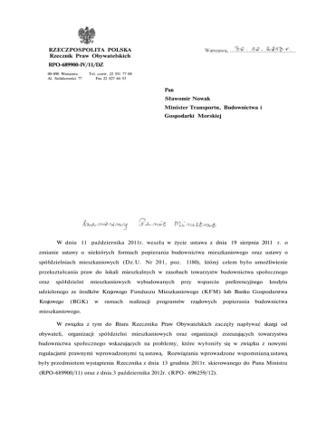 RZECZPOSPOLITA POLSKA Rzecznik Praw Obywatelskich RPO-689900-IV/11/DZ 00-090 Warszawa Al. Solidarności 77 Tel. centr. 22 551 77 00 Fax 22 827 64 53 Pan Sławomir Nowak Minister Transportu, Budownictwa i Gospodarki Morskiej W dniu 11 października 2011r. weszła w życie ustawa z dnia 19 sierpnia 2011 r. o zmianie ustawy o niektórych formach popierania budownictwa mieszkaniowego oraz ustawy o spółdzielniach mieszkaniowych (Dz.U. Nr 201, poz. 1180), której celem było umożliwienie przekształcania praw do lokali mieszkalnych w zasobach towarzystw budownictwa społecznego oraz spółdzielni mieszkaniowych wybudowanych przy wsparciu preferencyjnego kredytu udzielonego ze środków Krajowego Funduszu Mieszkaniowego (KFM) lub Banku Gospodarstwa Krajowego (BGK) w ramach realizacji programów rządowych popierania budownictwa mieszkaniowego. W związku z tym do Biura Rzecznika Praw Obywatelskich zaczęły napływać skargi od obywateli, organizacji spółdzielni mieszkaniowych oraz organizacji zrzeszających towarzystwa budownictwa społecznego wskazujących na problemy, które wyłoniły się w związku z nowymi regulacjami prawnymi wprowadzonymi tą ustawą. Rozwiązania wprowadzone wspomnianą ustawą były przedmiotem wystąpienia Rzecznika z dnia 13 grudnia 2011r. skierowanego do Pana Ministra (RPO-689900/11) oraz z dnia 3 października 2012r. (RPO- 696259/12). 2 W wystąpieniu z dnia 13 grudnia 20l1r. Rzecznik Praw Obywatelskich poruszył problem podniesiony przez Związek Rewizyjny Spółdzielni Mieszkaniowych RP w skardze skierowanej do Rzecznika, dotyczący prawnej dopuszczalności przekształcania praw do lokali mieszkalnych wybudowanych przez spółdzielnie mieszkaniowe z udziałem środków pochodzących z kredytu udzielonego przez Mieszkaniowego lub Bank Gospodarstwa w ramach Krajowego realizacji ze środków Krajowego Funduszu rządowych programów popierania budownictwa mieszkaniowego, a konkretnie - niespójnych regulacji prawnych obowiązujących w omawianym zakresie. Warto nadmienić, że w świetle art. 15a ust. 1 i 2 ustawy o niektórych formach popierania budownictwa mieszkaniowego, kredyty preferencyjne udzielane przez Bank Gospodarstwa Krajowego ze środków Krajowego Funduszu Mieszkaniowego przeznaczone były na realizację przedsięwzięć inwestycyjno-budowlanych przez towarzystwa budownictwa społecznego i spółdzielnie mieszkaniowe. Przedsięwzięcia te obejmowały budynki z lokalami mieszkalnymi na wynajem lub oddawanymi do użytku na zasadach spółdzielczego lokatorskiego prawa do lokalu, bez możliwości ich wyodrębnienia na własność lub przekształcenia spółdzielczego lokatorskiego prawa do lokalu w prawo spółdzielcze własnościowe. Do dnia 10 października 2011r. obowiązywał przepis art. 12' ust. 2 ustawy z dnia 15 grudnia 2000r. o spółdzielniach mieszkaniowych (Dz.U. z 2003r. Nr 119, poz. 1116 ze zm.), zgodnie z którym niedopuszczalne było przeniesienie przez spółdzielnię na inną osobę własności lokalu mieszkalnego oraz ustanowienie spółdzielczego własnościowego prawa do lokalu w budynku wybudowanym z udziałem środków pochodzących z kredytu udzielonego przez Bank Gospodarstwa Krajowego ze środków Krajowego Funduszu Mieszkaniowego lub w ramach realizacji rządowych programów popierania budownictwa mieszkaniowego. Na mocy art. 2 pkt 2 wspomnianej na wstępie ustawy o zmianie ustawy o niektórych formach popierania budownictwa mieszkaniowego oraz ustawy o spółdzielniach mieszkaniowych, przepis art. 12' ust. 2 został uchylony z dniem 11 października 2011r. Oznacza to, że w przypadku spółdzielni mieszkaniowych finansujących ze środków KFM/BGK budowę mieszkań, do których lokatorzy posiadają spółdzielcze lokatorskie prawo do lokalu mieszkalnego, procedura przekształcania praw do mieszkań winna być oparta na zasadach określonych w art. 12 ustawy o spółdzielniach mieszkaniowych. Jednocześnie na mocy art. 2 pkt 1 ustawy nowelizującej, w art. 12 ustawy o spółdzielniach mieszkaniowych po ust. 12 został dodany ust. 13 , zgodnie z którym w przypadku lokalu mieszkalnego wybudowanego z udziałem kredytu udzielonego przez Bank Gospodarstwa Krajowego ze środków Krajowego Funduszu 3 Mieszkaniowego, spłata przypadającej na ten lokal części umorzenia kredytu, o której mowa w ust. 1 pkt 1, podlega odprowadzeniu przez spółdzielnię mieszkaniową do Funduszu Dopłat, o którym mowa w ustawie z dnia 5 grudnia 2002 r. o dopłatach do oprocentowania kredytów mieszkaniowych o stałej stopie procentowej (Dz. U. Nr 230, poz. 1922 ze zm.). Jednakże mimo uchylenia z dniem 11 października 2011r. zakazu przenoszenia przez spółdzielnię na inną osobę własności lokalu mieszkalnego oraz ustanawiania spółdzielczego własnościowego prawa do lokalu w budynku wybudowanym z udziałem środków pochodzących z kredytu udzielonego przez Bank Gospodarstwa Krajowego ze środków Krajowego Funduszu Mieszkaniowego lub w ramach mieszkaniowego zawartego w art. realizacji rządowych programów popierania budownictwa 12' ust. 2 ustawy o spółdzielniach mieszkaniowych, w niezmienionym brzmieniu pozostał zakaz ustanawiania odrębnej własności lokali mieszkalnych wybudowanych ze wsparciem środków publicznych (preferencyjnego kredytu udzielonego przez Krajowy Fundusz Mieszkaniowy lub Bank Gospodarstwa Krajowego) wynikający z art. 15e ust. 2 ustawy z dnia 26 października 1995 r. o niektórych formach popierania budownictwa mieszkaniowego (Dz.U. z 2000 r., Nr 98, poz. 1070 ze zm.), oraz zakaz wynikający z art. 17 ust. 3 ustawy z dnia 2 kwietnia 2009r. o zmianie ustawy o poręczeniach i gwarancjach udzielanych przez Skarb Państwa oraz niektóre osoby prawne, ustawy o Banku Gospodarstwa Krajowego oraz niektórych innych ustaw (Dz.U. Nr 65, poz. 545). Zgodnie z postanowieniami art. budownictwa mieszkaniowego, lokale 15e ust. 2 ustawy o niektórych formach popierania mieszkalne wybudowane przy wykorzystaniu preferencyjnego k