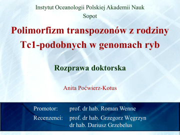 Instytut Oceanologii Polskiej Akademii Nauk Sopot Polimorfizm transpozonów z rodziny Tc1-podobnych w genomach ryb Rozprawa doktorska Anita Poćwierz-Kotus Promotor: prof. dr hab. Roman Wenne Recenzenci: prof. dr hab. Grzegorz Węgrzyn dr hab. Dariusz Grzebelus Wprowadzenie Elementy transpozonowe Transpozony są odcinkami DNA zdolnymi do zmiany miejsca położenia w genomie. Transpozony mają znaczący udział w składzie prokariotycznych i eukariotycznych genomów, a zakres ich występowania obejmuje prawie wszystkie zbadane organizmy. Dzięki zdolności do transpozycji elementy te mogą rozprzestrzeniać się zarówno w obrębie pojedynczej komórki poprzez kopiowanie się w nowych miejscach genomu, jak i między osobnikami wewnątrz populacji, a także pomiędzy gatunkami w procesie horyzontalnego transferu (HT). Wprowadzenie Elementy transpozonowe Eukariotyczne elementy transpozonowe I klasa: retrotranspozony II klasa: transpozony DNA mechanizm transpozycji „copyand-paste” w transpozycji uczestniczy RNA gen kodujący odwrotną transkryptazę LTR LTR gag RT RH IN mechanizm transpozycji „cutand-paste” gen kodujący transpozazę odwrócone terminalne powtórzenia - ITR (ang. inverted terminal repeat) ITR ITR gen transpozazy Wprowadzenie Transpozony Tc1 Jedną z rodzin TE klasy II jest rodzina transpozonów Tc1-podobnych, homologiczna do sekwencji Tc1 u nicienia Caenorhabditis elegans. Występuje ona w genomach wielu gatunków zwierząt, szczególnie zaś rozpowszechniona jest w genomach ryb i płazów. Większość kopii transpozonów Tc1 z powodu wielokrotnych mutacji jest nieaktywna i występuje w postaci stałych składników genomu (tzw. genetyczna skamieniałość). RT Wprowadzenie Horyzontalny transfer HT - zjawisko umożliwiające transmisję TE od jednego gatunku gospodarza do innego, za pośrednictwem wektora. HT aktywnego transpozonu Wzrost liczby kopii Kolonizacja genomowego DNA Rozprzestrzenienie w populacji Gatunek A Stochastyczna utrata Kolejny HT Wertykalna inaktywacja Kolejny HT Mutacje punktowe Gatunek C Gatunek B Wprowadzenie Horyzontalny transfer Doniesienia w pracy Leavera (2001) o HT u ryb i płazów: RT Kompletna kopia transpozonu Tc1-podobnego zidentyfikowana w genomie Pleuronectes platessa może świadczyć o zachowaniu zdolności do transpozycji tego transpozonu. Obecność spokrewnionych transpozonów z rodziny Tc1podobnych w genomach Pleuronectes platessa, Salmo salar, Rana temporaria, czyli gatunków, których dywergencja nastąpiła ponad 400 mln lat temu może świadczyć o horyzontalnej transmisji tego transpozonu. Cele pracy Zbadanie zakresu występowania transpozonów z rodziny Tc1-podobnych w genomach różnych gatunków ryb. Określenie polimorfizmu i uzyskanie charakterystyki sekwencji transpozonów Tc1-podobnych w badanych gatunkach ryb. Przeprowadzenie analizy filogenetycznej transpozonów Tc1-podobnych zidentyfikowanych w genomach ryb. Wykazanie możliwości zajścia horyzontalnego transferu u wybranych gatunków ryb. Opracowanie metodyki określania miejsc integracji transpozonów Tc1-podobnych w genomach ryb. Metody Pobór prób Badaniami objętych było 495 osobników należących do 36 gatunków ryb zasiedlających wody słone i słodkie. Najliczniejszą grupę stanowili przedstawiciele rodzin: Pleuronectidae – 179 osobników: Scophthalmidae – 82 osobniki: Scophthalmus maximus Percidae – 54 osobniki: Platichthys flesus Pleuronectes platessa Perca fluviatilis Liczebnościowo mniejsze grupy stanowili przedstawiciele rodzin: Esocidae, Cyprinidae, Poeciliidae, Anguillidae, Scorpaenidae. Salmonidae, Clupeidae, Dasyatidae, Scombridae, Gobidae, Belonidae, Ophidiidae, Gempylidae, Merlucciidae, Gadidae, Channichthyidae, Carangidae, Metody Polimorfizm transpozonów Tc1-podobnych Izolacja DNA Trawienie enzymami restrykcyjnymi Amplifikacja PCR Startery komplementarne do genu transpozazy RFLP Pojedynczy starter komplementarny do ITR Klonowanie do wektora pGEM3Zf(+) Sekwencjonowanie Analiza bioinformatyczna sekwencji Transfer DNA na membranę nylonową Hybrydyzacja z sondą specyficzną do fragmentu genu transpozazy Metody Identyfikacja miejsc insercji transpozonów Tc1-podobnych Izolacja DNA Trawienie enzymami restrykcyjnymi Ligacja fragmentów restrykcyjnych Odwrotna reakcja PCR (ang. inverse PCR) Ponowna reakcja PCR (rePCR) Sekwencjonowanie Obróbka bioinformatyczna sekwencji Wyniki Zakres występowania transpozonów Tc1-podobnych w genomach różnych gatunków ryb Analiza przesiewowa przy pomocy techniki PCR Liczba przebadanych gatunków – 36 Liczba przebadanych osobników – 495 starter I (1) starter I (1630) produkt produktPCR PCR(1630 (1630pz) pz) starter APK1 (407) starter APK2 (1220) produkt PCR (814 pz) ITR gen transpozazy ITR Wyniki Zakres występowania transpozonów Tc1-podobnych w genomach różnych gatunków ryb Dystrybucja transpozonów Tc1-podobnych w genomach wybranych gatunków ryb oszacowana dzięki amplifikacji PCR z pojedynczym starterem I. A 1 B 2 C 3 4 5 D 6 7 8 E F B G F E F H F H I 9 10 11 12 13 14 15 16 17 18 19 20 21 22 23 24 3530 1904 1584 1375 947 564 A - P. platessa B - P. flesus C - S. salar D - H. platessoides E - R. hippoglossoides F - E. lucius G - S. maximus H - S. lucioperca I - C. harrengus (I) Wyniki Zakres występowania transpozonów Tc1-podobnych w genomach różnych gatunków ryb Dystrybucja transpozonów Tc1-podobnych w genomach różnych gatunków ryb oszacowana z zastosowaniem amplifikacji PCR z parą starterów komplementarnych do genu Tnp. M P. platessa P. flesus S. trutta fario M 947 564 90 Platichthys flesus Pleuronectes platessa Salmo trutta fario Salmo trutta trutta Anguilla anguilla Salmo salar Esox lucius Scophthalmus maximus Stizostedion lucioperca Limanda aspera Neogobius melanostomus Blicca bjoerkna Danio rerio Clupea harengus Sprattus sprattus Belone belone Theragra chalcogramma Poecilia sphenops Thunnus albacares Megalaspis cordyla Perca fluviatilis Abramis brama Urogymnus asperrimus H