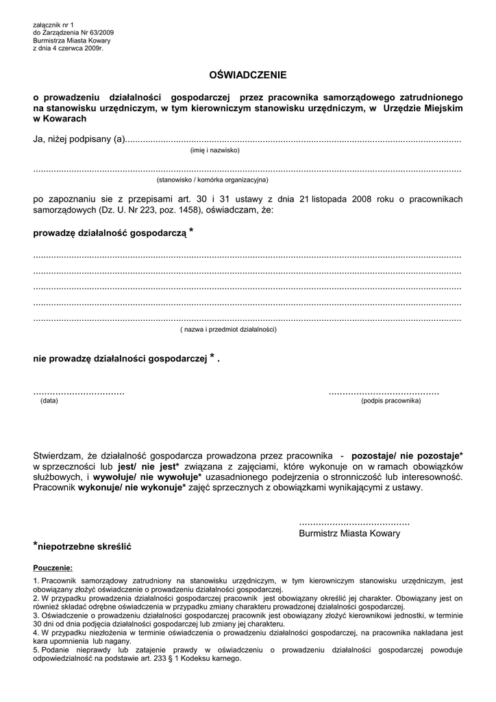 załącznik nr 1 do Zarządzenia Nr 63/2009 Burmistrza Miasta Kowary z dnia 4 czerwca 2009r. OŚWIADCZENIE o prowadzeniu działalności gospodarczej przez pracownika samorządowego zatrudnionego na stanowisku urzędniczym, w tym kierowniczym stanowisku urzędniczym, w Urzędzie Miejskim w Kowarach Ja, niżej podpisany (a).................................................................................................................................... (imię i nazwisko) ........................................................................................................................................................................ (stanowisko / komórka organizacyjna) po zapoznaniu sie z przepisami art. 30 i 31 ustawy z dnia 21 listopada 2008 roku o pracownikach samorządowych (Dz. U. Nr 223, poz. 1458), oświadczam, że: prowadzę działalność gospodarczą * ........................................................................................................................................................................ ........................................................................................................................................................................ ........................................................................................................................................................................ ........................................................................................................................................................................ ........................................................................................................................................................................ ( nazwa i przedmiot działalności) nie prowadzę działalności gospodarczej * . ................................. (data) ........................................ (podpis pracownika) Stwierdzam, że działalność gospodarcza prowadzona przez pracownika - pozostaje/ nie pozostaje* w sprzeczności lub jest/ nie jest* związana z zajęciami, które wykonuje on w ramach obowiązków służbowych, i wywołuje/ nie wywołuje* uzasadnionego podejrzenia o stronniczość lub interesowność. Pracownik wykonuje/ nie wykonuje* zajęć sprzecznych z obowiązkami wynikającymi z ustawy. ........................................ Burmistrz Miasta Kowary *niepotrzebne skreślić Pouczenie: 1. Pracownik samorządowy zatrudniony na stanowisku urzędniczym, w tym kierowniczym stanowisku urzędniczym, jest obowiązany złożyć oświadczenie o prowadzeniu działalności gospodarczej. 2. W przypadku prowadzenia działalności gospodarczej pracownik jest obowiązany określić jej charakter. Obowiązany jest on również składać odrębne oświadczenia w przypadku zmiany charakteru prowadzonej działalności gospodarczej. 3. Oświadczenie o prowadzeniu działalności gospodarczej pracownik jest obowiązany złożyć kierownikowi jednostki, w terminie 30 dni od dnia podjęcia działalności gospodarczej lub zmiany jej charakteru. 4. W przypadku niezłożenia w terminie oświadczenia o prowadzeniu działalności gospodarczej, na pracownika nakładana jest kara upomnienia lub nagany. 5. Podanie nieprawdy lub zatajenie prawdy w oświadczeniu o prowadzeniu działalności gospodarczej powoduje odpowiedzialność na podstawie art. 233 § 1 Kodeksu karnego.