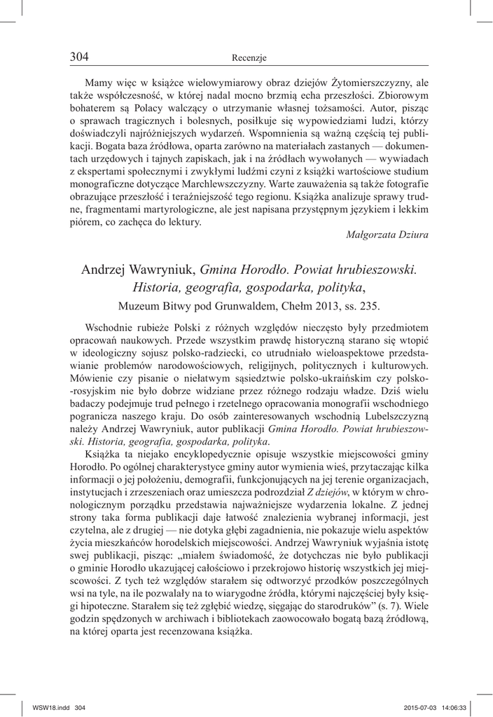 304 Recenzje Mamy więc w książce wielowymiarowy obraz dziejów Żytomierszczyzny, ale także współczesność, w której nadal mocno brzmią echa przeszłości. Zbiorowym bohaterem są Polacy walczący o utrzymanie własnej tożsamości. Autor, pisząc o sprawach tragicznych i bolesnych, posiłkuje się wypowiedziami ludzi, którzy doświadczyli najróżniejszych wydarzeń. Wspomnienia są ważną częścią tej publikacji. Bogata baza źródłowa, oparta zarówno na materiałach zastanych — dokumentach urzędowych i tajnych zapiskach, jak i na źródłach wywołanych — wywiadach z ekspertami społecznymi i zwykłymi ludźmi czyni z książki wartościowe studium monograficzne dotyczące Marchlewszczyzny. Warte zauważenia są także fotografie obrazujące przeszłość i teraźniejszość tego regionu. Książka analizuje sprawy trudne, fragmentami martyrologiczne, ale jest napisana przystępnym językiem i lekkim piórem, co zachęca do lektury. Małgorzata Dziura Andrzej Wawryniuk, Gmina Horodło. Powiat hrubieszowski. Historia, geografia, gospodarka, polityka, Muzeum Bitwy pod Grunwaldem, Chełm 2013, ss. 235. Wschodnie rubieże Polski z różnych względów nieczęsto były przedmiotem opracowań naukowych. Przede wszystkim prawdę historyczną starano się wtopić w ideologiczny sojusz polsko-radziecki, co utrudniało wieloaspektowe przedstawianie problemów narodowościowych, religijnych, politycznych i kulturowych. Mówienie czy pisanie o niełatwym sąsiedztwie polsko-ukraińskim czy polsko-rosyjskim nie było dobrze widziane przez różnego rodzaju władze. Dziś wielu badaczy podejmuje trud pełnego i rzetelnego opracowania monografii wschodniego pogranicza naszego kraju. Do osób zainteresowanych wschodnią Lubelszczyzną należy Andrzej Wawryniuk, autor publikacji Gmina Horodło. Powiat hrubieszowski. Historia, geografia, gospodarka, polityka. Książka ta niejako encyklopedycznie opisuje wszystkie miejscowości gminy Horodło. Po ogólnej charakterystyce gminy autor wymienia wieś, przytaczając kilka informacji o jej położeniu, demografii, funkcjonujących na jej terenie organizacjach, instytucjach i zrzeszeniach oraz umieszcza podrozdział Z dziejów, w którym w chronologicznym porządku przedstawia najważniejsze wydarzenia lokalne. Z jednej strony taka forma publikacji daje łatwość znalezienia wybranej informacji, jest czytelna, ale z drugiej — nie dotyka głębi zagadnienia, nie pokazuje wielu aspektów życia mieszkańców horodelskich miejscowości. Andrzej Wawryniuk wyjaśnia istotę swej publikacji, pisząc: „miałem świadomość, że dotychczas nie było publikacji o gminie Horodło ukazującej całościowo i przekrojowo historię wszystkich jej miejscowości. Z tych też względów starałem się odtworzyć przodków poszczególnych wsi na tyle, na ile pozwalały na to wiarygodne źródła, którymi najczęściej były księgi hipoteczne. Starałem się też zgłębić wiedzę, sięgając do starodruków” (s. 7). Wiele godzin spędzonych w archiwach i bibliotekach zaowocowało bogatą bazą źródłową, na której oparta jest recenzowana książka. WSW18.indd 304 2015-07-03 14:06:33 Recenzje 305 Osoby, które sięgną po Gminę Horodło. Powiat hrubieszowski, dowiedzą się o jej wielkości i przyrodniczych walorach, poznają miejscowości administracyjnie do niej przynależące: Bereźnica, Cegielnia, Ciołki, Horodło, Hrebenne, Janki, Kobło Kolonia, Kopyłów, Liski, Łuszków, Matcze, Poraj, Rogalin, Strzyżów, Zosin. Inspiracją do wydania książki była 600. rocznica unii horodelskiej przypadająca w 2013 roku. Wawryniuk przedstawia relację Jana Długosza i Joachima Lelewela z podpisania porozumienia polsko-litewskiego w 1413 roku w celu wspólnego wystąpienia przeciwko Krzyżakom, posiłkuje się opracowaniami historyków, które przybliżają znaczenie unii dla obydwu narodów. Zauważa: „unia Litwy z Polską […], miała bowiem nie tylko podstawę polityczną, lecz i kulturalną i chrześcijańską, opartą na równości praw i wolności obu narodów […]. Unia horodelska miała wielkie znaczenie dla obydwu krajów, bo zapewniała im większe bezpieczeństwo i obronę, dla Litwy była nader korzystna, bo przenosiła do tego kraju instytucje polskie, mianowicie podział administracyjny kraju na województwa i kasztelanie, jak również demokrację szlachecką, czyli równość szlachecką” (s. 36). Z wielu ważnych wydarzeń na Lubelszczyźnie wschodniej autor odnotował powstanie parafii greckokatolickich w poszczególnych wsiach, znaczenie Bugu dla społeczności lokalnej, wydarzenia wojenne i powojenne, niejednoznaczność przynależności państwowej niektórych wsi, na przykład „Ogólny ostateczny protokół przebiegu granicy państwowej między Polską a Związkiem Socjalistycznych Republik Radzieckich, zgodnie z […] załącznikami z dnia 30 kwietnia 1947 roku […] Bereźnica […] przyznana została Polsce” (s. 17), a także „W 1952 roku ZSRR zwrócił się do Polski z propozycją zamiany terenów. Proponowany do zamiany teren miał obejmować od 1250 do 1300 km 2. Sowietom chodziło praktycznie o całą wschodnią część powiatu hrubieszowskiego z Hrubieszowem i między innymi z Cegielnią” (s. 23). Okres II wojny światowej był dla mieszkańców ziem nadbużańskich, podobnie jak i innych rejonów, czasem strachu i nieustannego zagrożenia ze strony Niemców, ale też Ukraińców. Autor zwraca uwagę, że mimo zdecydowanej ofensywy oddziałów UPA gmina Horodło nie została dotknięta żadną większą akcją dzięki wójtowi, który był Ukraińcem (s. 76). Andrzej Wawryniuk zdecydował się na przedstawienie dziejów miejscowości gminy Horodło według dat, więc pewne zagadnienia, na przykład wydarzenia wojenne, są poszatkowane i przeplecione innymi informacjami. Nie ma ciągłości narracyjnej. Na dodatek występuje wiele powtórzeń wynikających ze wspólnej historii tych terenów. Autor p