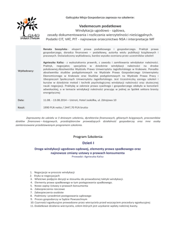 Galicyjska Misja Gospodarcza zaprasza na szkolenie: Vademecum podatkowe Windykacja ugodowo - sądowa, zasady dokumentowania i rozliczania wierzytelności nieściągalnych. Podatki CIT, VAT, PIT - najnowsze orzecznictwo NSA i interpretacje MF Renata Soszyńska - ekspert prawa podatkowego i gospodarczego. Praktyk prawa gospodarczego, doradca finansowo – podatkowy, autorka wielu publikacji książkowych i prasowych. Doświadczony wykładowca, bardzo wysoko oceniana przez uczestników szkoleń Wykładowcy: Agnieszka Kalisz - z wykształcenia prawnik, z zawodu i zamiłowania windykator należności. Praktyk, negocjator, specjalista w dziedzinie windykacji należności na drodze polubownej.Absolwentka Wydziału Prawa Uniwersytetu Jagiellońskiego w Krakowie. Ponadto absolwentka studiów podyplomowych na Wydziale Prawa Gospodarczego Uniwersytetu Ekonomicznego w Krakowie oraz Studiów podyplomowych na Wydziale Prawa Pracy i Ubezpieczeń Społecznych Uniwersytetu Jagiellońskiego. Jest Uczestniczką szeregu szkoleń i kursów w dziedzinie metod i technik psychologicznej windykacji należności oraz skutecznej nauki negocjacji. Praktykę w zakresie prawa cywilnego i gospodarczego zdobyła w kancelarii adwokackiej, a w temacie windykacji należności pracując w jednej ze Spółek sektora branży energetycznej Data: 11.08. - 13.08.2014 – Ustroń, Hotel Jaskółka, ul. Zdrojowa 10 Koszt: 1990 PLN netto / 2447,70 PLN brutto Zapraszamy do udziału w 3 dniowym szkoleniu, dyrektorów finansowych, głównych księgowych, pracowników działów finansowo – księgowych, przedsiębiorców prowadzących działalność gospodarczą oraz inne osoby zainteresowane przedstawionym programem szkolenia. Program Szkolenia: Dzień I Droga windykacji ugodowo-sądowej, elementy prawa spadkowego oraz najnowsze zmiany ustawy o prawach konsumenta Prowadzi: Agnieszka Kalisz 1. Negocjacje w procesie windykacji 2. Etyka w negocjacjach 3. Właściwe podjęcie decyzji w stosunku do prowadzonej taktyki windykacji. 4. Elementy prawa spadkowego w tym postępowania spadkowego. 5. Nowe zapisy Ustawy o prawach konsumenta 6. Zabezpieczenia rzeczowe 7. Zabezpieczenia osobiste 8. Podmioty i przedmiot postępowania sądowego 9. Proces gospodarczy w Sądzie Powszechnym 10. Czynności egzekucyjne prowadzone przez wierzyciela przed wszczęciem procedury egzekucyjnej 11. Dodatkowe działania wierzyciela, celem których jest uzyskanie wpłaty należnej kwoty. CIT - zasady dokumentowania i rozliczania wierzytelności nieściągalnych oraz rozliczania kosztów w zakresie niespełnionych zobowiązań na gruncie przepisów ustawy o podatku dochodowym od osób prawnych Prowadzi: Renata Soszyńska I. Jak należy udokumentować nieściągalność wierzytelności i w jakim czasie należy podejmować określony rodzaj działań. 1. Negatywne skutki doprowadzenia do przedawnienia ściągalności wierzytelności. 2. Kiedy można tworzyć odpis z tytułu uprawdopodobnionej nieściągalności w koszty podatkowe uwzględniając; • uprawdopodobnienie nieściągalności na podstawie postanowienia sądu wydanego w postępowaniu upadłościowym lub likwidacyjnym. • uprawdopodobnienie nieściągalności wierzytelności protokołem sporządzonym przez podatnika. • odpisanie wierzytelności jako nieściągalnych a odpis aktualizujący. 3. Instrukcja wewnętrzna określająca zasady postępowania z należnościami zagrożonymi. II. Różnice kursowe. 1. Przepisy regulujące zasady rozliczania różnic kursowych- wyższość przepisów ustaw podatkowych na przepisami rozporządzeń wydanych bez delegacji ustawowej. 2. Uproszczone metody ustalania różnic kursowych powstające przy zakupach krajowych i zagranicznych rozliczanych w walutach obcych. 3. Wskazana ewidencja stosowana przy korekcie kosztów uzyskania przychodów w związku z niezapłaconymi fakturami. 4. Negatywne skutki sanacyjne na gruncie przepisów o korekcie kosztów. III. Orzecznictwo NSA i WSA oraz wykładnia urzędowa Ministerstwa Finansów w sprawach wymienionych w programie szkolenia Dzień II Podatek od towarów i usług w 2014 roku - aktualny stan prawny Prowadzi: Renata Soszyńska 1. Czynności podlegające opodatkowaniu podatkiem od towarów i usług. 2. Istota zmian dotychczasowych definicji ustawowych dotyczących; • definicji nazw faktur, faktury elektronicznej, faktury uproszczonej, • terenów budowlanych ( zmiany w 2013r i od 1.01.2014r), • prezentów o małej wartości i próbek, • zmiana definicji działalności gospodarczej na potrzeby ustawy o VAT, • modyfikacja definicji podatnika, • zmiany definicji podstawy opodatkowania, • likwidacja ustawowej definicji „towaru używanego”, 3. Zmiana w zakresie opodatkowania nieodpłatnych świadczeń , materiałów reklamowych i informacyjnych – istota wartości prezentów oraz przeznaczenia próbek towarów. 4. Istotne zmiany w zakresie zasad i terminów powstania obowiązku podatkowego , w tym uchylenie większości regulacji związanych ze szczególnym momentem powstania obowiązku podatkowego od stycznia 2014r. 5. Przedmiotowe zwolnienia od podatku VAT – rewolucyjne zmiany. 6. Istota zmian w przepisach dotyczących zasad i terminów odliczania podatku naliczonego- sytuacje gdy podatnikowi nie przysługuje prawo odliczenia podatku naliczonego. 7. Nowe zasady w zakresie korzystania z tzw. „ulgi na złe długi”. 8. Częściowe odliczenie podatku oraz korekta podatku naliczonego (art. 90 ustawy), 9. Zmiany w zakresie dokumentowania transakcji objętych VAT- fakturowanie refakturowanie – obowiązek implementacji przepisów Dyrektywy 2006/112/WE z dnia 28.11.2006r. w sprawie wspólnego systemu podatku od wartości dodanej zmienionej Dyrektywą 2010/45/UE z dnia 13 lipca 2010r w zakresie fakturowania do przepisów prawa krajowego a w tym; • przepisy normujące zasady wystawiania, przesyłania oraz przechowywania faktur 1.04.2014r. • nowe warunkowe zwolnienie z obowiązku wystawiania faktur w odniesieni