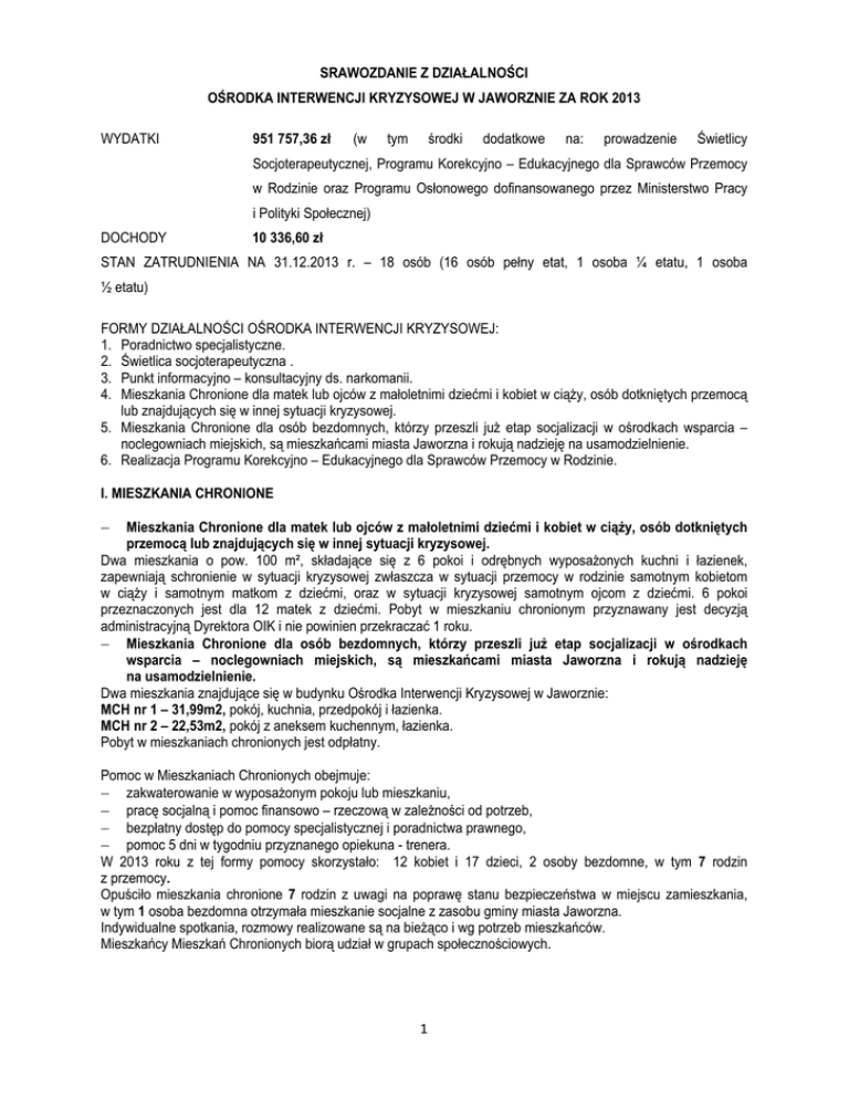 SRAWOZDANIE Z DZIAŁALNOŚCI OŚRODKA INTERWENCJI KRYZYSOWEJ W JAWORZNIE ZA ROK 2013 WYDATKI 951 757,36 zł (w tym środki dodatkowe na: prowadzenie Świetlicy Socjoterapeutycznej, Programu Korekcyjno – Edukacyjnego dla Sprawców Przemocy w Rodzinie oraz Programu Osłonowego dofinansowanego przez Ministerstwo Pracy i Polityki Społecznej) DOCHODY 10 336,60 zł STAN ZATRUDNIENIA NA 31.12.2013 r. – 18 osób (16 osób pełny etat, 1 osoba ¼ etatu, 1 osoba ½ etatu) FORMY DZIAŁALNOŚCI OŚRODKA INTERWENCJI KRYZYSOWEJ: 1. Poradnictwo specjalistyczne. 2. Świetlica socjoterapeutyczna . 3. Punkt informacyjno – konsultacyjny ds. narkomanii. 4. Mieszkania Chronione dla matek lub ojców z małoletnimi dziećmi i kobiet w ciąŜy, osób dotkniętych przemocą lub znajdujących się w innej sytuacji kryzysowej. 5. Mieszkania Chronione dla osób bezdomnych, którzy przeszli juŜ etap socjalizacji w ośrodkach wsparcia – noclegowniach miejskich, są mieszkańcami miasta Jaworzna i rokują nadzieję na usamodzielnienie. 6. Realizacja Programu Korekcyjno – Edukacyjnego dla Sprawców Przemocy w Rodzinie. I. MIESZKANIA CHRONIONE Mieszkania Chronione dla matek lub ojców z małoletnimi dziećmi i kobiet w ciąŜy, osób dotkniętych przemocą lub znajdujących się w innej sytuacji kryzysowej. Dwa mieszkania o pow. 100 m², składające się z 6 pokoi i odrębnych wyposaŜonych kuchni i łazienek, zapewniają schronienie w sytuacji kryzysowej zwłaszcza w sytuacji przemocy w rodzinie samotnym kobietom w ciąŜy i samotnym matkom z dziećmi, oraz w sytuacji kryzysowej samotnym ojcom z dziećmi. 6 pokoi przeznaczonych jest dla 12 matek z dziećmi. Pobyt w mieszkaniu chronionym przyznawany jest decyzją administracyjną Dyrektora OIK i nie powinien przekraczać 1 roku. − Mieszkania Chronione dla osób bezdomnych, którzy przeszli juŜ etap socjalizacji w ośrodkach wsparcia – noclegowniach miejskich, są mieszkańcami miasta Jaworzna i rokują nadzieję na usamodzielnienie. Dwa mieszkania znajdujące się w budynku Ośrodka Interwencji Kryzysowej w Jaworznie: MCH nr 1 – 31,99m2, pokój, kuchnia, przedpokój i łazienka. MCH nr 2 – 22,53m2, pokój z aneksem kuchennym, łazienka. Pobyt w mieszkaniach chronionych jest odpłatny. − Pomoc w Mieszkaniach Chronionych obejmuje: − zakwaterowanie w wyposaŜonym pokoju lub mieszkaniu, − pracę socjalną i pomoc finansowo – rzeczową w zaleŜności od potrzeb, − bezpłatny dostęp do pomocy specjalistycznej i poradnictwa prawnego, − pomoc 5 dni w tygodniu przyznanego opiekuna - trenera. W 2013 roku z tej formy pomocy skorzystało: 12 kobiet i 17 dzieci, 2 osoby bezdomne, w tym 7 rodzin z przemocy. Opuściło mieszkania chronione 7 rodzin z uwagi na poprawę stanu bezpieczeństwa w miejscu zamieszkania, w tym 1 osoba bezdomna otrzymała mieszkanie socjalne z zasobu gminy miasta Jaworzna. Indywidualne spotkania, rozmowy realizowane są na bieŜąco i wg potrzeb mieszkańców. Mieszkańcy Mieszkań Chronionych biorą udział w grupach społecznościowych. 1 II. ŚWIETLICA SOCJOTERAPETYCZNA Pomoc i wsparcie dla dzieci, młodzieŜy oraz rodziców. Praca w grupie obejmuje pomoc w formie uczestnictwa w zajęciach ogólnorozwojowych, profilaktycznych, socjoterapeutycznych, rekreacyjno – ruchowych. W 2013 roku z tej formy pomocy skorzystało: 63 dzieci (na podstawie pisemnych deklaracji rodziców). III. PORADNICTWO SPECJALISTYCZNE DS. ZAPOBIEGANIA NARKOMANII oraz PUNKT INFORMACYJNO – KONSULTACYJNY Usługi bezpłatne świadczone dla mieszkańców Jaworzna. Świadczenia obejmują poradnictwo dla osób uzaleŜnionych od narkotyków i innych środków psychoaktywnych oraz poradnictwo psychologiczne, pedagogiczne, rodzinne i prawne świadczone osobom i rodzinom, które wymagają wsparcia i pomocy specjalistycznej lub mają trudności w rozwiązywaniu swoich problemów rodzinnych. Działania zespołu: − praca indywidualna z osobami w kryzysie – poradnictwo, terapia, interwencja, − praca z dziećmi i ich rodzinami – pomoc indywidualna i grupowa, − poradnictwo w konfliktach małŜeńskich, sytuacjach rozwodu, − współpraca z instytucjami pomagającymi rodzinie w ramach zespołów interdyscyplinarnych, − pomoc prawna, − pomoc i poradnictwo dla osób uzaleŜnionych od narkotyków i innych środków psychoaktywnych, − szkolenia dla pracowników słuŜb społecznych oraz innych instytucji w mieście zgłaszających zapotrzebowanie. STATYSTYKA 1. PORADNICTWO SPECJALISTYCZNE Działania indywidualne: PORADNICTWO Psychologiczno-pedagogiczne Prawne Poradnictwo mailowe PORADNICTWO PRZEMOC Osoby doświadczające przemocy Poradnictwo prawne Poradnictwo mailowe GRUPY ROBOCZE w ramach procedury Niebieska Karta Liczba spotkań / porad Liczba osób 2445 313 - 805 194 33 Liczba spotkań 706 47 - Liczba osób 180 47 4 Liczba spotkań grup roboczych z udziałem pracowników OIK 608 Działania grupowe: PORADNICTWO Psychologiczno – pedagogiczne w tym z przemocy Liczba spotkań 372 Liczba uczestników 3843 Program Osłonowy „Wspieranie Jednostek Samorządu Terytorialnego w Tworzeniu Systemu Przeciwdziałania Przemocy w Rodzinie” Edycja 2013 r. Tytuł Projektu „Jaworzno stawia na Rodzinę – szczęśliwa rodzina – szczęśliwe dziecko” Projekt „Jaworzno stawia na rodzinę – szczęśliwa rodzina – szczęśliwe dziecko” zakładał szereg działań skierowanych do społeczności lokalnej dotyczących zjawiska krzywdzenia dzieci w rodzinach. Podstawą 2 do podejmowanych działań były wyniki raportu z 2011 r. dotyczące badań zjawiska przemocy w rodzinie na terenie miasta Jaworzna realizowanych w programie osłonowym „Jaworzno stawia na rodzinę”. Wyniki raportu pokazały, iŜ osobami, które w największym stopniu dopuszczały się krzywdzenia dzieci byli rodzice lub jedno z nich. Kolejną grupę wskazywaną, jako źródło przemocy wobec dzieci stanowiło rodzeństwo. Ponadto 2% dorosłych badanych osób przyznała, iŜ stosuje kar