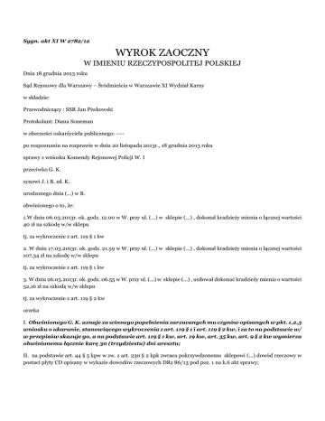 Sygn. akt XI W 2782/12 WYROK ZAOCZNY W IMIENIU RZECZYPOSPOLITEJ POLSKIEJ Dnia 18 grudnia 2013 roku Sąd Rejonowy dla Warszawy – Śródmieścia w Warszawie XI Wydział Karny w składzie: Przewodniczący : SSR Jan Piwkowski Protokolant: Diana Soneman w obecności oskarżyciela publicznego: ---po rozpoznaniu na rozprawie w dniu 20 listopada 2013r., 18 grudnia 2013 roku sprawy z wniosku Komendy Rejonowej Policji W. I przeciwko G. K. synowi J. i B. zd. K. urodzonego dnia (...) w B. obwinionego o to, że: 1.W dniu 06.03.2013r. ok. godz. 12.00 w W. przy ul. (...) w sklepie (...) , dokonał kradzieży mienia o łącznej wartości 40 zł na szkodę w/w sklepu tj. za wykroczenie z art. 119 § 1 kw 2. W dniu 17.03.2013r. ok. godz. 21.59 w W. przy ul. (...) w sklepie (...) , dokonał kradzieży mienia o łącznej wartości 107,34 zł na szkodę w/w sklepu tj. za wykroczenie z art. 119 § 1 kw 3. W dniu 26.03.2013r. ok. godz. 06.55 w W. przy ul. (...) w sklepie (...) , usiłował dokonać kradzieży mienia o wartości 52,16 zł na szkodę w/w sklepu tj. za wykroczenie z art. 119 § 2 kw orzeka I. Obwinionego G. K. uznaje za winnego popełnienia zarzucanych mu czynów opisanych w pkt. 1,2,3 wniosku o ukaranie, stanowiącego wykroczenia z art. 119 § 1 i art. 119 § 2 kw, i za to na podstawie w/ w przepisów skazuje go, a na podstawie art. 119 § 1 kw, art. 19 kw, art. 35 kw, art. 9 § 2 kw wymierza obwinionemu łącznie karę 30 (trzydziestu) dni aresztu; II. na podstawie art. 44 § 5 kpw w zw. z art. 230 § 2 kpk zwraca pokrzywdzonemu sklepowi (...) dowód rzeczowy w postaci płyty CD opisany w wykazie dowodów rzeczowych DRz 86/13 pod poz. 1 na k.6 akt sprawy; III. na podstawie art. 624 § 1 kpk w zw. z art. 119 kpw zwalnia obwinionego w całości od obowiązku zapłaty na rzecz Skarbu Państwa kosztów sądowych i określa, iż wchodzące w ich skład wydatki ponosi Skarb Państwa. Sygn. akt XI W 2782/13 UZASADNIENIE Na podstawie całokształtu zgromadzonego i ujawnionego na rozprawie materiału dowodowego Sad ustalił następujący stan faktyczny: W dniu 06 marca 2013 roku w W. G. K. wszedł do sklepu (...) przy ul. (...). Około godziny 12:00 mężczyznę zauważył pracownik w/w sklepu D. W.. Zaobserwował on, iż mężczyzna ten wziął z działu telekom 3 startery O., po czym udał się na dział Hi- Fi, gdzie schował 2 z nich do tylnej kieszeni spodni a jeden odłożył na półkę. Mężczyzna ten miał około 25 lat, wzrost ok. 180 cm, szczupłej budowy ciała. Był ubrany w jasne spodnie jeansowe, biało- beżową czapkę z daszkiem, okulary i czarną kurtkę. Wówczas D. W. poinformował drogą radiową dowódcę zmiany ochrony. W tym czasie G. K. udał się do wyjścia, gdzie po przejściu linii kas uaktywnił bramki antykradzieżowe i został zatrzymany przez pracownika ochrony a następnie doprowadzony do pokoju służbowego. Tam mężczyzna przyznał się do kradzieży i oddał dwa startery o łącznej wartości 40,00 złotych, które zabrał w celu przywłaszczenia. Następnie wezwano Policję, której przekazano mężczyznę, którym okazał się być G. K.. Towar nieuszkodzony pozostał w sklepie. (zeznania świadka D. W., k. 25v- 26, notatka urzędowa k.21, zawiadomienie o wykroczeniu k. 23-23v, wyjaśnienia obwinionego k.29). W dniu 17 marca 2013 roku w W. G. K., znajdował w sklepie (...) mieszczącym się w W. przy ul. (...). Ok. godz. 21.59 właściciel w/w sklepu, będąc na zapleczu, gdzie zainstalowany jest monitoring- zauważył na nagraniu mężczyznę, który brał do reki butelkę wina, a następnie poszedł do lodówki nabiałowej. Po raz kolejny, gdy M. P. (1) spojrzał na monitor, ponownie zobaczył tego mężczyznę, który tym razem nie miał już w ręku wina. Wówczas właściciel sklepu zaobserwował jak mężczyzna wkłada do swojej „reklamówki” kanapki, lecz nie widział w jego zachowaniu nic podejrzanego bowiem wiele osób tak robi, płacąc później za towary przy kasie. M. P. (2), po raz trzeci, patrząc na w/ w mężczyznę zauważył, iż znowu stoi on przy regale z winami a następnie udał się do kasy. Po wyjściu mężczyzny ze sklepu, M. P. (2) sprawdził kopię paragonu jego zakupów i okazało się, iż mężczyzna ten zapłacił jedynie za piwo. Jak ustalono na podstawie poniżej powołanych dowodów, w tym zapisu monitoringu, mężczyzna dokonał kradzieży na łączną kwotę 107, 34 zł (paragon 4a) następujących produktów spożywczych: 2 szt. Wermut M. (2 x 41,99 zł), kabanosy (1 x 7,49 zł), 3 kanapki (3 x 5,29 zł) (zeznania świadka M. P. (2)( k 3v-4, notatka urzędowa k.1, paragon fiskalny 4a, wyjaśnienia obwinionego k.11). W dniu 26 marca 2013 roku w W. G. K. o godz. 06:48 wszedł ponownie do sklepu (...) znajdującego się w W. przy ul. (...). Ok. godz. 06:55 mężczyzna w ten podszedł do półek i wziął z nich produkty spożywcze tj. 3 kanapki (3x 6,99 zł), sok Cymes (1x 4,49 zł), które schował do papierowej torby, a następnie przykrył je woreczkami foliowymi. Po czym wziął torbę pod pachę i chodził po sklepie, udając, że coś ogląda i chce kupić. Przemieszczając sie po sklepie, przechodził z jednego miejsca w inne i w międzyczasie brał z półek różne produkty spożywcze, które chował do spodni pod kurtką oraz do kieszeni kurtki. Były to następujące artykuły: (...) czarne (1x 2,05 zł), 2 szt. Czekolad Luksusowych W. (2x 5,59 zł i 3 szt. Czekolady K. (3x 13,47 zł), o łącznej wartości 26,70 zł. Następnie z bułką lub pączkiem w ręku mężczyzna udał się do kasy. W tym czasie kasjerka A. M. zamknęła drzwi sklepu, uniemożliwiając mężczyźnie ucieczkę i dzwoniąc na Policję. Mężczyzna ten podczas rozmowy kasjerki z numerem alarmowym zaczął wyjmować z kieszeni rzeczy tj. czekolady i sok Frugo, odkładając je na bok. Po przybyciu na miejsce Policji okazało się, że mężczyzna ma jeszcze przy sobie kanapki i sok Cymes o łącznej wartości 25,46 zł Mężczyzna został 