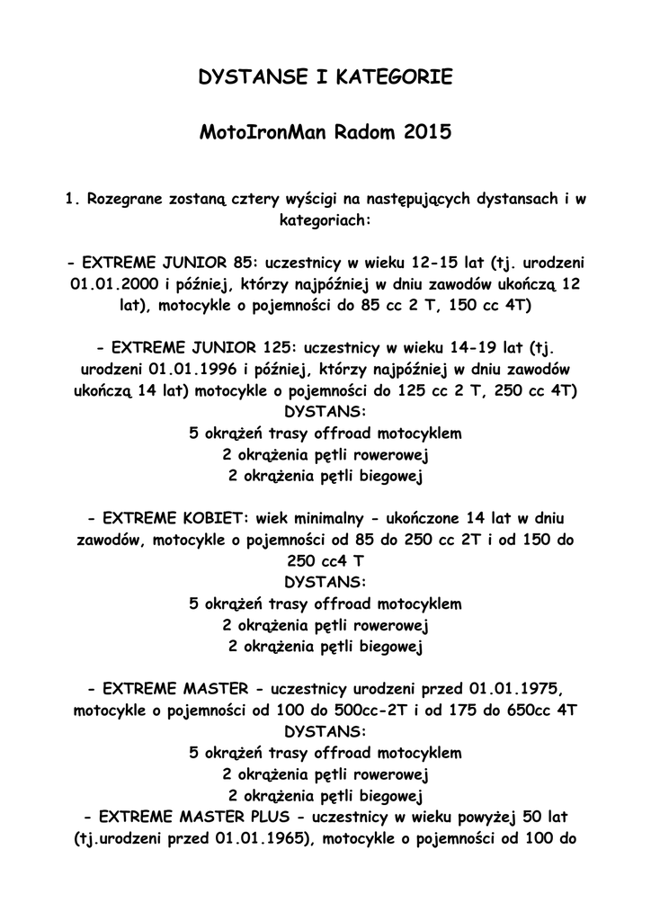 DYSTANSE I KATEGORIE MotoIronMan Radom 2015 1. Rozegrane zostaną cztery wyścigi na następujących dystansach i w kategoriach: - EXTREME JUNIOR 85: uczestnicy w wieku 12-15 lat (tj. urodzeni 01.01.2000 i później, którzy najpóźniej w dniu zawodów ukończą 12 lat), motocykle o pojemności do 85 cc 2 T, 150 cc 4T) - EXTREME JUNIOR 125: uczestnicy w wieku 14-19 lat (tj. urodzeni 01.01.1996 i później, którzy najpóźniej w dniu zawodów ukończą 14 lat) motocykle o pojemności do 125 cc 2 T, 250 cc 4T) DYSTANS: 5 okrążeń trasy offroad motocyklem 2 okrążenia pętli rowerowej 2 okrążenia pętli biegowej - EXTREME KOBIET: wiek minimalny - ukończone 14 lat w dniu zawodów, motocykle o pojemności od 85 do 250 cc 2T i od 150 do 250 cc4 T DYSTANS: 5 okrążeń trasy offroad motocyklem 2 okrążenia pętli rowerowej 2 okrążenia pętli biegowej - EXTREME MASTER - uczestnicy urodzeni przed 01.01.1975, motocykle o pojemności od 100 do 500cc-2T i od 175 do 650cc 4T DYSTANS: 5 okrążeń trasy offroad motocyklem 2 okrążenia pętli rowerowej 2 okrążenia pętli biegowej - EXTREME MASTER PLUS - uczestnicy w wieku powyżej 50 lat (tj.urodzeni przed 01.01.1965), motocykle o pojemności od 100 do 500cc-2T i od 175 do 650cc 4 T DYSTANS: 5 okrążeń trasy offroad motocyklem 2 okrążenia pętli rowerowej 2 okrążenia pętli biegowej - EXTREME – wiek minimalny - ukończone 16 lat w dniu zawodów, motocykle o pojemności od 100 do 500cc-2T i od 175 do 650cc 4 T DYSTANS: 10 okrążeń trasy offroad motocyklem 3 okrążenia pętli rowerowej 3 okrążenia pętli biegowej - EXTREME MAX: wiek minimalny - ukończone 16 lat w dniu zawodów, motocykle o pojemności od 100 do 500cc-2T i od 175 do 650cc 4 T DYSTANS: 15 okrążeń trasy offroad motocyklem 5 okrążeń pętli rowerowej 5 okrążeń pętli biegowej - EXTREME QUAD JUNIOR*: uczestnicy w wieku 13-21 lat (tj. urodzeni 01.01.1994 i później, którzy najpóźniej w dniu zawodów ukończą 13 lat) pojazdy czterokołowe 2K z napędem na tylną oś o pojemności do 450 cc DYSTANS: 5 okrążeń trasy offroad quadem 2 okrążenia pętli rowerowej 2 okrążenia pętli biegowej - EXTREME QUAD 2K*– wiek minimalny - ukończone 16 lat w dniu zawodów, pojazdy czterokołowe 2K o pojemności do 750 cc DYSTANS: 5 okrążeń trasy offroad quadem 2 okrążenia pętli rowerowej 2 okrążenia pętli biegowej - EXTREME QUAD 4K*– wiek minimalny - ukończone 16 lat w dniu zawodów, pojazdy czterokołowe 4K o pojemności do 1000 cc DYSTANS: 5 okrążeń trasy offroad quadem 2 okrążenia pętli rowerowej 2 okrążenia pętli biegowej * wyścig w kategoriach quad zostanie rozegrany przy zgłoszeniu minimum 10 uczestników