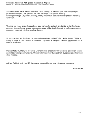 Sytuacja kadrowa PSG przed meczem z Angers PSGFC.pl - Polskie centrum kibiców Paris Saint-Germain - News Szkoleniowiec Paris Saint-Germain, Unai Emery, w najbliższym meczu ligowym przeciwko Angers, na pewno nie będzie mógł skorzystać z usług kontuzjowanego Layvina Kurzawy, który być może będzie musiał przejść kolejną operację. Wydaje się mało prawdopodobne, aby na boisku pojawił się także Javier Pastore. Argentyńczyk doznał urazu kolana w meczu z Nantes i chociaż zrobił on znaczące postępy, to wciąż nie jest zdolny do gry. W spotkaniu z les Scoïstes na murawie powinien pojawić się z kolei Angel Di Maria, który przegapił spotkanie z Arsenalem i Lyonem w związku z kontuzją poniesioną w meczu z Nantes. Blaise Matuidi, który w meczu z Lyonem miał problemy mięśniowe, powinien także zameldować się na murawie. O wszystkim zadecyduje jednak dyspozycja piłkarza w dniu meczu. Adrien Rabiot, który od 15 listopada ma problem z ude nie zagra z Angers. Autor: PSGKP 1/1 Powered by TCPDF (www.tcpdf.org)