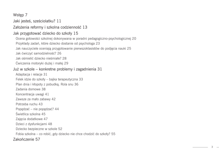 Wstêp 7 Jaki jesteœ, szeœciolatku? 11 Za³o¿enia reformy i szkolna codziennoœæ 13 Jak przygotowaæ dziecko do szko³y 15 Ocena gotowoœci szkolnej dokonywana w poradni pedagogiczno-psychologicznej 20 Przyk³ady zadañ, które dziecko dostanie od psychologa 23 Jak nauczyciele oceniaj¹ przygotowanie pierwszoklasistów do podjêcia nauki 25 Jak æwiczyæ samodzielnoœæ? 26 Jak oœmieliæ dziecko nieœmia³e? 28 Æwiczenia motoryki du¿ej i ma³ej 29 Ju¿ w szkole – konkretne problemy i zagadnienia 31 Adaptacja i relacje 31 Felek idzie do szko³y – bajka terapeutyczna 33 Plan dnia i k³opoty z pobudk¹. Rola snu 36 Zadania domowe 38 Koncentracja uwagi 41 Zawsze za ma³o zabawy 42 Potrzeba ruchu 43 Popêdzaæ – nie popêdzaæ? 44 Œwietlica szkolna 45 Zajêcia dodatkowe 47 Dzieci z dysfunkcjami 48 Dziecko bezpieczne w szkole 52 Fobia szkolna – co robiæ, gdy dziecko nie chce chodziæ do szko³y? 55 Zakoñczenie 57