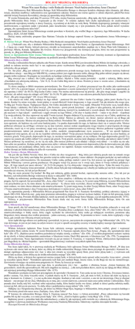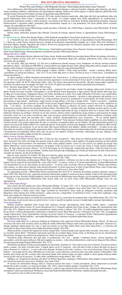 BÓG JEST MIŁOŚCIĄ MIŁOSIERNĄ Archiwalna pogadanka z dnia 11 kwietnia 1999 r. nadana przez O. Marcela Sokalskiego dnia 31 stycznia 2016 r. Witam Was zacni Rodacy i miłe Rodaczki słowami: Niech będzie pochwalony Jezus Chrystus! Trwa Jubileuszowy Rok Miłosierdzia Bożego. Kult Miłosierdzia Bożego w obecnym kształcie obejmuje takie elementy, jak obraz, święto, określone modlitwy i nabożeństwa oraz zgromadzenie zakonne. Stanowi ono ważne ogniwo w całości objawień, jakich Pan Jezus udzielał świętej Faustynie Kowalskiej, zlecając jej apostolską misję Miłosierdzia. W swoim Dzienniczku, pod datą 29 czerwca 1935 roku, siostra Faustyna zanotowała: „Bóg żąda, aby było zgromadzenie takie, aby głosiło Miłosierdzie Boże światu i wypraszało je dla świata”. To ostatnie żądanie było chyba najtrudniejsze do zrealizowania i powodowało największą rozterkę w duszy Faustyny, wyczulonej aż do bólu na wolę Bożą. Widziała dysproporcję pomiędzy własnymi możliwościami, a ogromem zadań i przeszkód, jakie nieuchronnie wiązały się z tym postulatem. Pan Jezus jednak mówił wyraźnie: „pragnę, aby zgromadzenie takie było”. Zgromadzenie Sióstr Jezusa Miłosiernego zostało powołane w Kościele, aby wielbić Boga w tajemnicy Jego Miłosierdzia. W duchu modlitwy: JEZU, UFAM TOBIE. Dzisiaj mamy archiwalny program Ojca Mariana Tolczyka do którego zaprosił Siostry ze Zgromadzenia Jezusa Miłosiernego z Kanady. O. Marian Tolczyk: Witam Was Drodzy Rodacy i Miłe Rodaczki staropolskim: Niech będzie pochwalony Jezus Chrystus! […] Nadszedł czas, aby o działaniu Miłosierdzia Bożego opowiedziały Wam Siostry ze Zgromadzenia Jezusa Miłosiernego. Dziś […] łączą się z nami Siostry, których pierwszy ośrodek na kontynencie amerykańskim znajduje się w Stony Plain koło Edmonton w prowincji Alberta, Kanada. Specjalnie dla Godziny Różańcowej przygotowały one dzisiejszy program, który ma nam przypomnieć tę prawdę, że „Bóg jest Miłością Miłosierną”. Siostry ze Zgromadzenia Sióstr Jezusa Miłosiernego: Niech będzie pochwalony Jezus Chrystus! Jesteśmy siostrami ze Zgromadzenia Sióstr Jezusa Miłosiernego. Dzisiaj pragniemy się podzielić prawdą o Miłosierdziu Bożym. Miłosierdzie Boże w Biblii Prawdą o miłosierdziu Bożym oddycha całe Pismo święte. Każda strona Biblii jest dowodem Bożej Miłości do każdego człowieka, a jednak ta radosna nowina może być w nas zagłuszona przez wyobrażenie Boga jako sędziego, prokuratora, który czyha na grzech człowieka, aby go potępić. Św. Jan pisze „Bóg jest miłością” (1J 4,8) jest to podstawowa prawda naszego życia, fundament, na którym możemy budować prawidłowe relacje – nasz Bóg jest MIŁOŚCIĄ, a naturą miłości jest ciągłe dawanie siebie, dlatego Bóg pełen miłości pragnie się dawać, pragnie siebie rozdawać, On pragnie na wszystkich, na każdego rozlewać swoją miłosierną Miłość. Bóg stworzył nas z miłości. On Ciebie pragnął z miłości. Myślał o Tobie zanim powstałeś – myślał z miłością. Biblia mówi: „Ukochałem cię odwieczną miłością…”(Jer 31,3). To do Ciebie Bóg mówi te słowa. Powtórz je teraz w swoim sercu: „Ukochałem cię odwieczną miłością…”. Te słowa znajdują w Biblii nieustanne potwierdzenie. Św. Paweł powie: „Z miłości przeznaczył nas dla siebie jako umiłowanych synów” (Ef 1,5), a prorok Izajasz: „Czyż może niewiasta zapomnieć o swoim niemowlęciu? (Czyż może?) A choćby ona zapomniała, ja nie zapomnę o tobie” (Iz 49,15). Bóg kocha Ciebie i mnie. Nie można zakwestionować tej prawdy: „Bo góry mogą ustąpić i pagórki się zachwiać, ale miłość moja nie odstąpi: od Ciebie” (Iz 54,10). W głębi serca każdy z nas odczuwa potrzebę bycia kochanym. Pieśń: „Bo góry mogą ustąpić” (SS. Jezusa Miłosiernego) I nie musisz nic robić, żeby zasłużyć na Jego miłość – ponieważ On zna Ciebie i kocha Cię takiego, jakim jesteś. Kocha Cię za darmo. Kocha Cię mimo wszystko. Jesteś piękny w oczach Bożych! Jesteś drogocenny w Jego oczach! Tak jak dziecko dla swego ojca. To Bóg jest Twoim Ojcem. Najlepszym Ojcem. On Ciebie ukształtował w łonie Twej matki. Obmyślał Twój kolor oczu, kształt dłoni, Twoje talenty i zdolności, On Ciebie tworzył. „Oto bowiem – powie prorok Jeremiasz – jak glina w ręku garncarza, tak jesteście wy w moim ręku” (Jer 18,6). Pomyśl: Bóg dotykał Cię z wielką miłością, tworzył Cię, kształtował w swoich rękach. On Ciebie tworzył. Jesteś jak naczynie w Jego rękach – umiłowane i ciągle otwarte na Jego Miłość, a On chce w każdej chwili – i także w tej chwili – wypełniać Cię swoją miłością. On chce zajmować się nadal Twoim życiem. Pragnie obdarzyć Cię szczęściem, troszczyć się o Ciebie, opiekować się Tobą – o ile chcesz – bo możesz zamknąć się na Bożą miłość. Możesz ja odrzucić, nie chcieć, możesz odwrócić się od Boga jak przewrócone naczynie. Możesz nie przyjmować Bożej miłości. Powiedzieć Mu – poradzę sobie sam. Zamknąć się przez grzech we własnym egoizmie, ale będziesz się czuł coraz bardziej pusty. I ta pustka doprowadzi do tego, że będziesz dusić się w samym sobie. Możesz próbować odwracać się od Boga i otwierać się na inne wartości, możesz szukać zaspokojenia swego wnętrza w przywiązaniu do innego człowieka, rzucić się w wir pracy zawodowej, zająć swój czas przez zainteresowania czy telewizję. Możesz próbować wypełniać siebie pseudowartościami, takimi jak przesadny lęk o siebie, zazdrość, nieuporządkowane życie uczuciowe…. W ten sposób będziesz pielęgnował swój egoizm, ale czy da się wypełnić odwrócony dzban? Twoje poczucie frustracji będzie pogłębiało się coraz bardziej, aż wreszcie grzech, Twój grzech, doprowadzi do tego, że zaczniesz wewnętrznie pęka