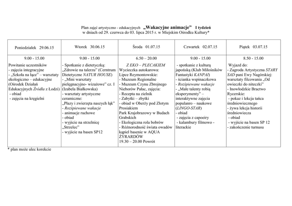 Plan zajęć artystyczno - edukacyjnych „Wakacyjne animacje” I tydzień w dniach od 29. czerwca do 03. lipca 2015 r. w Miejskim Ośrodku Kultury* Poniedziałek 29.06.15 Wtorek 30.06.15 Środa 01.07.15 Czwartek 02.07.15 Piątek 03.07.15 9.00 - 15.00 9.00 - 15.00 6.50 – 20.00 9.00 - 15.00 8.50 - 15.00 Powitanie uczestników - zajęcia integracyjne - „Szkoła na łące” – warsztaty ekologiczno – edukacyjne (Ośrodek Działań Edukacyjnych Źródła z Łodzi) - obiad - zajęcia na kręgielni - Spotkanie z dietetyczką: „Zdrowie na talerzu” (Cerntrum Dietetyczne NATUR HOUSE) - „Mini warsztaty pielęgnacyjno- wizażowe” cz. I (Izabela Białkowska) - warsztaty artystyczne ceramiczne: „Płazy i zwierzęta naszych łąk” - Rozśpiewane wakacje - animacje ruchowe - obiad - wyjście na strzelnicę „Strzelec” - wyjście na basen SP12 Z EKO – PLECAKIEM Wycieczka autokarowa: Lipce Reymontowskie: - Muzeum Regionalne - Muzeum Czynu Zbrojnego Nieborów Pałac, zajęcia: - Recepta na zielnik - Zabytki – zbytki - obiad w Oberży pod Złotym Prosiakiem Park Krajobrazowy w Budach Grabskich - Ekologiczna rola bobrów - Różnorodność świata owadów kąpiel basenie w AQUA ŻYRARDÓW 19.30 – 20.00 Powrót * plan może ulec korekcie - spotkanie z kulturą japońską (Klub Miłośników Fantastyki KANPAI) - ścianka wspinaczkowa - Rozśpiewane wakacje - „Małe talenty robią eksperymenty” – interaktywne zajęcia populanro – naukowe (LINGO-STAR) - obiad - zajęcia z capoeiry - kalambury filmowo literackie Wyjazd do: - Zagroda Artystyczna STARY SAD pani Ewy Nagórskiej: warsztaty filcowania „Od owieczki do niteczki” - Inowłodzkie Bractwo Rycerskie: - pokaz i lekcja tańca średniowiecznego - żywa lekcja historii średniowiecza - obiad - wyjście na basen SP 12 - zakończenie turnusu