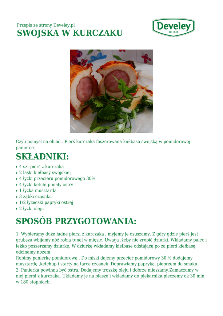 Przepis ze strony Develey.pl SWOJSKA W KURCZAKU Czyli pomysł na obiad . Pierś kurczaka faszerowana kiełbasa swojską w pomidorowej panierce. SKŁADNIKI: ● ● ● ● ● ● ● ● 4 szt pierś z kurczaka 2 laski kiełbasy swojskiej 4 łyżki przecieru pomidorowego 30% 4 łyżki ketchup mały ostry 1 łyżka musztarda 3 ząbki czosnku 1/2 łyżeczki papryki ostrej 2 łyżki oleju SPOSÓB PRZYGOTOWANIA: 1. Wybieramy duże ładne piersi z kurczaka , myjemy je osuszamy. Z góry gdzie pierś jest grubsza wbijamy nóż robią tunel w mięsie. Uwaga ,żeby nie zrobić dziurki. Wkładamy palec i lekko poszerzamy dziurkę. W dziurkę wkładamy kiełbasę odstającą po za pierś kiełbasę odcinamy nożem. Robimy panierkę pomidorową . Do miski dajemy przecier pomidorowy 30 % dodajemy musztardę ,ketchup i starty na tarce czosnek. Doprawiamy papryką, pieprzem do smaku. 2. Panierka powinna być ostra. Dodajemy troszkę oleju i dobrze mieszamy.Zamaczamy w niej piersi z kurczaka. Układamy je na blasze i wkładamy do piekarnika pieczemy ok 30 min w 180 stopniach.