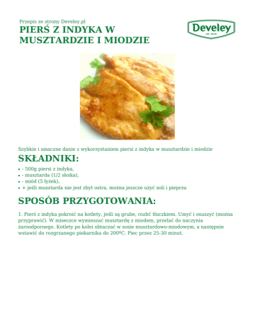 Przepis ze strony Develey.pl PIERŚ Z INDYKA W MUSZTARDZIE I MIODZIE Szybkie i smaczne danie z wykorzystaniem piersi z indyka w musztardzie i miodzie SKŁADNIKI: ● ● ● ● - 500g piersi z indyka, - musztarda (1/2 słoika), - miód (5 łyżek), + jeśli musztarda nie jest zbyt ostra, można jeszcze użyć soli i pieprzu SPOSÓB PRZYGOTOWANIA: 1. Pierś z indyka pokroić na kotlety, jeśli są grube, rozbć tłuczkiem. Umyć i osuszyć (można przyprawić). W miseczce wymieszać musztardę z miodem, przelać do naczynia żaroodpornego. Kotlety po kolei obtaczać w sosie musztardowo-miodowym, a następnie wstawić do rozgrzanego piekarnika do 200ºC. Piec przez 25-30 minut.