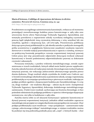 L’obbligo di riparazione del danno in diritto canonico… 211 Maria d’Arienzo, L’obbligo di riparazione del danno in diritto canonico. Percorsi di ricerca, Cosenza 2013, ss. 142 DOI: http://dx.doi.org/10.15633/acan.1832 Przemysław Michowicz OFMConv Przedmiotem szczególnego zainteresowania kanonistyki, zwłaszcza od momentu promulgacji znowelizowanego kodeksu prawa kanonicznego w 1983 roku oraz utworzenia Sectio altera Najwyższego Trybunału Sygnatury Apostolskiej, jest tematyka powództwa o naprawienie szkody wywołanej nielegalną czynnością prawną bądź jakąkolwiek inną czynnością dokonaną z winy umyślnej lub nieumyślnej, zgodnie z dyspozycją kan. 128 KPK/1983. Prezentowana publikacja dotycząca powyższej problematyki to, jak określa autorka w podtytule monografii, próba uczestnictwa w pogłębianiu historycznej zasadności uzyskania reparatio damnorum w świetle tradycji prawnokanonicznej w oparciu o rzetelną, teoretyczno-praktyczną kwerendę perspektyw rozwoju wspomnianej instytucji prawnej. Celem pracy jest więc poszukiwanie odpowiedzi dotyczącej ewolucji ordynacji kanonicznej w kwestii podmiotowej odpowiedzialności prawnej za dokonanie czynności zakazanych. Poruszana tematyka, z punktu widzenia metodologicznego, została zaprezentowana w trzech rozdziałach, których układ może budzić pewne wątpliwości. Autorka odeszła bowiem od tradycyjnej metody chronologicznej ewolucji badanej instytucji prawnej, nie wskazując jednocześnie alternatywnego sposobu prowadzenia dyskursu. Drugi rozdział odsyła czytelnika do źródeł ante Codicem 1917 w kwestii ewentualnego odszkodowania za poniesione szkody, uznając wspomnianą problematykę za wyczerpująco przedstawioną w pierwszym rozdziale, traktującym podjęty problem zgodnie z dyspozycjami kodeksu pio-benedyktyńskiego. Co więcej, drugi rozdział – nie wiadomo dlaczego – odnosi się do norm i kompetencji Trybunału Sygnatury Apostolskiej, dokonując dodatkowego metodologicznego zamieszania. Z kolei trzeci rozdział, zachowujący już kryteria chronologii, to bezpośrednie odniesienie do podjętego problemu w oparciu o obowiązujące dyspozycje normatywne, nie tylko te kodeksowe z 1983 roku. Autorka stawia sobie za cel ukazanie kontynuacji i spójności kanonicznej ordynacji prawnej wspomnianej instytucji, jednakże układ rozdziałów zaprzecza metodologicznie przyjętej we wstępie diachronicznej perspektywie rozważań. Choć podjęta problematyka czyni możliwym – wręcz pożądanym – zastosowanie tradycyjnego „odwróconego trójkąta” metodologicznego, w miejsce rozdziałów można by posłużyć się inną jednostką podziału pracy jak „część”, z których każda – choć 212 Przemysław Michowicz OFMConv niebezpośrednio powiązana myślowo – daje kompleksowy obraz traktowanego problemu. Nie budzi zastrzeżeń stosowany język ani formułowanie konkluzji, zawsze jasnych i jednoznacznych. Imponująca jest również bibliografia, zwłaszcza źródłowa, co świadczy o rzetelnych poszukiwaniach, które nie ograniczyły się tylko do tekstów kościelnych, lecz pozwoliły zbadać funkcjonowanie omawianej instytucji prawnej w świeckich systemach (francuskim i włoskim), nie wykluczając podobnych normatywnych regulacji obowiązujących na terytoriach byłego Państwa Kościelnego. W omawianej tematyce autorka nie mogła pominąć definitywnych orzeczeń Sygnatury Apostolskiej (zwłaszcza coram Ratzinger z 27 października 1984 roku), licznie i obficie przytaczanych dla zilustrowania rzeczywistego stanowiska Trybunału względem poszkodowanych wnoszących o naprawienie szkód o z tytułu, o którym w dyspozycji kan. 128 KPK/1983. Jak zasygnalizowano, pierwszy z trzech rozdziałów odsyła czytelnika do problematyki naprawienia szkód regulowanej przez abrogowany kodeks z 1917 roku, w którym brak expresse tak sformułowanej normy generalnej. Jednakże, w wyniku rozumowania indukcyjnego, odwołania się do principia legis oraz tradycji było możliwe wskazanie wiążącej zasady odpowiedzialności za popełnienie czynów zakazanych, także w przypadku jednoznacznego braku normy w tym sensie. Ten fakt, jak podkreśla autorka, sprzeciwiał się technicznej legalności systemów świeckich na korzyść kanonicznego obowiązku – nie tylko moralnego – naprawienia wyrządzonej szkody, rozumianej jako konieczność odbudowania porządku prawno-społecznego wspólnoty wierzących, chroniąc tym samym jej szeroko pojęte dobro. Autorka, w dalszej kolejności, omawia kwestię skargi ad reparanda damna ex delicto (kan. 2210 KPK/1917), jak również nakreśla obowiązek naprawienia szkód wypływający z typizowanych przez ustawodawcę kościelnego czynności zakazanych, jak np. nieprawna alienacja dóbr kościelnych ex can. 2347 KPK/1917, czy próba przekupstwa pracowników kurii, sprawujących władzę sędziów, wykonujących obowiązki adwokatów ex can. 2407 KPK/1917 itp. Na szczególną uwagę zasługuje obowiązek dokonania satisfatio w przypadku szkody wynikającej z czynności pozakontraktowej, kiedy akt prawny, zadeklarowany jako nieważny, wyrządza szkodę adresatowi. Autorka wskazuje, że dyspozycja kodeksowa wyrażona w kan. 1681 KPK/1917 stanowi inspirację normatywną dla obowiązującego kan. 128 KPK/1983. W kwestii obowiązku naprawiania szkody z tytułu zawartej umowy, autorka, analizując jurysprudencję Roty Rzymskiej, wskazuje na dwa konstytutywne L’obbligo di riparazione del danno in diritto canonico… 213 kryteria: iniuria i responsabilitas (ex dolo et culpa). Szczególną uwagę poświęca także kwestiom definicji i poprawnego rozróżnienia między „przestępstwem” i „jak gdyby przestępstwem”, poszerzając swe poszukiwania o znaczenie tych terminów w prawnych źródłach świeckich, ukazując tym samym sposób, w jaki powyższe rozróżnienie determinowało obowiązek naprawienia wyrządzonej szkody. Rozdział drugi prezentuje, oprócz wspomnianyc
