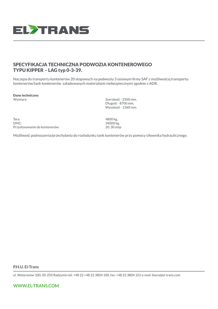 SPECYFIKACJA TECHNICZNA PODWOZIA KONTENEROWEGO TYPU KIPPER – LAG typ 0-3-39. Naczepa do transportu kontenerów 20 stopowych na podwoziu 3 osiowym firmy SAF z możliwością transportu kontenerów/tank kontenerów załadowanych materiałami niebezpiecznymi zgodnie z ADR. Dane techniczne: Wymiary: Szerokość - 2500 mm, Długość - 8700 mm, Wysokość - 1360 mm. Tara: DMC: Przystosowanie do kontenerów: 4800 kg, 34000 kg, 20, 30 stóp Możliwość podnoszenia/przechylania do rozładunku tank kontenerów przy pomocy siłownika hydraulicznego. P.H.U. El-Trans ul. Weteranów 100, 05-250 Radzymin tel. +48 22 +48 22 3804 100, fax: +48 22 3804 101 e-mail: [email protected] WWW.EL-TRANS.COM