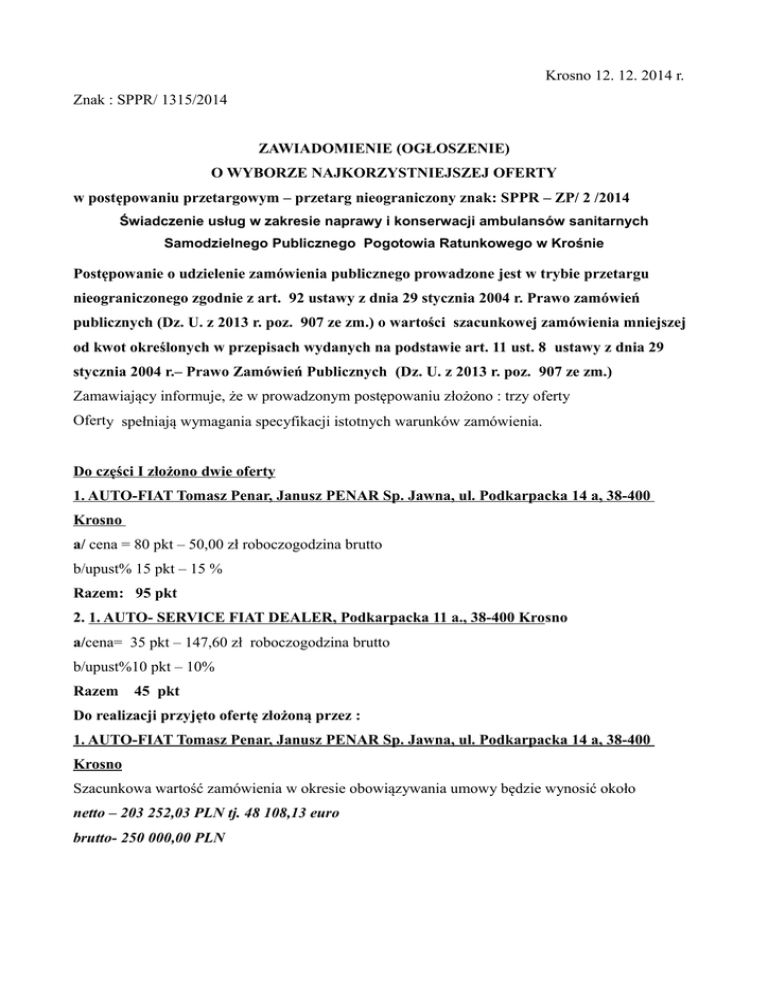Krosno 12. 12. 2014 r. Znak : SPPR/ 1315/2014 ZAWIADOMIENIE (OGŁOSZENIE) O WYBORZE NAJKORZYSTNIEJSZEJ OFERTY w postępowaniu przetargowym – przetarg nieograniczony znak: SPPR – ZP/ 2 /2014 Świadczenie usług w zakresie naprawy i konserwacji ambulansów sanitarnych Samodzielnego Publicznego Pogotowia Ratunkowego w Krośnie Postępowanie o udzielenie zamówienia publicznego prowadzone jest w trybie przetargu nieograniczonego zgodnie z art. 92 ustawy z dnia 29 stycznia 2004 r. Prawo zamówień publicznych (Dz. U. z 2013 r. poz. 907 ze zm.) o wartości szacunkowej zamówienia mniejszej od kwot określonych w przepisach wydanych na podstawie art. 11 ust. 8 ustawy z dnia 29 stycznia 2004 r.– Prawo Zamówień Publicznych (Dz. U. z 2013 r. poz. 907 ze zm.) Zamawiający informuje, że w prowadzonym postępowaniu złożono : trzy oferty Oferty spełniają wymagania specyfikacji istotnych warunków zamówienia. Do części I złożono dwie oferty 1. AUTO-FIAT Tomasz Penar, Janusz PENAR Sp. Jawna, ul. Podkarpacka 14 a, 38-400 Krosno a/ cena = 80 pkt – 50,00 zł roboczogodzina brutto b/upust% 15 pkt – 15 % Razem: 95 pkt 2. 1. AUTO- SERVICE FIAT DEALER, Podkarpacka 11 a., 38-400 Krosno a/cena= 35 pkt – 147,60 zł roboczogodzina brutto b/upust%10 pkt – 10% Razem 45 pkt Do realizacji przyjęto ofertę złożoną przez : 1. AUTO-FIAT Tomasz Penar, Janusz PENAR Sp. Jawna, ul. Podkarpacka 14 a, 38-400 Krosno Szacunkowa wartość zamówienia w okresie obowiązywania umowy będzie wynosić około netto – 203 252,03 PLN tj. 48 108,13 euro brutto- 250 000,00 PLN Do części II złożono jedną ofertę 1. AUTO- SERVICE FIAT DEALER, Podkarpacka 11 a., 38-400 Krosno a/cena= 80 pkt – 147,60 zł roboczogodzina brutto b/upust%10 pkt – 10 % Razem 90 pkt Oferta została przyjęta do realizacji Szacunkowa wartość zamówienia w okresie obowiązywania umowy będzie wynosić około netto – 65040,65 PLN – tj. 15 394, 60 euro brutto - 80 000,00 PLN Do części III złożono dwie oferty 1. IMPORT EKSPORT PIELACH Bernard Schabowski, Pużaka 51 a, 38-400 Krosno a/ cena = 80 pkt - wymiana opony brutto 20 zł b/ upust% = 0 pkt Razem 80 pkt Firma oferuje usługę przechowywania sezonowego kompletu opon wraz z montażem kół do samochodu, mycia i konserwacji ( usługa wymagana przez Zamawiającego – opisane we SIWZ). Cena usługi brutto wynosi 60 zł brutto /komplet kół/ 2. 1. AUTO- SERVICE FIAT DEALER, Podkarpacka 11 a., 38-400 Krosno a/ cena = 40 pkt – wymiana opony brutto 44,28 zł b/ upust% 10 pkt - 10 % upust Razem 50 pkt Firma nie oferuje usługi przechowywania sezonowego kompletu opon wraz z montażem kół do samochodu, mycia i konserwacji ( usługa wymagana przez Zamawiającego – opisane w SIWZ). Do realizacji przyjęto ofertę złożoną przez: 1. IMPORT EKSPORT PIELACH Bernard Schabowski, Pużaka 51 a, 38-400 Krosno Szacunkowa wartość zamówienia w okresie obowiązywania umowy wynosi netto około netto- 40 650,00 PLN tj. 9 621, 53 euro brutto- 50 000,00 PLN Całkowita wartość zamówienia wynosi około 380 000,00 PLN brutto netto 308 943, PLN Umowy na realizację poszczególnych pakietów zostaną zawarte na okres: 1 stycznia 2015r. do 31 grudnia 2016 r. Podstawą prawną dokonanego wyboru jest art. 91 ust. 1 PZP oraz Kodeks Cywilny W prowadzonym postępowaniu nie wykluczono żadnego wykonawcy, nie odrzucono żadnej oferty. Środki ochrony prawnej Od niniejszej decyzji przysługują środki ochrony prawnej określone w ustawie z dnia 29 stycznia 2004 roku Prawo zamówień publicznych (Dz. U. z 2013 r. poz. 907 ze zm.) - dział VI „Środki ochrony prawnej” Dyrektor SPPR w Krośnie lek. med. Andrzej Jurczak