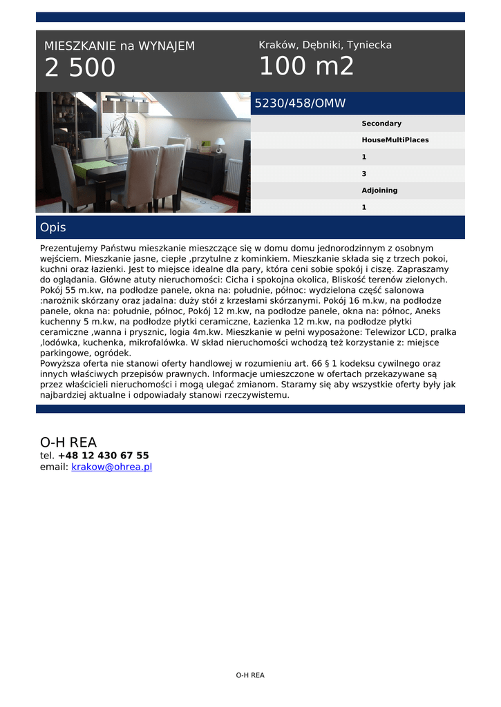 MIESZKANIE na WYNAJEM 2 500 Kraków, Dębniki, Tyniecka 100 m2 5230/458/OMW Secondary HouseMultiPlaces 1 3 Adjoining 1 Opis Prezentujemy Państwu mieszkanie mieszczące się w domu domu jednorodzinnym z osobnym wejściem. Mieszkanie jasne, ciepłe ,przytulne z kominkiem. Mieszkanie składa się z trzech pokoi, kuchni oraz łazienki. Jest to miejsce idealne dla pary, która ceni sobie spokój i ciszę. Zapraszamy do oglądania. Główne atuty nieruchomości: Cicha i spokojna okolica, Bliskość terenów zielonych. Pokój 55 m.kw, na podłodze panele, okna na: południe, północ: wydzielona część salonowa :narożnik skórzany oraz jadalna: duży stół z krzesłami skórzanymi. Pokój 16 m.kw, na podłodze panele, okna na: południe, północ, Pokój 12 m.kw, na podłodze panele, okna na: północ, Aneks kuchenny 5 m.kw, na podłodze płytki ceramiczne, Łazienka 12 m.kw, na podłodze płytki ceramiczne ,wanna i prysznic, logia 4m.kw. Mieszkanie w pełni wyposażone: Telewizor LCD, pralka ,lodówka, kuchenka, mikrofalówka. W skład nieruchomości wchodzą też korzystanie z: miejsce parkingowe, ogródek. Powyższa oferta nie stanowi oferty handlowej w rozumieniu art. 66 § 1 kodeksu cywilnego oraz innych właściwych przepisów prawnych. Informacje umieszczone w ofertach przekazywane są przez właścicieli nieruchomości i mogą ulegać zmianom. Staramy się aby wszystkie oferty były jak najbardziej aktualne i odpowiadały stanowi rzeczywistemu. O-H REA tel. +48 12 430 67 55 email: [email protected] O-H REA Powered by TCPDF (www.tcpdf.org)