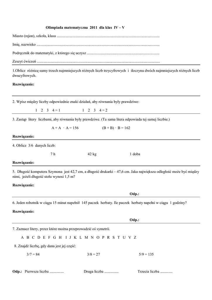 Olimpiada matematyczna 2011 dla klas IV – V Miasto (rejon), szkoła, klasa ............................................................................................................ Imię, nazwisko ................................................................................................................................. Podręcznik do matematyki, z którego się uczysz ............................................................................ Zeszyt ćwiczeń ................................................................................................................................. 1.Oblicz różnicę sumy trzech najmniejszych różnych liczb trzycyfrowych i iloczynu dwóch najmniejszych różnych liczb dwucyfrowych. Rozwiązanie: 2. Wpisz między liczby odpowiednie znaki działań, aby równania były prawdziwe: 1 2 3 4=1 1 2 3 4=2 3. Zastąp litery liczbami, aby równania były prawdziwe. (Ta sama litera odpowiada tej samej liczbie.) A + A · A = 156 (B + B) · B = 162 Rozwiązanie: 4. Oblicz 3/6 danych liczb: 7h 42 kg 1 doba Rozwiązanie: 5. Długość komputera Szymona jest 42,7 cm, a długość drukarki – 47,6 cm. Jaka największa odległość może być między nimi, jeżeli długość stołu wynosi 1,5 m? Rozwiązanie: Odp.: 6. Jeden robotnik w ciągu 15 minut napełnił 145 paczek herbaty. Ile paczek herbaty napełni w ciągu 1 godziny? Rozwiązanie: Odp.: 7. Zaznacz litery, przez które można przeprowadzić oś symetrii. A B C D E F G H I J K L M N O P R S T U V Z 8. Znajdź liczbę, gdy dana jest jej część: 3/7 = 84 Odp.: Pierwsza liczba ............... 3/8 = 27 Druga liczba ............... 5/9 = 135 Trzecia liczba ............. 9. Napisz ułamek większy niż 2/7 Odp.: 10. Przepytano 60 osób, jaki kraj chcieliby zwiedzić. Hiszpania; 12 Francja; 18 Anglia; 15 Japonia; 10 Ameryka; 5 Jaka część tych osób chciałaby zwiedzić Anglię? Odp.: ................................. Jaka część tych osób chciałaby zwiedzić Francję i Hiszpanię? Odp.: ................................. Jaka część tych osób nie wybrałaby Anglii? Odp.: ................................. Jaka część tych osób chciałaby zwiedzić Japonię i Amerykę? Odp.: ................................. ___________________________________________________________________________________ 11. Dzieci współzawodniczyły, kto w ciągu tego samego czasu więcej razy trafi piłką do kosza. Rozłóż wyniki na 4 grupy i przedstaw na diagramie: 5, 16, 6, 12, 2, 17, 19, 14, 18, 20, 18, 6, 5, 5, 4, 7, 8, 16, 9, 3, 12, 2, 14, 18, 14, 19, 4, 7, 3, 4. 25 Ilość dzieci 20 15 10 5 0 0-5 6 - 10 11 - 15 16 - 20 Ilość celnych rzutów 12. Napisz, w którym wieku zostały założone te miasta na Litwie: Vilnius – w 1323 roku Šiauliai – w 1326 roku ................................. ................................. 13. Oblicz wartość wyrażenia: 181818 : 9 Panevėžys – w 1503 roku .............................. Odp.: A 222 Biržai – w 1455 roku ............................. B 202020 C 20202 14. Oblicz pole zamalowanej części figury. Rozwiązanie: Odp.: 15.Jeżeli zwiększymy 2 razy bok kwadratu, jak się zmieni jego pole? Odp.: A Zwiększy się 2 razy B Zwiększy się 4 razy C Zwiększy się 8 razy 16. W akwarium jest 15 złotych rybek. To jest 3 razy więcej niż srebrnych. Ile srebrnych rybek jest w akwarium? Odp.: A 45 B 5 C 18 17. Kupiono 12 m niebieskiej tkaniny i 4 m białej tkaniny po tej samej cenie. Za cały zakup zapłacono 48 LT. Ile kosztuje 1m tkaniny? Odp.: A 24 LT B 3 LT C 72 LT 18. Z dwóch miast leżących w odległości 48 km od siebie wyszli naprzeciw siebie dwaj podróżni. Po upływie jakiego czasu spotkają się, jeżeli jeden idzie z prędkością 5 km/h, a drugi z prędkością – 3 km/h? Rozwiązanie: Odp.: 19. W sklepie było 50 skrzyń jabłek. Po sprzedaniu kilkudziesięciu skrzyń, zostało 20 skrzyń jabłek. Które z wyrażeń odpowiada warunkowi zadania? Odp.: A -20 =50 B 20- = 50 C - 50 = 20 D 50 - = 20 20. Agnieszka z siostrą Renią wyjechały jednocześnie rowerami z domu do babci. Babcia mieszka w odległści 9 km od ich domu. Agnieszka przejechała 3 km w ciągu 10 minut. Renia 1 km przejechała w ciągu 3 minut. Ile czasu Agnieszka jechała do babci? Odp.: .......................................minut Ile czasu Renia jechała do babci? Odp.: .......................................minut Która z sióstr pierwsza przyjechała do babci? Odp.: ................................................. 21. Stefan chce obejrzeć film, który trwałby od 1 ½ Odp.: A 59 minut B 102 minuty do 2 godzin. Który z filmów może wybrać? C 121 minut D 150 minut 22. Witek powiedział, że 1/3 tortu jest mniej niż 1/4 tego samego tortu. Czy Witek ma rację? .......................................................... Zaznacz 1/3 tortu Zaznacz 1/4 tortu 23. Która liczba jest najbliższa 600, jeżeli ją zaokrąglimy do setek? Odp.: A 62 B 160 C 546 D 586 E 660 24. Której liczbie odpowiada zamalowana część figury? Odp.: A 2,8 B 0,5 C 0,2 D 0,02 25. W klasie Juli jest 10 dziewczynek i 20 chłopców. Jula mówi: ,,Na jedną dziewczynkę przypada dwóch chłopców.” Jej kolega Igor twierdzi, że dziewczynki stanowią 1/2 wszystkich uczniów klasy. Czy Jula ma rację? Odp.: ...................................... Czy Igor ma rację? Odp.: ..................................... 26. Nauczyciel sprawdza 10 prac kontrolnych w ciągu pół godziny. Prace kontrolne całej klasy nauczyciel sprawdził w ciągu półtorej godziny. Ilu uczniów pisało pracę kontrolną? Odp.: ....................................... Rozwiązanie: 27. Gdy Gintaras wychodził do szkoły, termometr wskazywał 3 stopnie mrozu. Po jakimś czasie termometr wskazywał 5 stopni ciepła. O ile stopni wzrosła temperatura? Odp.: A o 2 stopnie B o 3 stopnie C o 5 stopni D o 8 stopni 28. Dziecko zgięło papier i wycięło figurę. Narysuj, jak wygląda wycięta figura po odgięciu kartki. 29. Oblicz liczbę, j