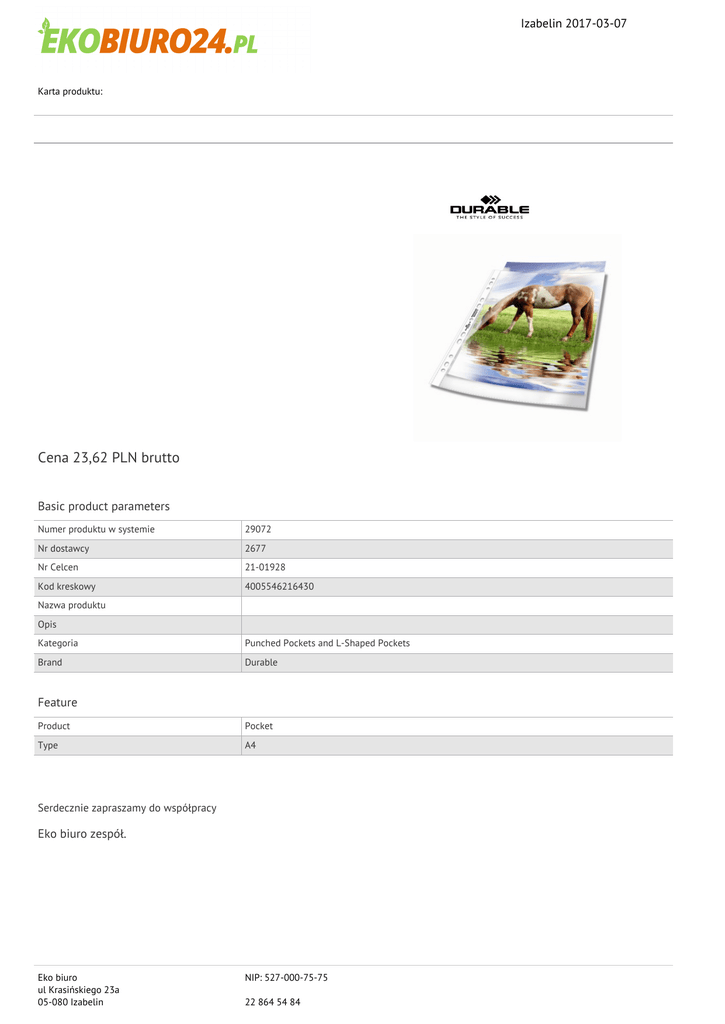 Izabelin 2017-03-07 Karta produktu: Cena 23,62 PLN brutto Basic product parameters Numer produktu w systemie 29072 Nr dostawcy 2677 Nr Celcen 21-01928 Kod kreskowy 4005546216430 Nazwa produktu Opis Kategoria Punched Pockets and L-Shaped Pockets Brand Durable Feature Product Pocket Type A4 Serdecznie zapraszamy do współpracy Eko biuro zespół. Eko biuro ul Krasińskiego 23a 05-080 Izabelin NIP: 527-000-75-75 22 864 54 84