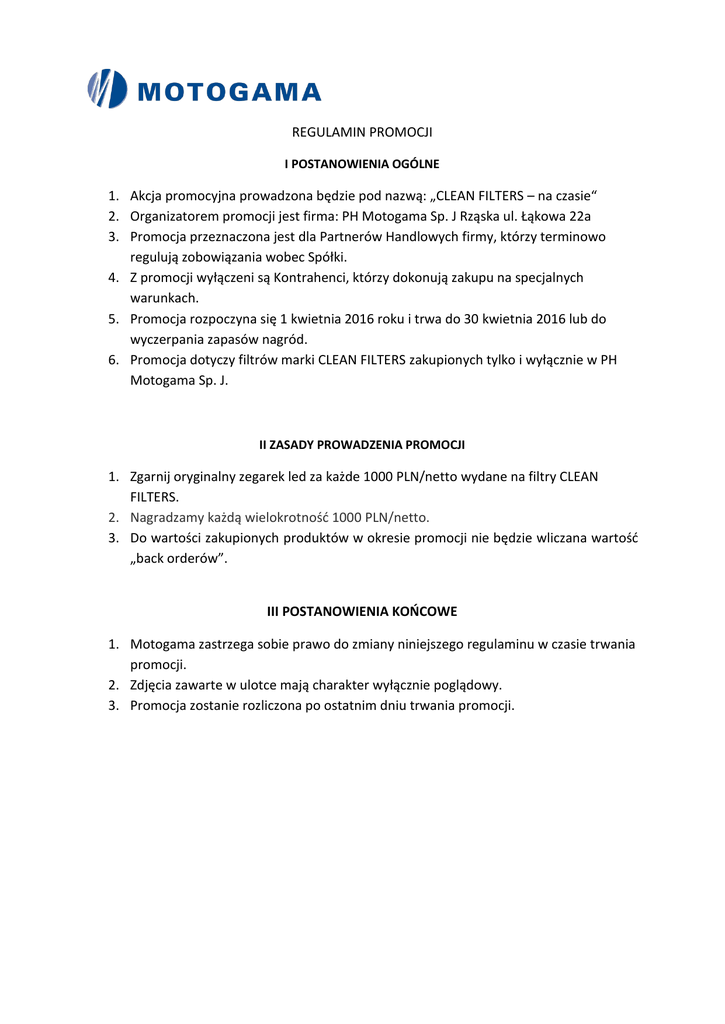 REGULAMIN PROMOCJI I POSTANOWIENIA OGÓLNE 1. Akcja promocyjna prowadzona będzie pod nazwą: „CLEAN FILTERS – na czasie“ 2. Organizatorem promocji jest firma: PH Motogama Sp. J Rząska ul. Łąkowa 22a 3. Promocja przeznaczona jest dla Partnerów Handlowych firmy, którzy terminowo regulują zobowiązania wobec Spółki. 4. Z promocji wyłączeni są Kontrahenci, którzy dokonują zakupu na specjalnych warunkach. 5. Promocja rozpoczyna się 1 kwietnia 2016 roku i trwa do 30 kwietnia 2016 lub do wyczerpania zapasów nagród. 6. Promocja dotyczy filtrów marki CLEAN FILTERS zakupionych tylko i wyłącznie w PH Motogama Sp. J. II ZASADY PROWADZENIA PROMOCJI 1. Zgarnij oryginalny zegarek led za każde 1000 PLN/netto wydane na filtry CLEAN FILTERS. 2. Nagradzamy każdą wielokrotność 1000 PLN/netto. 3. Do wartości zakupionych produktów w okresie promocji nie będzie wliczana wartość „back orderów”. III POSTANOWIENIA KOŃCOWE 1. Motogama zastrzega sobie prawo do zmiany niniejszego regulaminu w czasie trwania promocji. 2. Zdjęcia zawarte w ulotce mają charakter wyłącznie poglądowy. 3. Promocja zostanie rozliczona po ostatnim dniu trwania promocji.