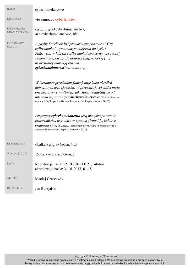 HASŁO cyberbumelanctwo DEFINICJA «to samo, co cyberlenistwo» INFORMACJA GRAMATYCZNA rzecz. n, lp D cyberbumelanctwa, Ms. cyberbumelanctwie, blm PRZYKŁADY UŻYCIA A gdyby Facebook był prawdziwym państwem? Czy byłby utopią i wymarzonym miejscem do życia? Państwem, w którym rósłby kapitał społeczny, czy raczej stanowi on społeczność destrukcyjną, w której […] użytkownicy marnują czas na cyberbumelanctwo? (barbarastawarz.pl). W literaturze przedmiotu funkcjonuje kilka określeń dotyczących tego zjawiska. W przeważającej części mają one negatywny wydźwięk, jak choćby uzależnienie od internetu w pracy czy cyberbumelanctwo (K. Wolski, „Internet w pracy. I Ogólnopolskie Badanie Pracowników. Raport z badania 2010”). Przyczyny cyberbumelanctwa leżą nie tylko po stronie pracowników, lecz także w sytuacji firmy i jej kulturze organizacyjnej (J. Zając, „Technologie informacyjne i komunikacyjne a zarządzanie personelem. Raport”, Warszawa 2012). ETYMOLOGIA WIZUALIZACJE <kalka z ang. cyberloafing> Zobacz w grafice Google DATA Rejestracja hasła: 12.10.2016, 00.21, ostatnia aktualizacja hasła: 31.01.2017, 01.15 AUTOR Maciej Czeszewski REDAKTOR Jan Burzyński Copyright © Uniwersytet Warszawski Wszelkie prawa zastrzeżone zgodnie z art.17 ustawy z dnia 4 lutego 1994 r. o prawie autorskim i prawach pokrewnych. Teksty oraz zdjęcia zawarte w tym dokumencie nie mogą być publikowane bez wiedzy i zgody właściciela praw autorskich. Powered by TCPDF (www.tcpdf.org)