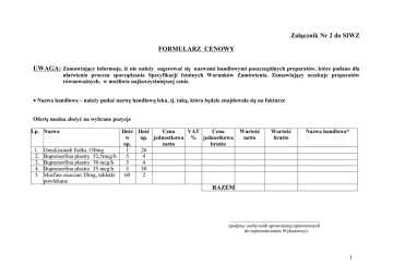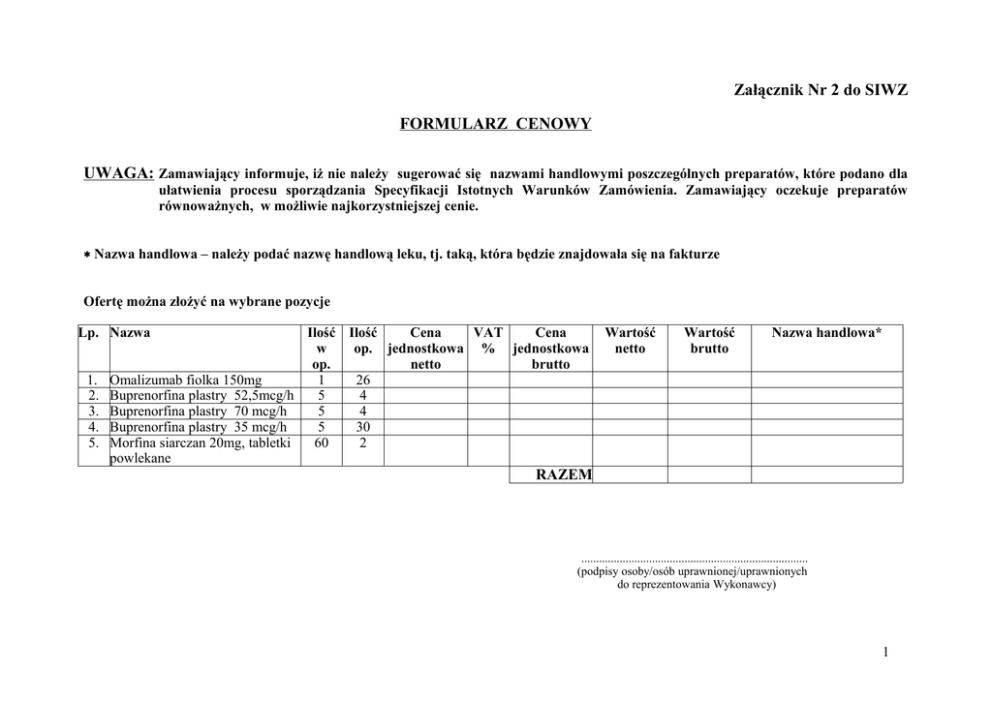 Załącznik Nr 2 do SIWZ FORMULARZ CENOWY UWAGA: Zamawiający informuje, iż nie należy sugerować się nazwami handlowymi poszczególnych preparatów, które podano dla ułatwienia procesu sporządzania Specyfikacji Istotnych Warunków Zamówienia. Zamawiający oczekuje preparatów równoważnych, w możliwie najkorzystniejszej cenie. ∗ Nazwa handlowa – należy podać nazwę handlową leku, tj. taką, która będzie znajdowała się na fakturze Ofertę można złożyć na wybrane pozycje Lp. Nazwa Ilość Ilość Cena VAT Cena w op. jednostkowa % jednostkowa op. netto brutto 1. Omalizumab fiolka 150mg 1 26 2. Buprenorfina plastry 52,5mcg/h 5 4 3. Buprenorfina plastry 70 mcg/h 5 4 4. Buprenorfina plastry 35 mcg/h 5 30 5. Morfina siarczan 20mg, tabletki 60 2 powlekane Wartość netto Wartość brutto Nazwa handlowa* RAZEM ............................................................................. (podpisy osoby/osób uprawnionej/uprawnionych do reprezentowania Wykonawcy) 1