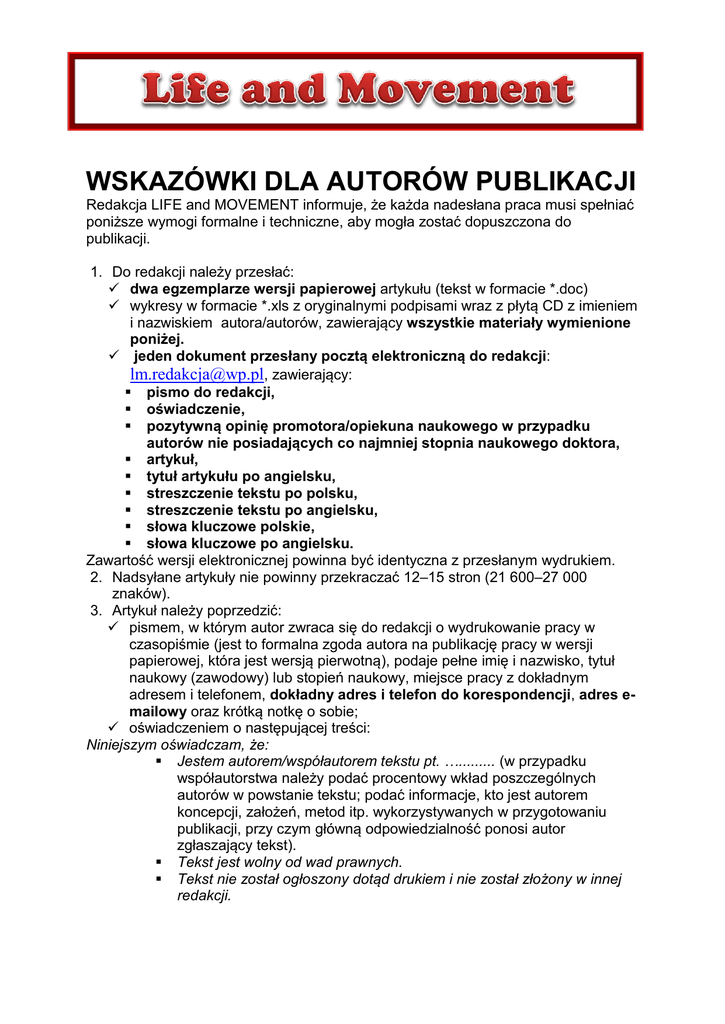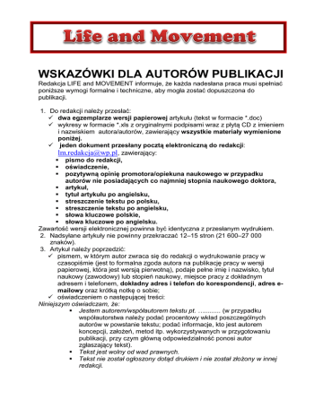 WSKAZÓWKI DLA AUTORÓW PUBLIKACJI Redakcja LIFE and MOVEMENT informuje, że każda nadesłana praca musi spełniać poniższe wymogi formalne i techniczne, aby mogła zostać dopuszczona do publikacji. 1. Do redakcji należy przesłać: dwa egzemplarze wersji papierowej artykułu (tekst w formacie *.doc) wykresy w formacie *.xls z oryginalnymi podpisami wraz z płytą CD z imieniem i nazwiskiem autora/autorów, zawierający wszystkie materiały wymienione poniżej. jeden dokument przesłany pocztą elektroniczną do redakcji: [email protected], zawierający: pismo do redakcji, oświadczenie, pozytywną opinię promotora/opiekuna naukowego w przypadku autorów nie posiadających co najmniej stopnia naukowego doktora, artykuł, tytuł artykułu po angielsku, streszczenie tekstu po polsku, streszczenie tekstu po angielsku, słowa kluczowe polskie, słowa kluczowe po angielsku. Zawartość wersji elektronicznej powinna być identyczna z przesłanym wydrukiem. 2. Nadsyłane artykuły nie powinny przekraczać 12–15 stron (21 600–27 000 znaków). 3. Artykuł należy poprzedzić: pismem, w którym autor zwraca się do redakcji o wydrukowanie pracy w czasopiśmie (jest to formalna zgoda autora na publikację pracy w wersji papierowej, która jest wersją pierwotną), podaje pełne imię i nazwisko, tytuł naukowy (zawodowy) lub stopień naukowy, miejsce pracy z dokładnym adresem i telefonem, dokładny adres i telefon do korespondencji, adres emailowy oraz krótką notkę o sobie; oświadczeniem o następującej treści: Niniejszym oświadczam, że: Jestem autorem/współautorem tekstu pt. …......... (w przypadku współautorstwa należy podać procentowy wkład poszczególnych autorów w powstanie tekstu; podać informacje, kto jest autorem koncepcji, założeń, metod itp. wykorzystywanych w przygotowaniu publikacji, przy czym główną odpowiedzialność ponosi autor zgłaszający tekst). Tekst jest wolny od wad prawnych. Tekst nie został ogłoszony dotąd drukiem i nie został złożony w innej redakcji. Tekst przekazuje do publikacji i rozpowszechniania na wszystkich polach eksploatacji, o których mowa w art. 50 ustawy o prawie autorskim i prawach pokrewnych w kwartalniku Life and Movement. Podpis 4. Artykuły studentów/doktorantów muszą mieć dołączoną pozytywną opinię promotora/opiekuna naukowego o złożonym artykule. 5. Wszystkie nadesłane teksty są recenzowane. Warunkiem opublikowania tekstu jest pozytywna opinia recenzentów potwierdzona rekomendacją do druku redaktora naczelnego. 6. Na początku artykułu powinno być umieszczone imię i nazwisko autora/autorów oraz jego/ich miejsce pracy. 7. Tytuł każdego artykułu powinien być podany w językach polskim i angielskim. 8. W przypadku recenzji publikacji podajemy tytuł polski oraz jego brzmienie w języku angielskim (w przypadku publikacji zagranicznej prosimy o podanie oryginalnego tytułu recenzowanego dzieła). W przypadku sprawozdań, omówień wydarzeń naukowych czy innych materiałów podajemy tytuł polski oraz jego brzmienie w języku angielskim. 8. Na końcu artykułu umieszczamy streszczenie w języku polskim (ok. 600-700 znaków) oraz streszczenie w języku angielskim (ok. 600-700 znaków) – dotyczy artykułów problemowych, teoretycznych, historycznych, materiałów prezentujących wyniki badan czy doświadczenia zagraniczne (nie dotyczy recenzji, sprawozdań czy omówień wydarzeń naukowych). 9. Artykuł powinien zawierać słowa kluczowe w języku polskim i w języku angielskim (nie dotyczy recenzji, sprawozdań z wydarzeń naukowych). 10. Podstawowy tekst artykułu powinien być pisany Arialem 12 pkt. z półtora odstępem i z wcięciami akapitowymi 2 cm. 11. Śródtytuły użyte w tekście powinny mieć zróżnicowany stopień i wyróżnienie. 12. Tabele powinny mieć tytuły i numery porządkowe oraz źródło umieszczone pod tabelą. Tekst w tabeli powinien być pisany Arialem Narrow 8 pkt. z pojedynczym odstępem. Minimalna dopuszczalna szerokość tabel wynosi 8,1 cm (1 łam), a maksymalna – 17,1 cm (2 łamy). Ewentualne objaśnienia do tabeli podajemy przed źródłem. 13. Wykresy, schematy lub zestawienia powinny być wykonane w edytorze Word lub Excel w tonacji czarno-białej. Powinny być ponumerowane i zatytułowane. Tytuł umieszcza się nad wykresem, bez kropki na końcu. Maksymalna dopuszczalna szerokość wykresu (rysunku) wynosi 17,1 cm (2 łamy), a minimalna – 8,1 cm (1 łam). Wykres, rysunek itp. powinny zawierać legendę oraz źródło (umieszczone pod wykresem). Dodatkowe opisy do wykresu powinny być zamieszczone przed źródłem. W przypadku wykorzystania wykresów, rysunków itp. uprzednio opublikowanych lub pochodzących od innych autorów należy odpowiednio sformułować źródło lub dołączyć pisemną zgodę autorów i wydawnictwa na ich wykorzystanie. 14. Przypisy – komentarze, objaśnienia, uwagi dodatkowe autorów lub wydawcy odnoszące się do wskazanych wyrazów, zwrotów lub fragmentów tekstu umieszczamy na dole strony. Przypisy powinny mieć numerację liczbową. W przypadku tylko dwóch przypisów należy stosować dla oznaczenia znaki graficzne (jedna gwiazdka i dwie gwiazdki). 15. Literaturę umieszczamy na końcu tekst w kolejności alfabetycznej. Powołania na literaturę w tekście głównym umieszczamy w nawiasie. Podajemy nazwisko autora/autorów i rok wydania (ewentualnie numer strony) lub początek publikacji albo wydawcę i rok wydania – patrz wzór: (Frącek 2009, s. 25), (Baliński, Rabata 2010). Tytuły czasopism podajemy w pełnym brzmieniu. LITERATURA Adamiak S., red. (2008), Aktywność ruchowa dzieci w świetlicach socjoterapeutycznych, Kalisz, RWR. Filar M., (2010), Przestępstwa przeciwko wolności seksualnej i obyczajności, [w:]: Podstawy seksuologii, Starowicz L., Skrzypulec (red.), Warszawa, Wydawnictwo Lekarskie PZWL. Michniewicz I., Michniewicz R., (2011), Śmierć na strzeżonym kąpielisku – wina ratownika czy systemu