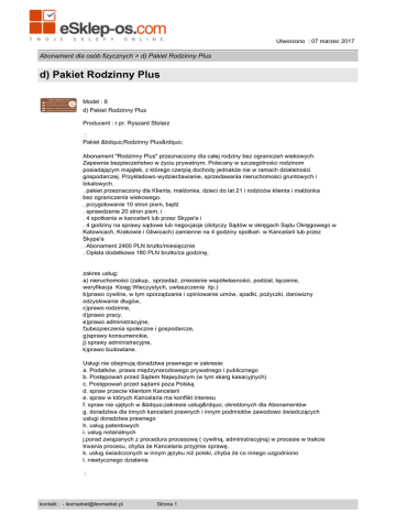Utworzono : 07 marzec 2017 Abonament dla osób fizycznych > d) Pakiet Rodzinny Plus d) Pakiet Rodzinny Plus Model : 8 d) Pakiet Rodzinny Plus Producent : r.pr. Ryszard Stolarz � Pakiet „Rodzinny Plus” Abonament "Rodzinny Plus" przeznaczony dla całej rodziny bez ograniczeń wiekowych. Zapewnia bezpieczeństwo w życiu prywatnym. Polecany w szczególności rodzinom posiadającym majątek, z którego czerpią dochody jednakże nie w ramach działalności gospodarczej. Przykładowo wydzierżawianie, sprzedawania nieruchomości gruntowych i lokalowych. . pakiet przeznaczony dla Klienta, małżonka, dzieci do lat 21 i rodziców klienta i małżonka bez ograniczenia wiekowego. . przygotowanie 10 stron pism, bądź . sprawdzenie 20 stron pism, i . 4 spotkania w kancelarii lub przez Skype'a i . 4 godziny na sprawy sądowe lub negocjacje (dotyczy Sądów w okręgach Sądu Okręgowego w Katowicach, Krakowie i Gliwicach) zamienne na 4 godziny spotkań w Kancelarii lub przez Skype'a . Abonament 2400 PLN brutto/miesięcznie . Opłata dodatkowa 180 PLN brutto/za godzinę, zakres usług: a) nieruchomości (zakup, sprzedaż, zniesienie współwłasności, podział, łączenie, weryfikacja Ksiąg Wieczystych, uwłaszczenia itp.) b)prawo cywilne, w tym sporządzanie i opiniowanie umów, spadki, pożyczki, darowizny odzyskiwanie długów, c)prawo rodzinne, d)prawo pracy, e)prawo administracyjne, f)ubezpieczenia społeczne i gospodarcze, g)sprawy konsumenckie, j) sprawy administracyjne, k)prawo budowlane. Usługi nie obejmują doradztwa prawnego w zakresie: a. Podatków, prawa międzynarodowego prywatnego i publicznego b. Postępowań przed Sądem Najwyższym (w tym skarg kasacyjnych) c. Postępowań przed sądami poza Polską d. spraw przeciw klientom Kancelarii e. spraw w których Kancelaria ma konflikt interesu f. spraw nie ujętych w „zakresie usług” określonych dla Abonamentów g. doradztwa dla innych kancelarii prawnych i innym podmiotów zawodowo świadczących usługi doradztwa prawnego h. usług patentowych i. usług notarialnych j.porad związanych z procedura procesową ( cywilną, administracyjną) w procesie w trakcie trwania procesu, chyba że Kancelaria przyjmie sprawę. k. usług świadczonych w innym języku niż polski, chyba że co innego uzgodniono l. nieetycznego działania � kontakt : - [email protected] Strona 1 Utworzono : 07 marzec 2017 Abonament dla osób fizycznych > d) Pakiet Rodzinny Plus d) Pakiet Rodzinny Plus Szczegółowe zasady rozliczeń i definicje zawarte są w regulaminie. Wykupując abonament potwierdza się zapoznanie ze szczegółowymi warunkami umowy Cena : 2.400,00 zł Brutto ( 1.951,22 zł Netto) Dostępność: Produkt dostępny w naszym sklepie od 04 marzec 2011 kontakt : - [email protected] Strona 2