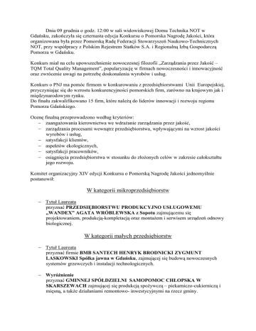 Dnia 09 grudnia o godz. 12:00 w sali widowiskowej Domu Technika NOT w Gdańsku, zakończyła się czternasta edycja Konkursu o Pomorska Nagrodę Jakości, która organizowana była przez Pomorską Radę Federacji Stowarzyszeń Naukowo-Technicznych NOT, przy współpracy z Polskim Rejestrem Statków S.A. i Regionalną Izbą Gospodarczą Pomorza w Gdańsku. Konkurs miał na celu upowszechnienie nowoczesnej filozofii „Zarządzania przez Jakość – TQM Total Quality Management”, popularyzację w firmach nowoczesności i innowacyjność oraz zwrócenie uwagi na potrzebę doskonalenia wyrobów i usług. Konkurs o PNJ ma pomóc firmom w konkurowaniu z przedsiębiorstwami Unii Europejskiej, przyczyniając się do wzrostu konkurencyjności pomorskich firm, zarówno na krajowym jak i międzynarodowym rynku. Do finału zakwalifikowano 15 firm, które należą do liderów innowacji i rozwoju regionu Pomorza Gdańskiego. Ocenę finalną przeprowadzono według kryteriów: − zaangażowania kierownictwa we wdrażanie zarządzania przez jakość, − zarządzania procesami wewnątrz przedsiębiorstwa, wpływającymi na wzrost jakości wyrobów i usług, − satysfakcji klientów, − aspektów ekologicznych, − satysfakcji pracowników, − osiągnięcia przedsiębiorstwa w stosunku do złożonych celów w zakresie całokształtu jego rozwoju. Komitet organizacyjny XIV edycji Konkursu o Pomorską Nagrodę Jakości jednomyślnie postanowił: W kategorii mikroprzedsiębiorstw − Tytuł Laureata przyznać PRZEDSIĘBIORSTWU PRODUKCYJNO USŁUGOWEMU „WANDEX” AGATA WRÓBLEWSKA z Sopotu zajmującemu się projektowaniem, produkcją-kompletacją oraz montażem i serwisem urządzeń odnowy biologicznej. W kategorii małych przedsiębiorstw − Tytuł Laureata przyznać firmie BMB SANTECH HENRYK BRODNICKI ZYGMUNT LASKOWSKI Spółka jawna w Gdańsku, zajmującej się budową nowoczesnych systemów grzewczych i instalacji technologicznych. − Wyróżnienie przyznać GMINNEJ SPÓŁDZIELNI SAMOPOMOC CHŁOPSKA W SKARSZEWACH zajmującej się produkcją spożywczą – piekarniczo-cukierniczą i mięsną, a także działaniami remontowo- inwestycyjnymi na rzecz gminy. W kategorii średnich przedsiębiorstw − Tytuł Laureata przyznać firmie EURO-WENT SPÓŁKA Z OGRANICZONĄ ODPOWIEDZIALNOŚCIĄ ZAKŁAD PRACY CHRONIONEJ W GDAŃSKU zajmującej się produkcją i montażem wentylacji i klimatyzacji, produkcją wkładów kominowych i kominów izolowanych oraz prowadzeniem hurtowni urządzeń i sprzętu. Dwa równorzędne wyróżnienia: − Wyróżnienie przyznać INSPEKCJI WETERYNARYJNEJ, WOJEWÓDZKIEMU INSPEKTORATOWI WETERYNARII W GDAŃSKU, zajmującej się ochroną zdrowia publicznego poprzez zapewnienie bezpieczeństwa produktów pochodzenia zwierzęcego oraz ochroną zdrowia zwierząt. − Wyróżnienie przyznać Firmie MARINEX SPÓŁKA Z OGRANICZONĄ ODPOWIEDZIALNOŚCIĄ PRZEDSIĘBIORSTWO ROBÓT PODWODNYCH I HYDROTECHNICZNYCH W SOPOCIE zajmującej się usługami w sektorze budownictwa specjalistycznego związanego ze środowiskiem wodnym, zwłaszcza morskim. W kategorii dużych przedsiębiorstw: − Tytuł Laureata przyznać PRZEDSIĘBIORSTWU GOSPODARKI KOMUNALNEJ SPÓŁKA Z OGRANICZONĄ ODPOWIEDZIALNOŚCIĄ W SŁUPSKU zajmującemu się głównie ochroną środowiska, gospodarką odpadami oraz kompleksowym sprzątaniem miasta. − Wyróżnienie przyznać Zakładowi STOPOL MALBORK SPÓŁKA Z OGRANICZONĄ ODPOWIEDZIALNOŚCIĄ W MALBORKU zajmującemu się handlem hurtowym i detalicznym wyrobów tytoniowych, artykułów spożywczych, artykułów przemysłowych, higienicznych, papierniczo-szkolnych i innych. Ponadto − Przewodniczący Pomorskiej Rady NOT w Gdańsku ufundował nagrodę dla ZAKŁADU PRODUKCYJNO - USŁUGOWO HANDLOWEGO TEMIS & SPAWMET Z CHOJNIC, zajmującemu się miedzy innymi wytwarzaniem i dystrybucją gazów technicznych, spożywczych i medycznych. − Wojewoda Pomorski ufundował nagrodę dla firmy NFM PRODUCTION SPÓŁKA Z OGRANICZONĄ ODPOWIEDZIALNOŚCIĄ W POTĘGOWIE zajmującej się projektowaniem, produkcją oraz sprzedażą wyrobów tekstylnych i ochronnych o profilu militarnopolicyjnym. − Marszałek Województwa Pomorskiego ufundował nagrodę dla SAMODZIELNEGO PUBLICZNEGO OŚRODKA TERAPII I REHABILITACJI DLA DZIECI W KWIDZYNIE prowadzącego rehabilitację leczniczą dla dzieci z zaburzeniami wieku rozwojowego, świadczącego pomoc dzieciom niepełnosprawnym fizycznie i intelektualnie. − Przewodniczący Sejmiku Województwa Pomorskiego ufundował nagrodę dla przedsiębiorstwa produkcyjno- usługowo- handlowego VISTAL GDYNIA SPÓŁKA AKCYJNA W GDYNI zajmującego się wytwarzaniem i remontem konstrukcji stalowych- mostowych, okrętowych, przemysłowych i innych. − Prezydent Miasta Gdańska ufundował nagrodę dla firmy STABILATOR SPÓŁKA Z OGRANICZONĄ ODPOWIEDZIALNOŚCIĄ Z GDAŃSKA zajmującej się kompleksowym wykonawstwem specjalistycznych usług budowlanych w obszarach ratowania zabytków, fundamentowania inżynierii sanitarnej i hydrotechniki. − Prezydent Regionalnej Izby Gospodarczej Pomorza ufundował nagrodę dla PRZEDSIĘBIORSTWA CEMET LTD. SPÓŁKA Z OGRANICZONĄ ODPOWIEDZIALNOŚCIĄ W GDAŃSKU zajmującego się produkcją urządzeń technicznych na platformy i statki do wydobywania ropy, zbiorniki, części maszyn i chłodnie wody. − Dyrektor Telewizji Polskiej Oddział Gdańsk ufundował nagrodę dla firmy MARINEX SPÓŁKA Z OGRANICZONĄ ODPOWIEDZIALNOŚCIĄ PRZEDSIĘBIORSTWO ROBÓT PODWODNYCH I HYDROTECHNICZNYCH W SOPOCIE zajmującej się usługami w sektorze budownictwa specjalistycznego związanego ze środowiskiem wodnym, zwłaszcza morskim. Uroczystość wręczenia nagród odbyła się 9 grudnia 2010 roku w Sali widowiskowej w Domu Technika NOT w Gdańsku, przy ul. Rajskiej 6. Uświetniona była koncertem fortepianowym znanej pianistki Pani Aleksandry Mozgiel a także wernisażem gdańskiej artystki-plastyk Pani Grażyny Piórko. Kierownik Działu Organizacji