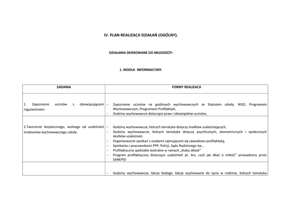 IV. PLAN REALIZACJI DZIAŁAŃ (OGÓLNY). DZIAŁANIA SKIEROWANE DO MŁODZIEŻY: 1. MODUŁ INFORMACYJNY. ZADANIA 1. Zapoznanie regulaminami. uczniów FORMY REALIZACJI z obowiązującymi 2.Tworzenie bezpiecznego, wolnego od uzależnień środowiska wychowawczego szkoły. Zapoznanie uczniów na godzinach wychowawczych ze Statutem szkoły, WSO, Programem Wychowawczym, Programem Profilaktyki, Godziny wychowawcze dotyczące praw i obowiązków uczniów, Godziny wychowawcze, których tematyka dotyczy środków uzależniających, Godziny wychowawcze, których tematyka dotyczy psychicznych, ekonomicznych i społecznych skutków uzależnień, Organizowanie spotkań z osobami zajmującymi się zawodowo profilaktyką, Spotkania z pracownikami PPP, Policji, Sądu Rodzinnego itp., Profilaktyczne spektakle teatralne w ramach „klubu debat” Program profilaktyczny dotyczące uzależnień pt. Ars, czyli jak dbać o miłość” prowadzony przez SANEPID Godziny wychowawcze, lekcje biologii, lekcje wychowania do życia w rodzinie, których tematyka 3.Propagowanie zdrowego stylu życia. 4.Diagnozowanie potrzeb bytowych. 5. Diagnoza zachowań – rozpoznawanie sytuacji ryzykownych. dotyczy okresu dojrzewania, Spotkania z lekarzami i pielęgniarką szkolną, Spotkania z ekspertami w tej dziedzinie, Dyskusje po obejrzeniu filmów na godzinach wychowawczych, Spotkania z pracownikami SANEPID-u na temat HIV-AIDS, Program „Różowa wstążeczka” – profilaktyka raka piersi, Godziny wychowawcze, których tematyka dotyczy zasad właściwego odżywiania (anoreksja, bulimia), Godziny wychowawcze, których tematyka dotyczy higieny pracy umysłowej, Godziny wychowawcze na temat uczenia się, Spotkania z pracownikami PPP, Godziny w bibliotece szkolnej na temat literatury wskazującej techniki uczenia się. Godziny wychowawcze na temat możliwości uzyskania pomocy materialnej, Indywidualne rozmowy z uczniami mające na celu rozpoznawanie sytuacji materialnej uczniów. Nauczyciele i wychowawca prowadzą obserwacje uczniów, Wychowawcy i pedagog rozpoznają sytuację rodzinną młodzieży, Pedagog prowadzi rozmowy z uczniami i wychowawcami. 2. MODUŁ EDUKACYJNY. - Działania zorientowane na osobę i wspieranie jej rozwoju. ZADANIA 1. Kształtowanie i wzmacnianie i realnego poczucia własnej wartości. FORMY REALIZACJI pozytywnego Zajęcia integracyjno – adaptacyjne dla uczniów klas I, Tworzenie okazji do wzajemnego poznania się poprzez imprezy klasowe (dyskoteki, biwaki, wycieczki, Andrzejki, wigilie klasowe itp.), 2.Przeciwdziałanie sytuacjom stresowym. Ustalenie z klasą kontraktu, który uwzględnia zasady obowiązujące obie strony: uczeń – nauczyciel, Ankiety adaptacyjne dla uczniów klas I przeprowadzone przez wychowawców, których wyniki pozwolą na bliższe poznanie uczniów i ich zainteresowań Pomoc koleżeńska w nauce, Indywidualna pomoc i opieka nad uczniami posiadającymi opinię z PPP, Godziny wychowawcze dotyczące asertywności i radzenia sobie w sytuacjach trudnych, Indywidualne rozmowy pedagoga z uczniami, mające na celu rozładowanie napięcia emocjonalnego, powstałego na tle niepowodzeń szkolnych, konfliktów z rodzicami lub rówieśnikami, Program radzenia sobie ze stresem dla uczniów przystępujących do egzaminu zawodowego pt. „Stres pod kontrolą”. 3.Kształtowanie umiejętności pracy w grupie. 4. Prowadzenie edukacji anty-uzależnieniowej. Zajęcia z zakresu: poszanowania odmienności, komunikacji werbalnej i pozawerbalnej, Program „W zgodzie ze sobą i z grupą”. Godziny wychowawcze, lekcje biologii i chemii, których tematyka dotyczy uzależnień, Opracowanie z udziałem całej społeczności szkolnej zasad i reguł dotyczących zakazu spożywania alkoholu na terenie szkoły, na wycieczkach oraz imprezach organizowanych przez szkołę oraz konsekwencji wynikających z ich nie przestrzegania, Projekcje filmów o tematyce profilaktycznej, Profilaktyczne spektakle teatralne, Gazetki ścienne, Ulotki, Włączenie się w ogólnopolskie akcje prozdrowotne, np. „Dzieci bez papierosa” i inne, Wywiadówki profilaktyczne dla rodziców. - Działania zorientowane na właściwy wybór ZADANIA FORMY REALIZACJI 1. Kształtowanie asertywnych postaw. Godziny wychowawcze, na których podejmowana jest tematyka asertywności, Realizacja na godzinach wychowawczych tematów dotyczących systemu wartości i kształtowania charakteru, Poprzez analizą postaw życiowych bohaterów literackich kształtować bądź korygować postawy moralne i myślenie wartościujące uczniów. 2. Zapoznanie z zasadami skutecznej komunikacji. Program „W zgodzie ze sobą i z grupą”, Godziny wychowawcze, których tematyka dotyczy komunikacji werbalnej i pozawerbalnej. 3. Kształtowanie pozytywnego obrazu siebie. Godziny wychowawcze, na których podejmowana jest tematyka dotycząca samooceny i poczucia własnej wartości, Promowanie sukcesów młodzieży (artystycznych, naukowych, sportowych itp.) poprzez pochwały i nagrody, Wdrażanie uczniów do systematycznej pracy nad sobą i samowychowania. 4. Profilaktyka chorób XXI wieku. Spotkania z lekarzami różnych specjalności, Omawianie tematyki dbałości o zdrowie na godzinach wychowawczych, lekcjach biologii, wychowania fizycznego, Gazetki ścienne i ulotki, Udział w ogólnopolskich akcjach prozdrowotnych. - Kształtowanie dojrzałej postawy wobec życia ZADANIA FORMY REALIZACJI 1. Kształtowanie odpowiedzialności za siebie i innych za podejmowane decyzje i zachowania. Godziny wychowawcze, których tematyka dotyczy właściwych wyborów, Działalność uczniów w organizacjach uczniowskich, Godziny wychowawcze i lekcje religii, których tematyka dotyczy hierarchii wartości i ideałów, Dyskusje na języku polskim o wzorcach osobowych i literaturze, filmie, sztuce teatralnej itp. 2. Szerzenie wśród młodzieży znajomości prawa i wyrabianie nawyku poszanowania go. Spotkania z prawnikiem, Spotkania z policją, Godziny wychowawcze, których tematyka