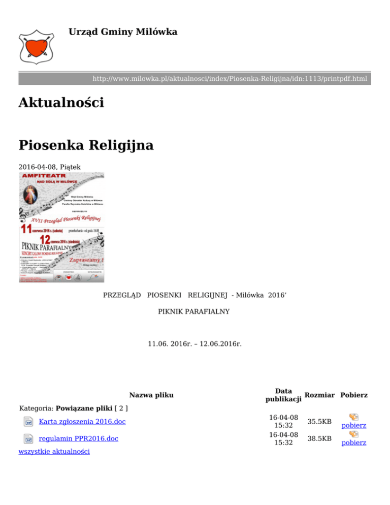 Urząd Gminy Milówka http://www.milowka.pl/aktualnosci/index/Piosenka-Religijna/idn:1113/printpdf.html Aktualności Piosenka Religijna 2016-04-08, Piątek PRZEGLĄD PIOSENKI RELIGIJNEJ - Milówka 2016’ PIKNIK PARAFIALNY 11.06. 2016r. – 12.06.2016r. Nazwa pliku Data Rozmiar Pobierz publikacji Kategoria: Powiązane pliki [ 2 ] Karta zgłoszenia 2016.doc regulamin PPR2016.doc wszystkie aktualności 16-04-08 15:32 16-04-08 15:32 35.5KB 38.5KB pobierz pobierz