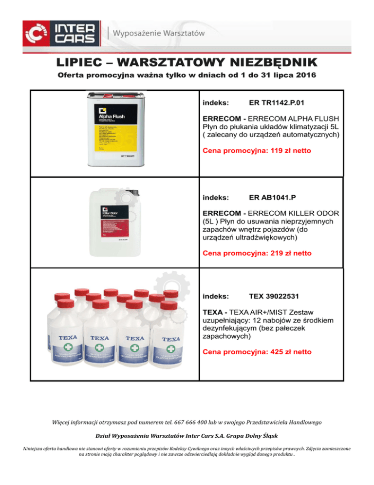LIPIEC – WARSZTATOWY NIEZBĘDNIK Oferta promocyjna ważna tylko w dniach od 1 do 31 lipca 2016 indeks: ER TR1142.P.01 ERRECOM - ERRECOM ALPHA FLUSH Płyn do płukania układów klimatyzacji 5L ( zalecany do urządzeń automatycznych) Cena promocyjna: 119 zł netto indeks: ER AB1041.P ERRECOM - ERRECOM KILLER ODOR (5L ) Płyn do usuwania nieprzyjemnych zapachów wnętrz pojazdów (do urządzeń ultradźwiękowych) Cena promocyjna: 219 zł netto indeks: TEX 39022531 TEXA - TEXA AIR+/MIST Zestaw uzupełniający: 12 nabojów ze środkiem dezynfekującym (bez pałeczek zapachowych) Cena promocyjna: 425 zł netto Więcej informacji otrzymasz pod numerem tel. 667 666 400 lub w swojego Przedstawiciela Handlowego Dział Wyposażenia Warsztatów Inter Cars S.A. Grupa Dolny Śląsk Niniejsza oferta handlowa nie stanowi oferty w rozumieniu przepisów Kodeksy Cywilnego oraz innych właściwych przepisów prawnych. Zdjęcia zamieszczone na stronie mają charakter poglądowy i nie zawsze odzwierciedlają dokładnie wygląd danego produktu . LIPIEC – WARSZTATOWY NIEZBĘDNIK Oferta promocyjna ważna tylko w dniach od 1 do 31 lipca 2016 indeks: 0XAT3012 PROFITOOL - Uniwersalny zestaw adapterów do klimatyzacji; 1/4" X 3/16", GM FLEX; 1/4" X 1/8" FORD FLEX; 1/4" X 1/4", 1/4" X 3/16", GM 1991 Cena promocyjna: 270 zł netto indeks: LENA 334542 LENA - LENA lampa warsztatowa do wykrywania nieszczelności UV+okulary, Bardzo Mocna, 1W, baterie 3x AAA, IP65 Cena promocyjna: 79 zł netto indeks: 0XAT3043/P PROFITOOL - Zestaw do wymiany zaworków klimatyzacji R12a/R134a. Zawartość: 46 elementów Cena promocyjna: 49 zł netto indeks: 0XAT3029A PROFITOOL - Zestaw oringów i sprężyn pierścieniowych do klimatyzacji AC Cena promocyjna: 25 zł netto Więcej informacji otrzymasz pod numerem tel. 667 666 400 lub w swojego Przedstawiciela Handlowego Dział Wyposażenia Warsztatów Inter Cars S.A. Grupa Dolny Śląsk Niniejsza oferta handlowa nie stanowi oferty w rozumieniu przepisów Kodeksy Cywilnego oraz innych właściwych przepisów prawnych. Zdjęcia zamieszczone na stronie mają charakter poglądowy i nie zawsze odzwierciedlają dokładnie wygląd danego produktu .