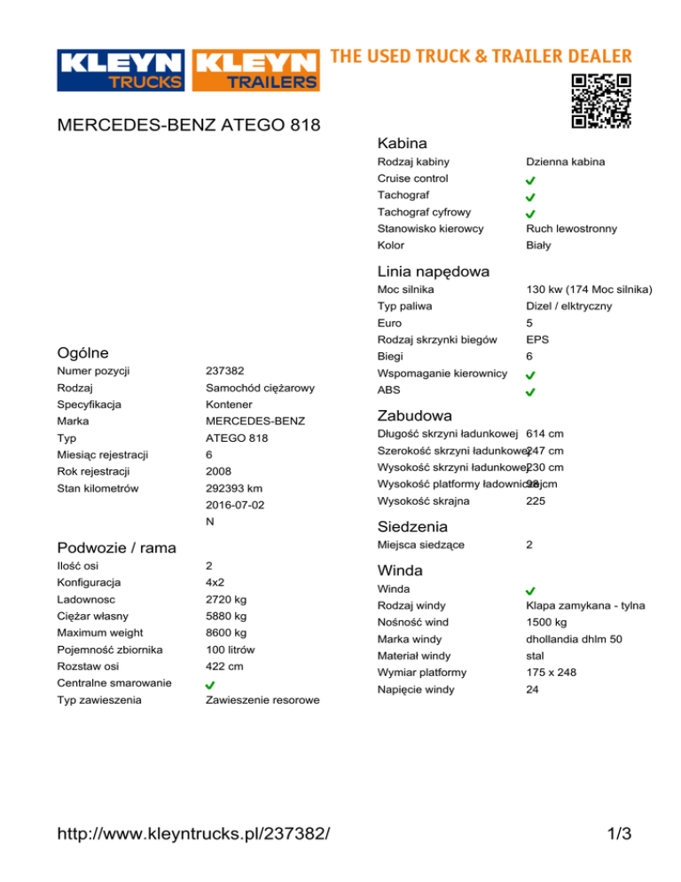 MERCEDES-BENZ ATEGO 818 Kabina Rodzaj kabiny Dzienna kabina Cruise control Tachograf Tachograf cyfrowy Stanowisko kierowcy Ruch lewostronny Kolor Biały Linia napędowa Ogólne Moc silnika 130 kw (174 Moc silnika) Typ paliwa Dizel / elktryczny Euro 5 Rodzaj skrzynki biegów EPS Biegi 6 Numer pozycji 237382 Wspomaganie kierownicy Rodzaj Samochód ciężarowy ABS Specyfikacja Kontener Marka MERCEDES-BENZ Zabudowa Typ ATEGO 818 Długość skrzyni ładunkowej 614 cm Miesiąc rejestracji 6 Szerokość skrzyni ładunkowej247 cm Rok rejestracji 2008 Wysokość skrzyni ładunkowej230 cm Stan kilometrów 292393 km Wysokość platformy ładowniczej 98 cm 2016-07-02 Wysokość skrajna N Siedzenia Miejsca siedzące Podwozie / rama Ilość osi 2 Konfiguracja 4x2 Ladownosc 2720 kg Ciężar własny 5880 kg Maximum weight 8600 kg Pojemność zbiornika 100 litrów Rozstaw osi 422 cm Centralne smarowanie Typ zawieszenia 225 2 Winda Winda Rodzaj windy Klapa zamykana - tylna Nośność wind 1500 kg Marka windy dhollandia dhlm 50 Materiał windy stal Wymiar platformy 175 x 248 Napięcie windy 24 Zawieszenie resorowe http://www.kleyntrucks.pl/237382/ 1/3 MERCEDES-BENZ ATEGO 818 Ilość osi mm mm Hamulce tarczowe Rodzaj osi skrętnej Mechaniczne Typ zawieszenia Zawieszenie resorowe Wymiar opony 235/75R17,5 Oś skrętna Raport inspekcji Tachograf Kody wyświetlacza Elektryczny Kolumna kierownicу Resory mm mm Hamulce tarczowe Typ zawieszenia Zawieszenie resorowe Wymiar opony 235/75R17,5 Rama Idealny/nowy Hamulce Bardzo dobry Silnik - całość Rozsądny Stan Układ chłodzenia Akceptowalny Układ paliwowy Nie spełnia wymagań Układ wydechowy Układ smarowania Skrzynka biegów Sprzęgło Napęd Obsługa Układ Opony http://www.kleyntrucks.pl/237382/ 2/3 MERCEDES-BENZ ATEGO 818 http://www.kleyntrucks.pl/237382/ 3/3
