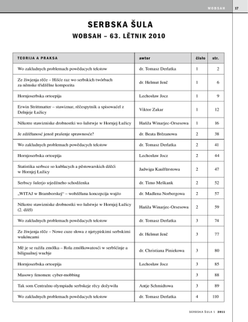 W OB S AH Serbsk a šul a Wobsah – 63. lě tnik 2010 Teorija a praksa awtor čisło str. Wo zakładnych problemach powědacych tekstow dr. Tomasz Derlatka 1 2 Ze žiwjenja rěče – Hišće raz wo serbskich twórbach za němske třidźělne kompozita dr. Helmut Jenč 1 6 Hornjoserbska ortoepija Lechosław Jocz 1 9 Erwin Strittmatter – stawiznar, rěčespytnik a spisowaćel z Delnjeje Łužicy Viktor Zakar 1 12 Někotre stawizniske drobnostki wo šulstwje w Hornjej Łužicy Hańža Winarjec-Orsesowa 1 16 Je zdźěłanosć jenož prašenje sprawnosće? dr. Beata Brězanowa 2 38 Wo zakładnych problemach powědacych tekstow dr. Tomasz Derlatka 2 41 Hornjoserbska ortoepija Lechosław Jocz 2 44 Statistika serbsce so kubłacych a pěstowarskich dźěći w Hornjej Łužicy Jadwiga Kaulfürstowa 2 47 Serbscy šulerjo srjedźneho schodźenka dr. Timo Meškank 2 52 „WITAJ w Bramborskej“ – wobźěłana koncepcija wujźo dr. Madlena Norbergowa 2 57 Někotre stawizniske drobnostki wo šulstwje w Hornjej Łužicy (2. dźěl) Hańža Winarjec-Orsesowa 2 59 Wo zakładnych problemach powědacych tekstow dr. Tomasz Derlatka 3 74 Ze žiwjenja rěče – Nowe cuze słowa z njetypiskimi serbskimi wukóncami dr. Helmut Jenč 3 77 Mě je se raźiła zmólka – Rola zmólkowatosći w serbšćinje a biligualnej wucbje dr. Christiana Piniekowa 3 80 Hornjoserbska ortoepija Lechosław Jocz 3 85 3 88 Masowy fenomen: cyber-mobbing Tak som Centralnu olympiadu serbskeje rěcy dožywiła Antje Schmidtowa 3 89 Wo zakładnych problemach powědacych tekstow dr. Tomasz Derlatka 4 110 s e r b s k a š u l a 1 2 011 17 18 w t eoobrsiajha a p r a k s a Hornjoserbska ortoepija Lechosław Jocz 4 113 Dokumentacija rěčneho wuwića serbšćinu wuknjacych pěstowarskich dźěći dr. Beata Brězanowa/ Jadwiga Kaulfürstowa 4 117 Wo změnach w powołanju wučerja prof. dr. dr. habil. Jürgen Schäfer 4 120 Nowy wučbny material za šulske lěto 2010/11 Annett Dźědźikowa 3 91 Nowe dźěłowe zešiwki za 1. lětnik Annett Dźědźikowa 3 91 Ja tu sym – Wučbnica nabožiny za 4. lětnik Daniela Heelemanowa 3 92 Mein sorbisches Computerbildwörterbuch Daniela Heelemanowa 3 93 Saperliška – Praj to hinak! Lubina HajdukVeljkovićowa 3 93 Drogi licenja 4 Ingrid Hustetowa 3 94 Nowy Trojozynk 5/6 Daniela Heelemanowa 3 94 Naša maćeršćina 6 Marja Hrjehorjowa / dr. Jana Šołćina 3 95 Serbske stawizny 1 Ludwig Zahrodnik 3 98 Wuknu serbsce 7 Měrana Cušcyna 3 99 Biologija plus 5 a Biologija plus 6 Bianka Wjeńcyna 3 100 Nowa čitanka za 9. a 10. lětnik Felicitas Kralowa 3 100 Domizna a swět 10 Janina Krygarjowa 3 102 Terra 10 gymnazij Sakska Bianka Wjeńcyna 3 103 Dodawk k „Trojozynkej 5/6“ Daniela Heelemanowa 4 127 „Sedmy rapak“ jako siluetowoanimaciski film Rafael Wowčer 4 128 Nowa cejdejka z lyriskimi tekstami Měrana Cušcyna 4 129 Naše puće – naše šćežki Jurij J. Šołta 4 130 nowe materialije s e r b s k a š u l a 1 2 011 n o w e m a t e rwioablsi aj he rozpr awa Prědne dolnoserbske rěcne lěgwo w Jarješku Marcus Kóńcaŕ 1 22 Tež Polacy dyrbjachu so přećiwo germanizowanju wobarać Ludwig Zahrodnik 1 24 Mała abo regionalna olympiada w serbskej rěcy w Dolnej Łužycy Katrin Šwjelina 2 62 Kubłanska jězba bě ćělne wokřewjenje a duchowne wobohaćenje Ludwig Zahrodnik 3 104 Serbscy wučerjo a nacistiska strona NSDAP Mikławš Krawc 4 132 Rekcija werbow dr. Hync Rychtaŕ 1 25 Dźěło ze słownikom (2. dźěl) Rejzka Deleńkec 1 27 Prawe słowo k wobrazej Simona Ćěslina 2 63 Słowa k wěstym temam namakać Rejzka Deleńkec 2 64 Posesiwy w hornjoserbšćinje dr. Hync Rychtaŕ 2 68 Pismikowy diktat Simona Ćěslina 4 135 Słowne hódančko Simona Ćěslina 4 136 Krótkodźěło Kerstin Kaline 4 138 Transitiwne a intransitiwne werby dr. Hync Rychtaŕ 4 139 Žarujemy wo Horsta Petrika Jadwiga Gerberichowa 1 33 Měrćin Nowak-Njechorński – serbski moler a spisowaćel prof. dr. Dietrich Šołta 2 70 Žarujemy wo Gerata Nagoru Ingrid Hustetowa 4 141 z a kopěrowanje spominamy s e r b s k a š u l a 4 2 010 19 20 wo w b se a m hat e r i a l i je n recensija Paradiz – Roman serbskeje swójby Monika Gerdesowa 1 34 Z labyrinta serbšćiny. Bjesady wo rěči. dr. Timo Meškank 3 105 Powěsće z RCW 1 34 Powěsće z RCW 2 71 Powěsće z RCW 3 107 Powěsće z RCW 4 142 1 17 powěsće wobsah Serbska šula – 62. lětnik 2009 s e r b s k a š u l a 1 2 011